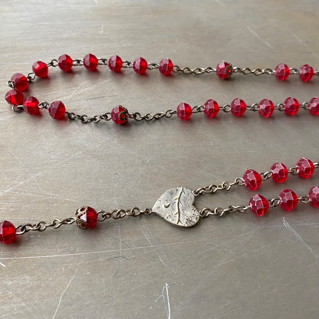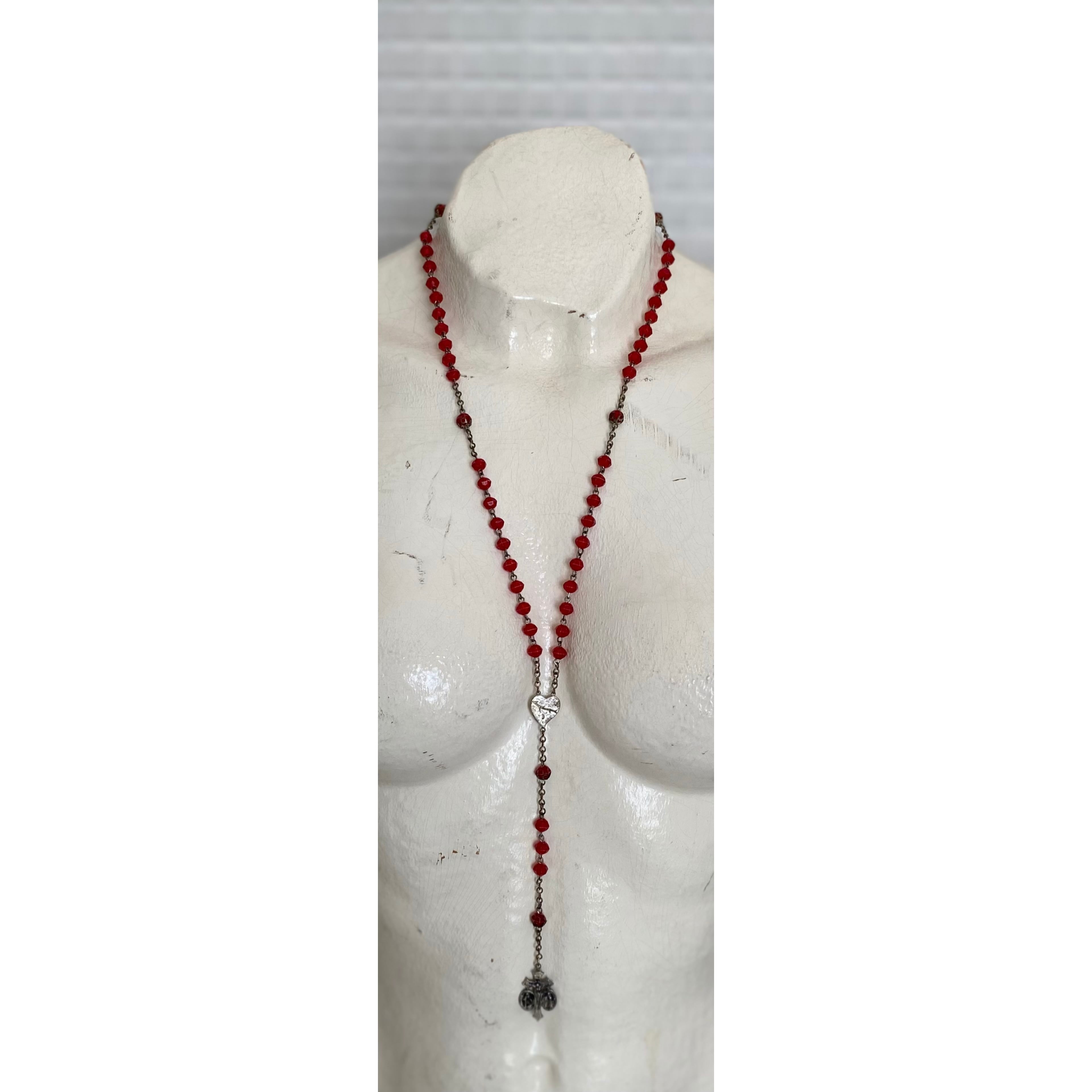 レトロな雰囲気のUSAヴィンテージロザリオネックレス。中央にはハート、先端にはクロスのパーツが留められています。真っ赤なビーズがスタイリングの差し色にぴったり。古着やカジュアルなスタイルにもオススメです。