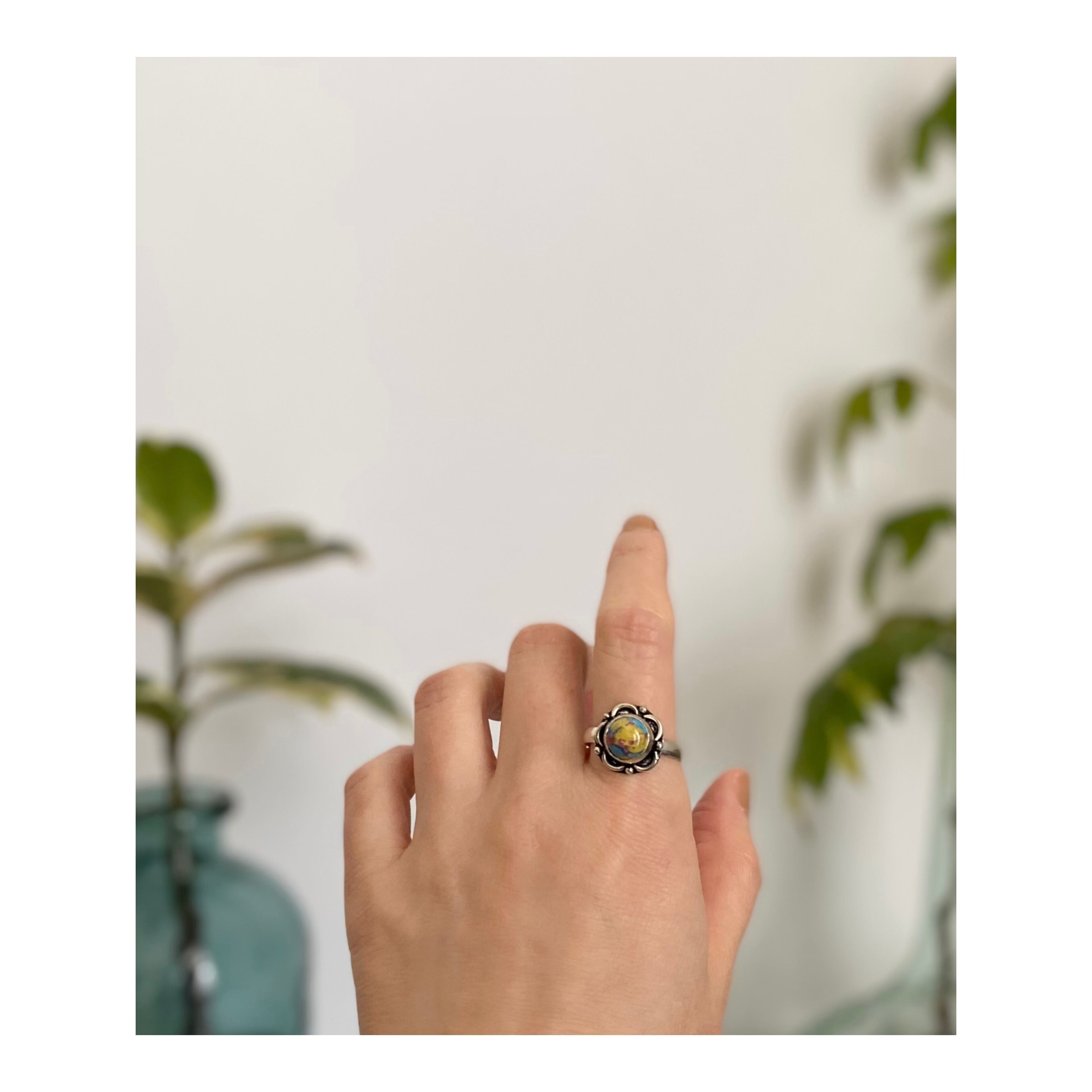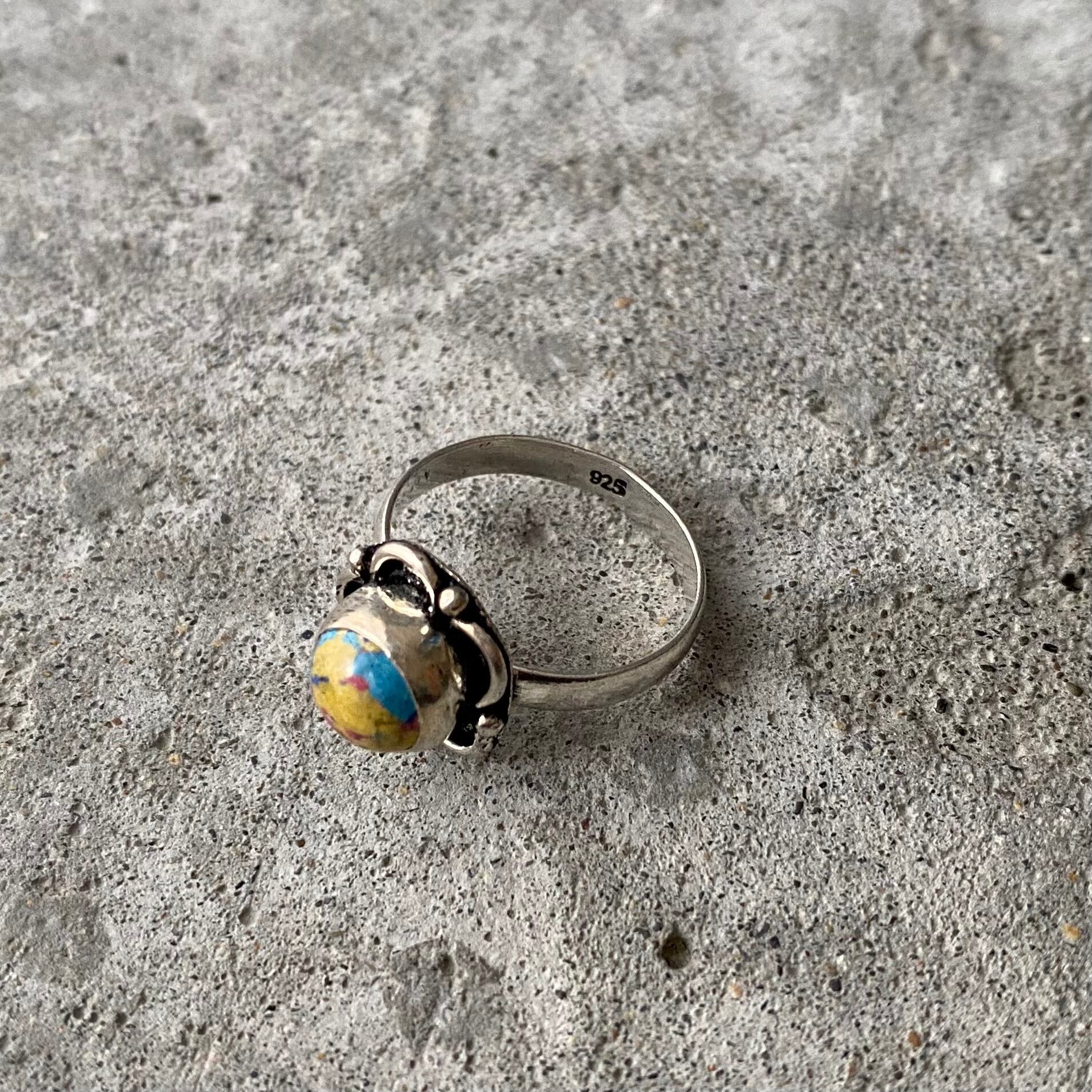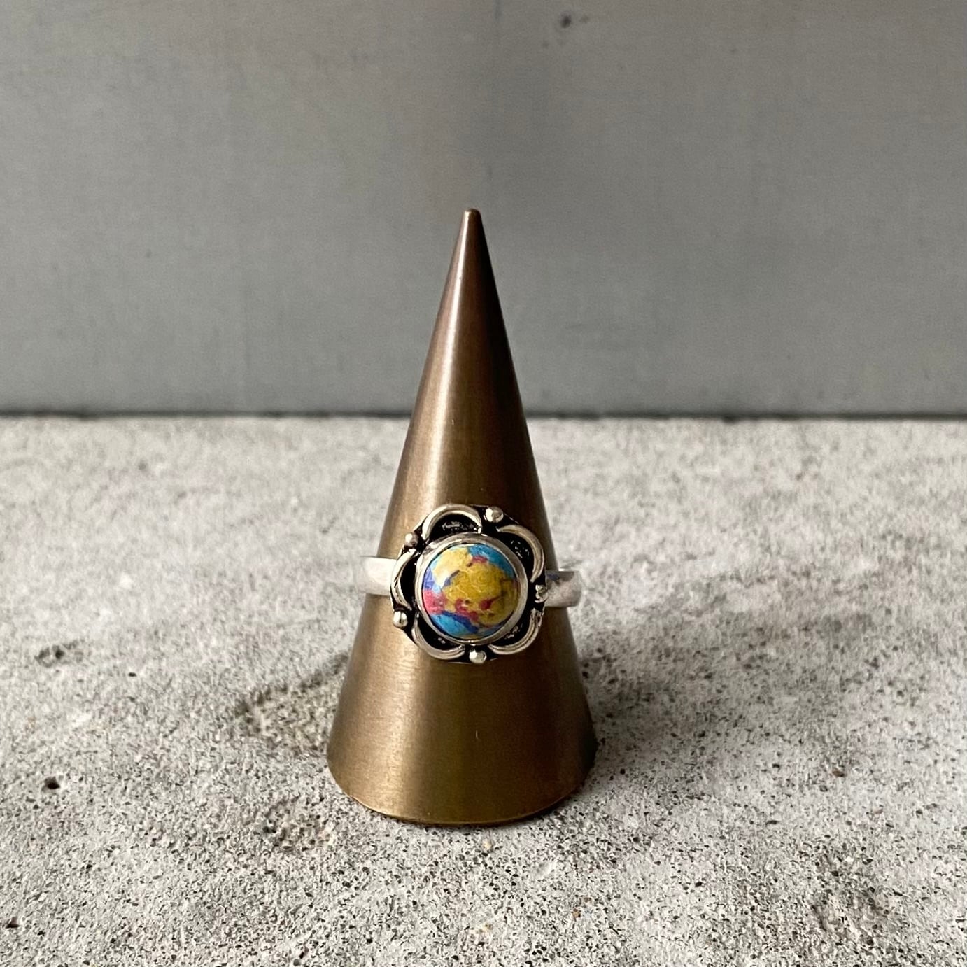アーティスティックな雰囲気のストーンリング。カラフルな色合いと身につけやすいサイズ感がポイント。古着やユニセックスなスタイルにもおすすめです。
