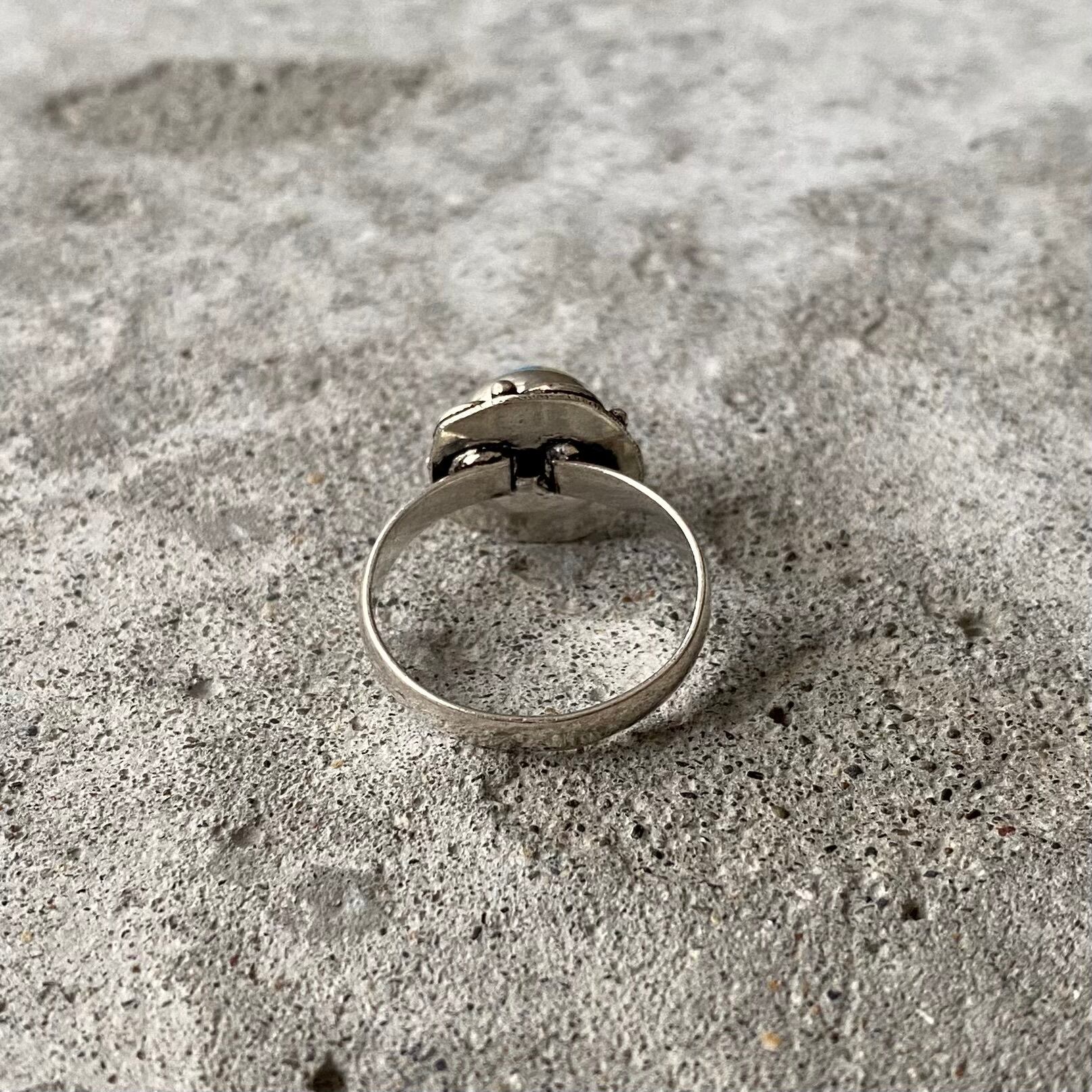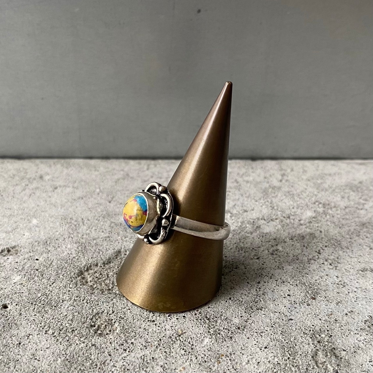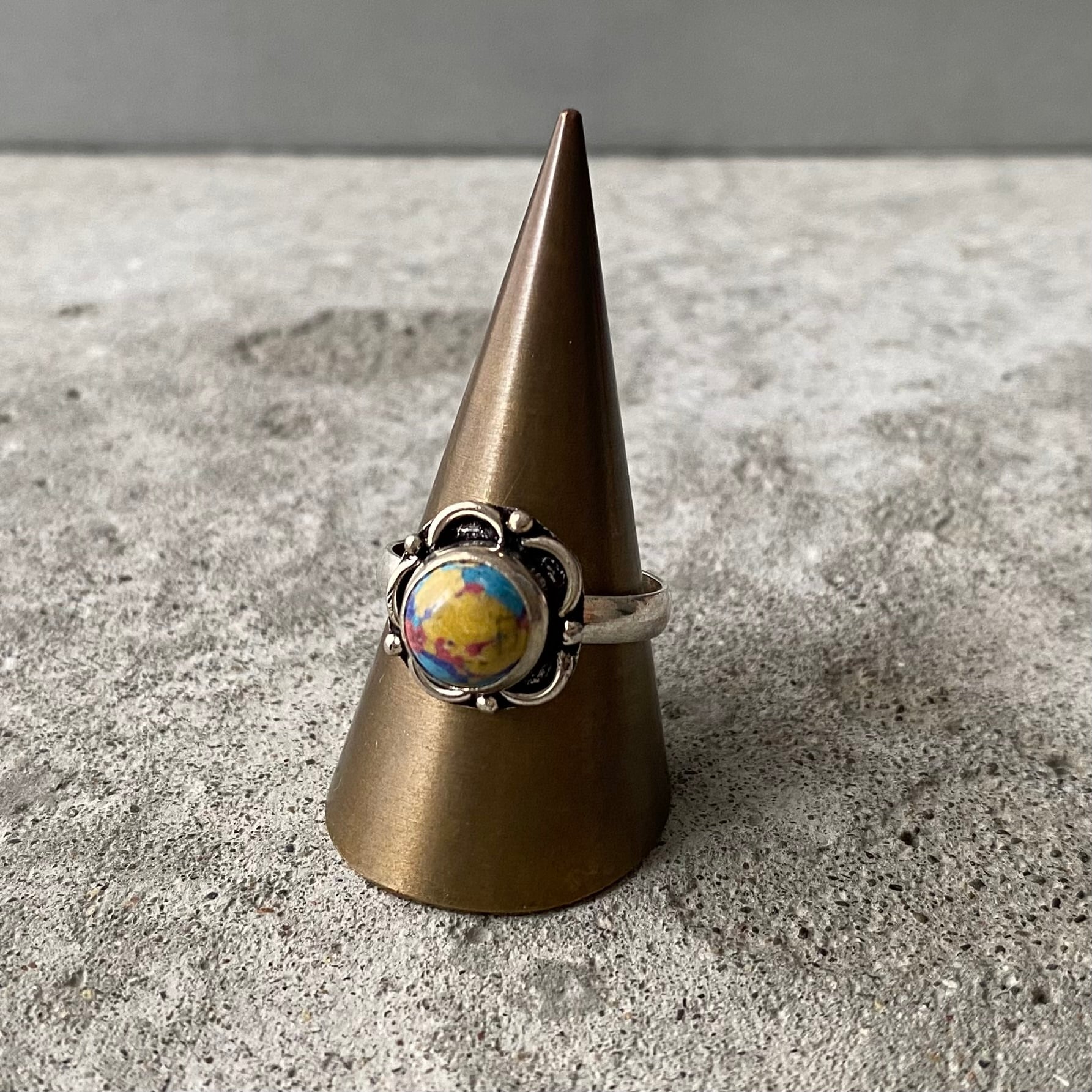 アーティスティックな雰囲気のストーンリング。カラフルな色合いと身につけやすいサイズ感がポイント。古着やユニセックスなスタイルにもおすすめです。