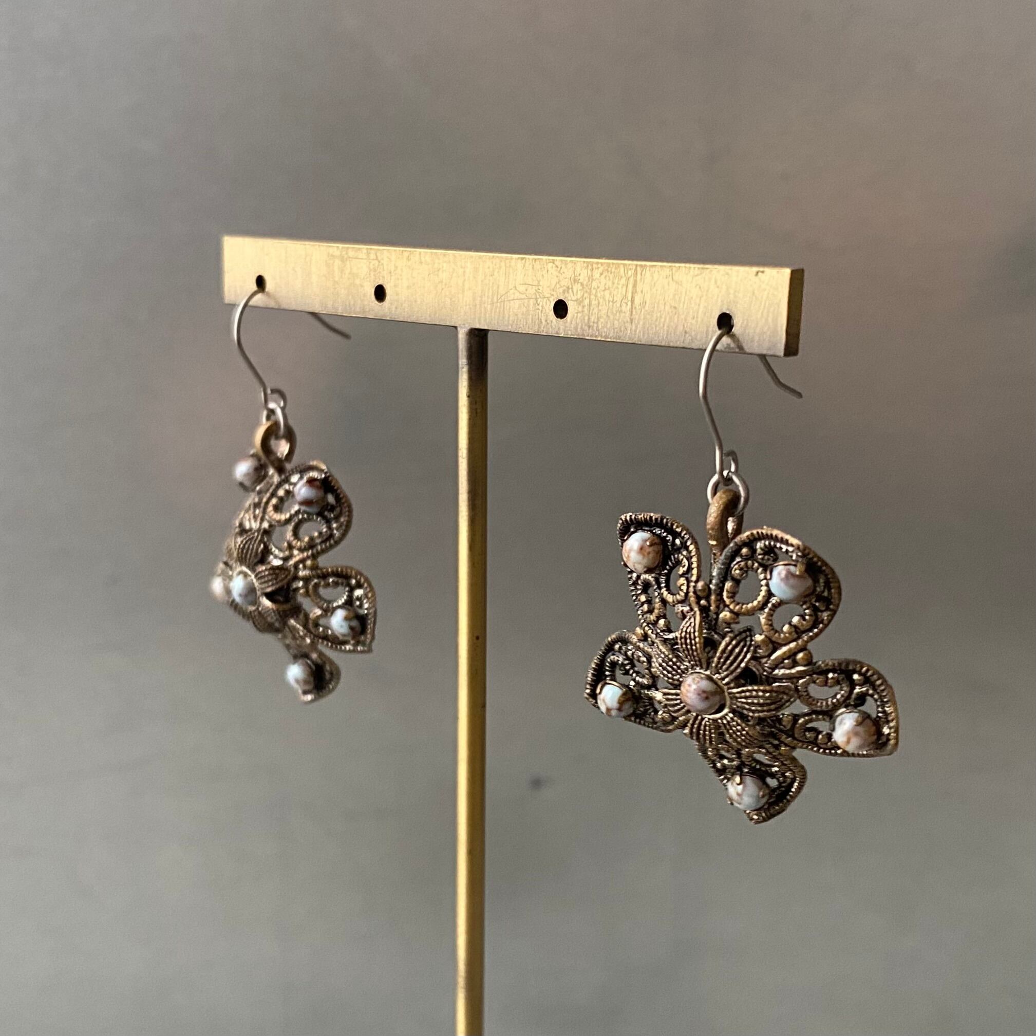 繊細な透かしのフラワーパーツに小さなストーンが映えるヴィンテージピアス。軽やかな着け心地で、古着やレトロコーデにもおすすめです。