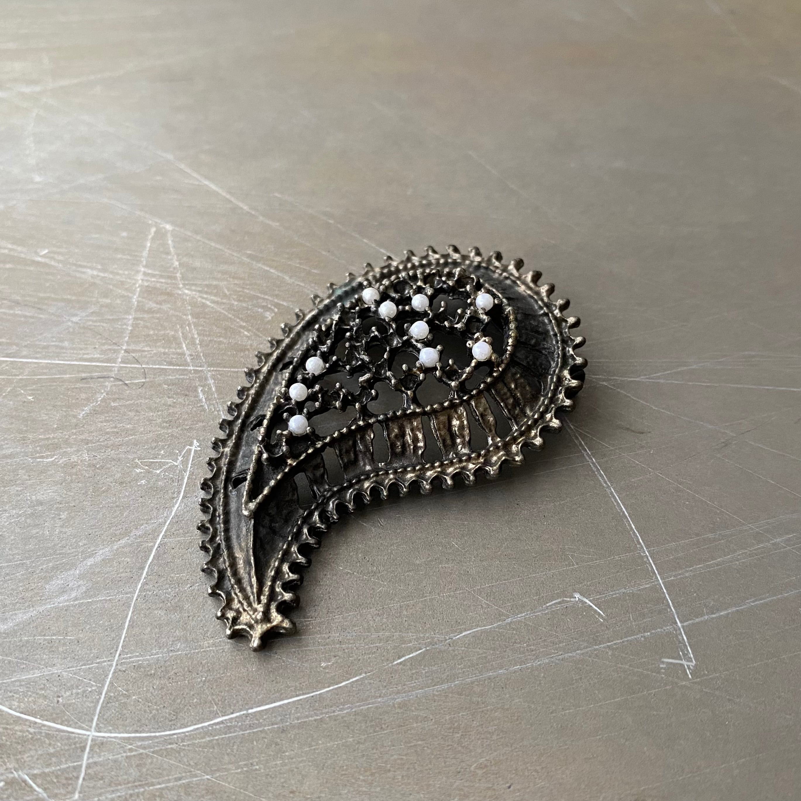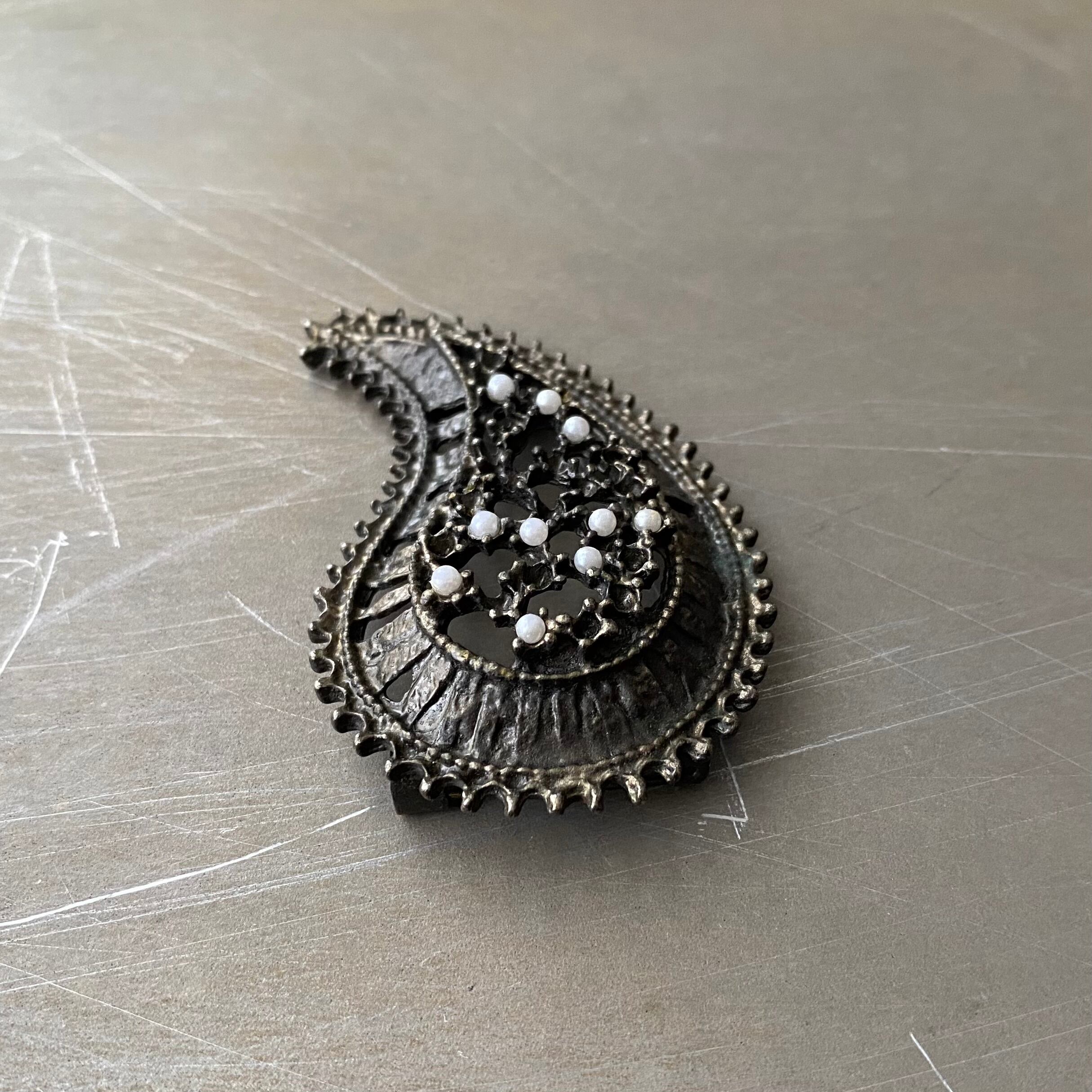 繊細なパールが留められたペイズリーデザインのヴィンテージブローチ。大ぶりで存在感がありジャケットやストール等のアクセントにおすすめです。