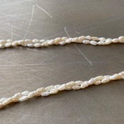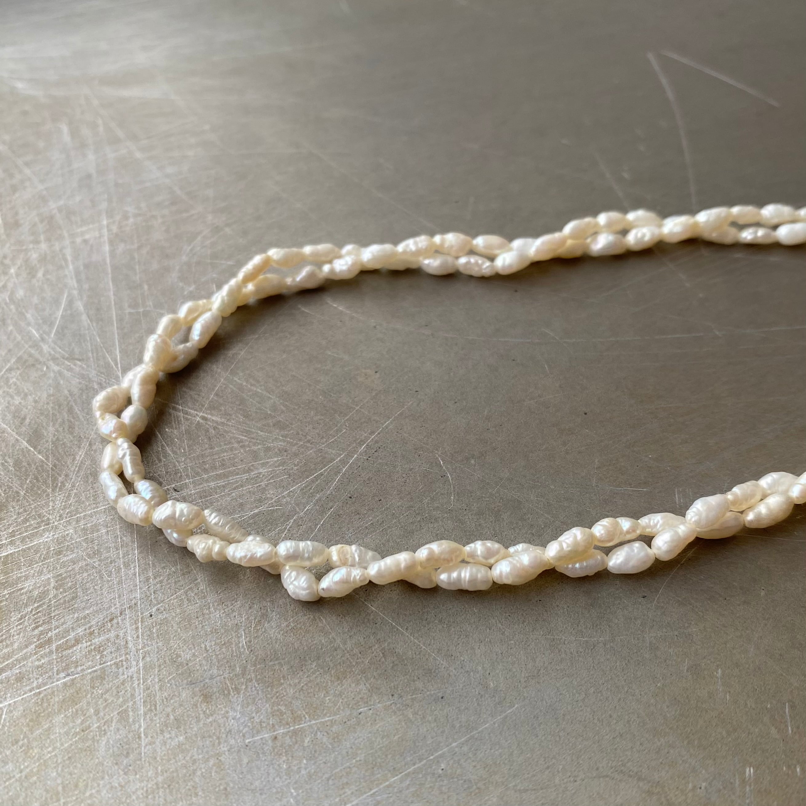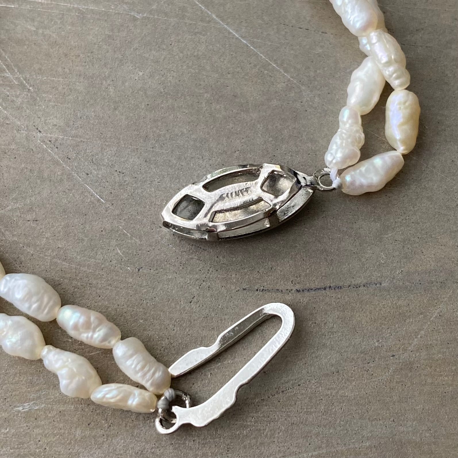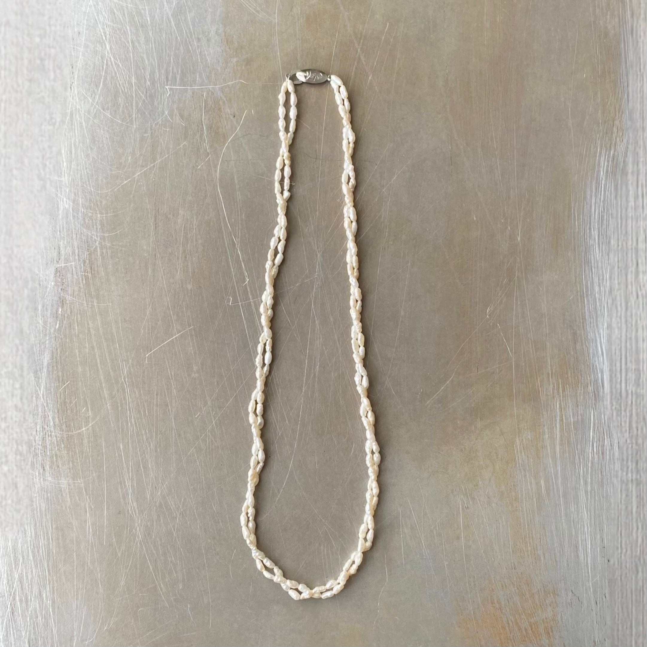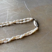 ふぞろいな形の繊細な淡水パールが魅力的なヴィンテージネックレス。彫り模様の入ったレトロなシルバー製の金具も素敵なポイント。パールはスタイリングに合わせてひねり具合を調節していただけます。パーティーシーンからカジュアルなスタイルまで幅広く合わせていただけるアイテムです。