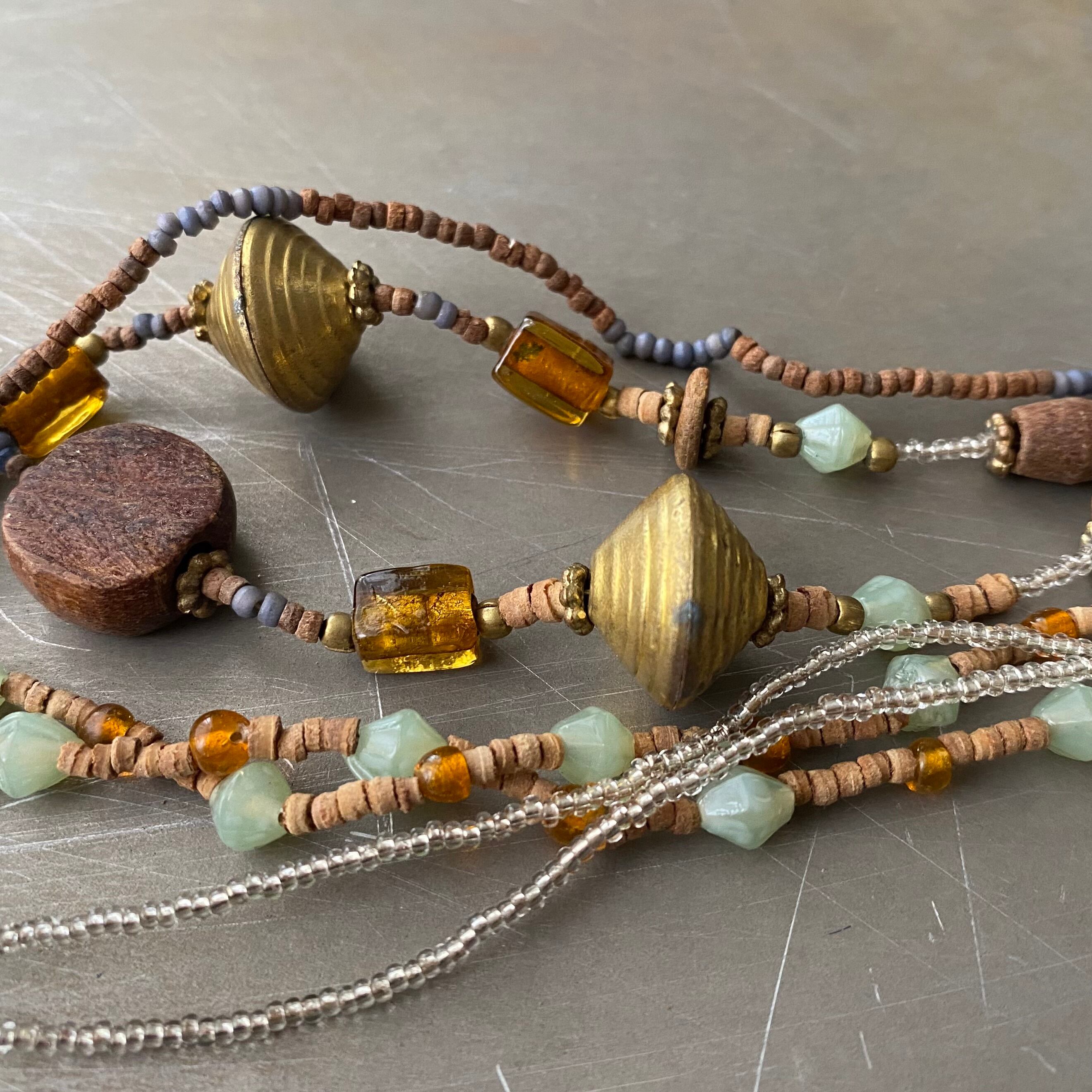 ガラスやウッドなど色とりどりのビーズが魅力的なボヘミアンな雰囲気のヴィンテージネックレス。ボリューム感がありお顔まわりを明るく彩ってくれます。