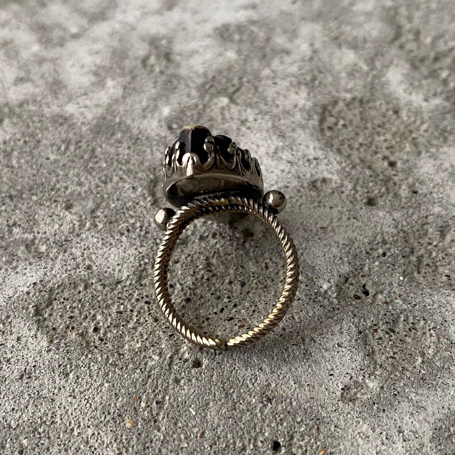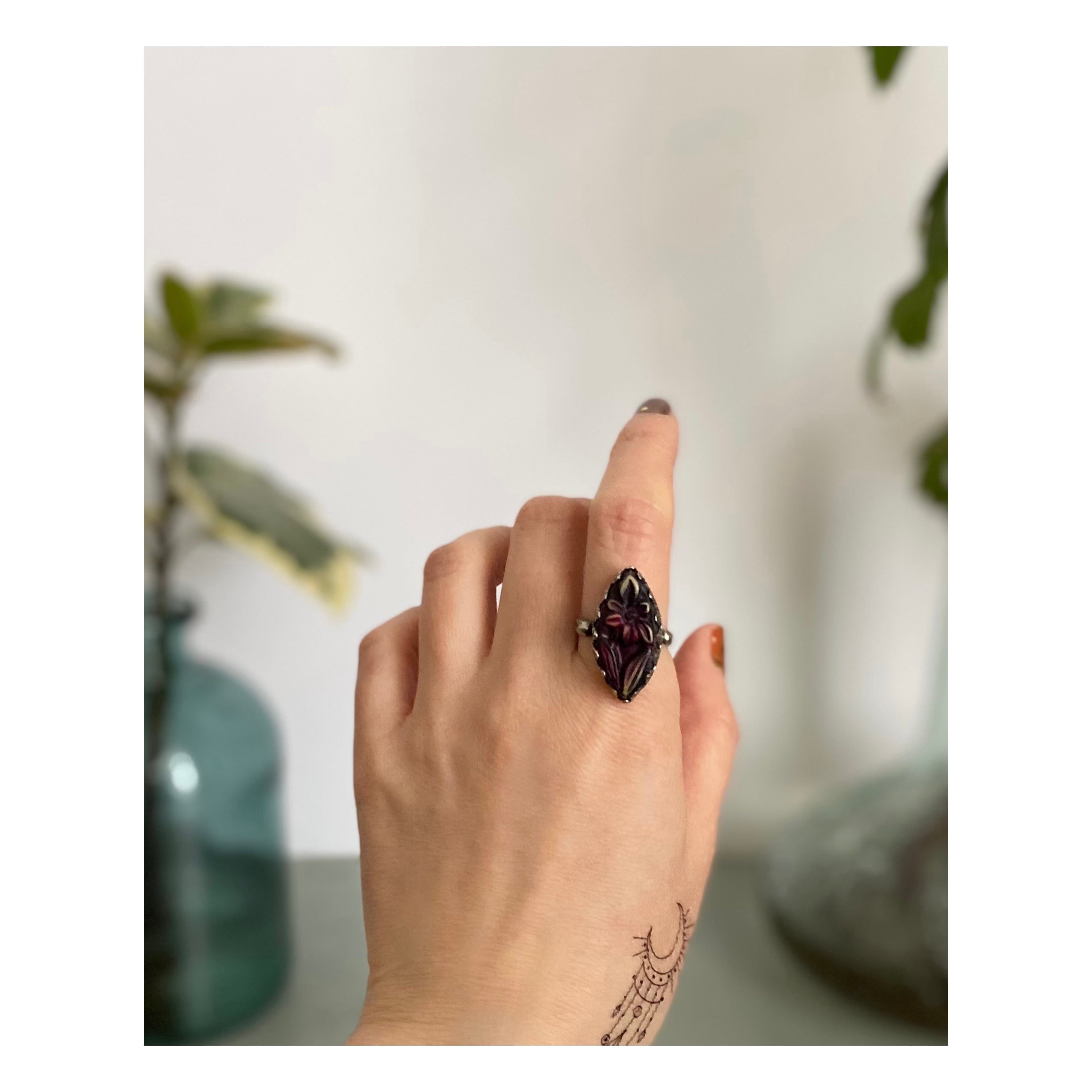 フラワー模様に彫られた個性的なストーンが魅力的なヴィンテージリング。コーディネートに取り入れやすい落ち着いた色合いで様々なスタイルに合わせていただけます。