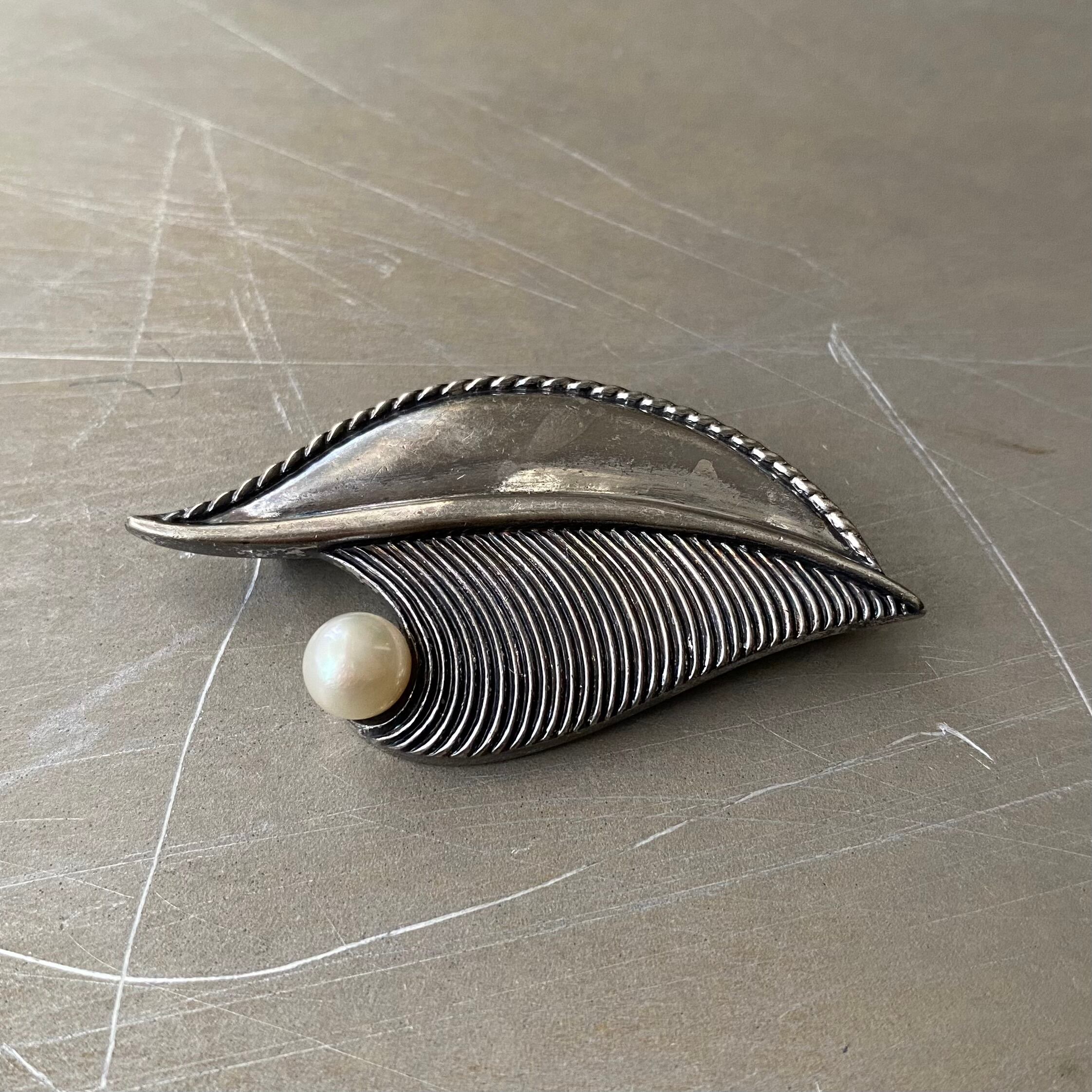 パールが輝くクラシカルなリーフモチーフのヴィンテージブローチ。身につけやすいサイズ感でジャケットやストール等のアクセントにおすすめです。