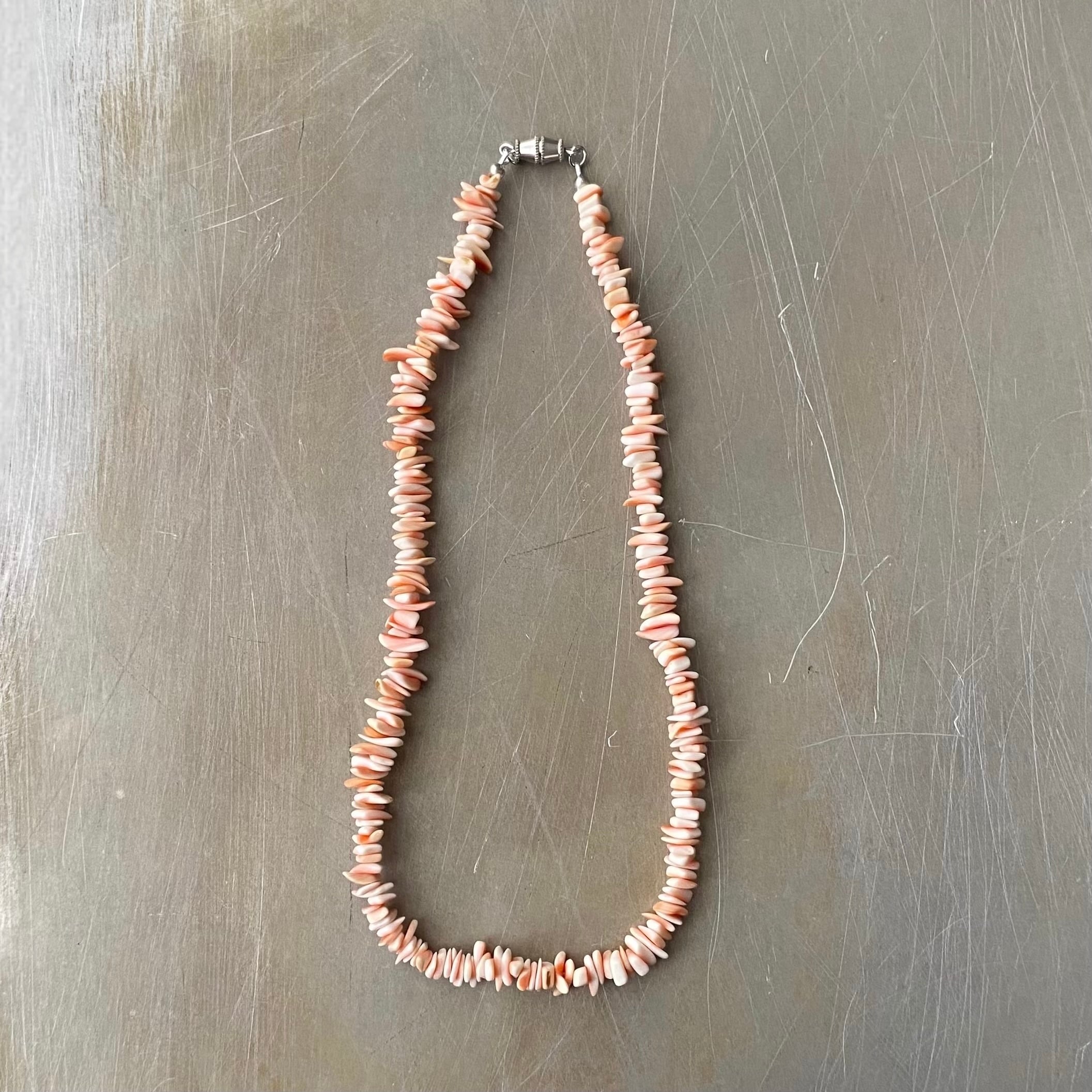 優しいピンク色のシェルが魅力的なヴィンテージネックレス。「コンクシェル」は持ち主を癒し、女性的な魅力を引き出してくれると言い伝えられています。コーディネートに取り入れやすいデザインでお顔まわりを明るい雰囲気にしてくれます。