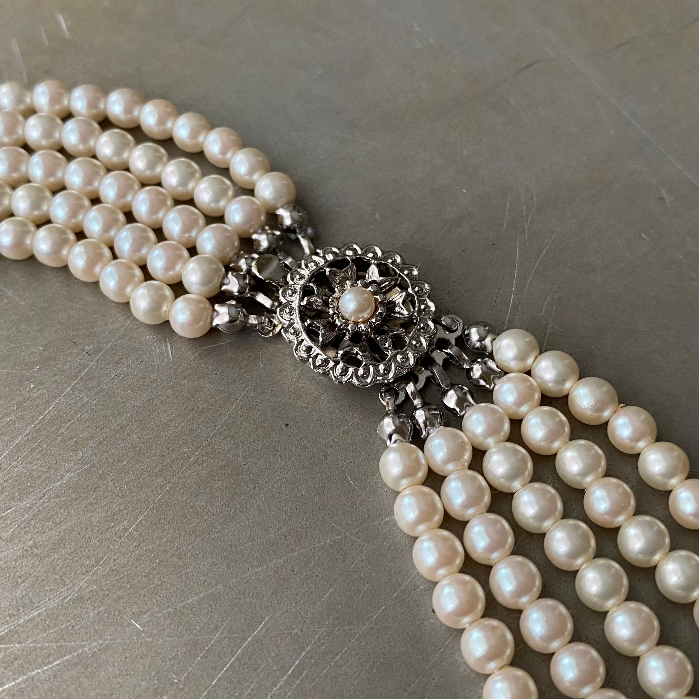 クラシカルな雰囲気のロングパールが魅力的なヴィンテージネックレス。レトロなデザインの金具も魅力的。ボリューム感のある5連タイプでスタイリングに華やかな雰囲気をプラスしてくれます。