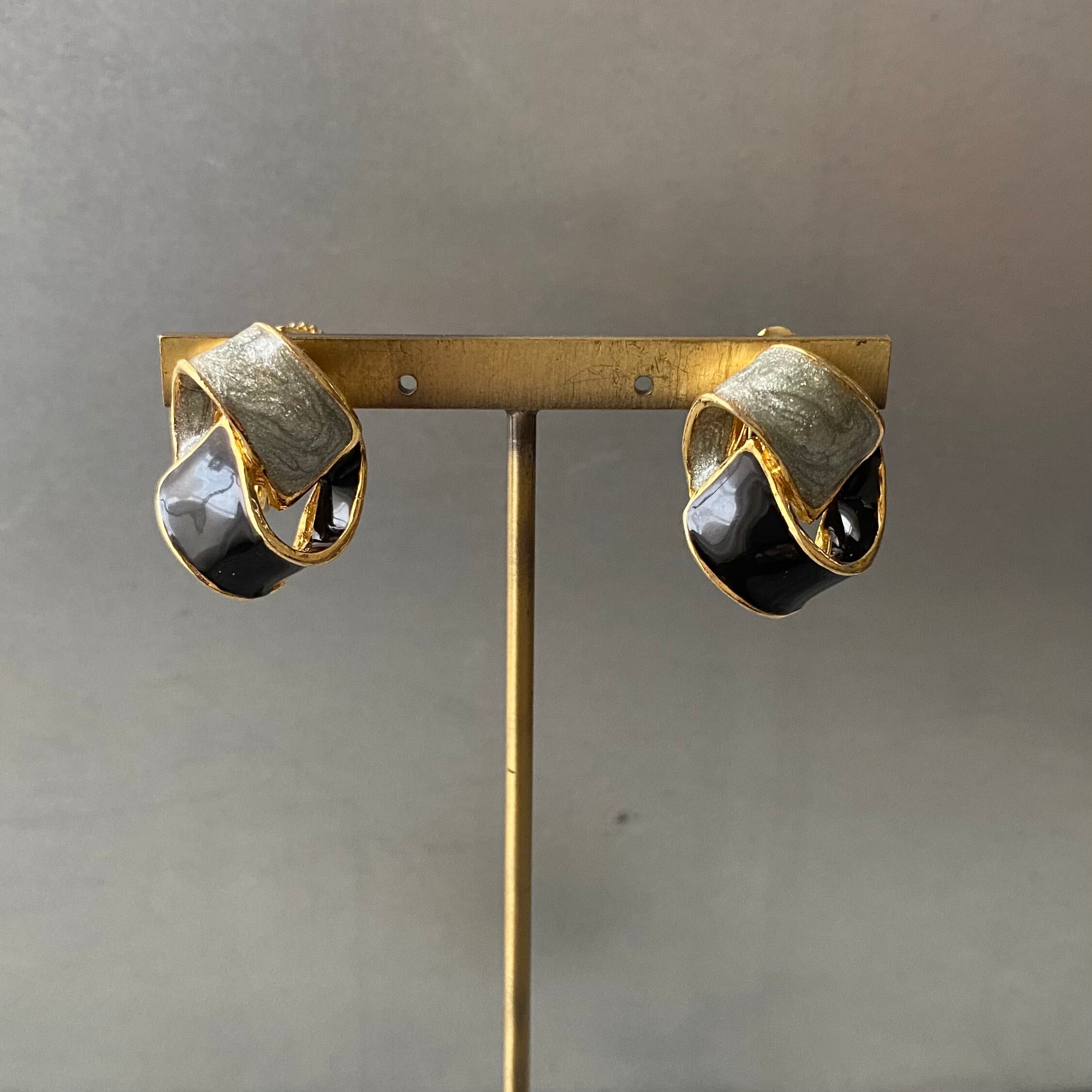 ブラック×シルバーのエナメルが魅力的なヴィンテージイヤリング。身につけやすいサイズ感で古着やレトロコーデのアクセントにおすすめです。