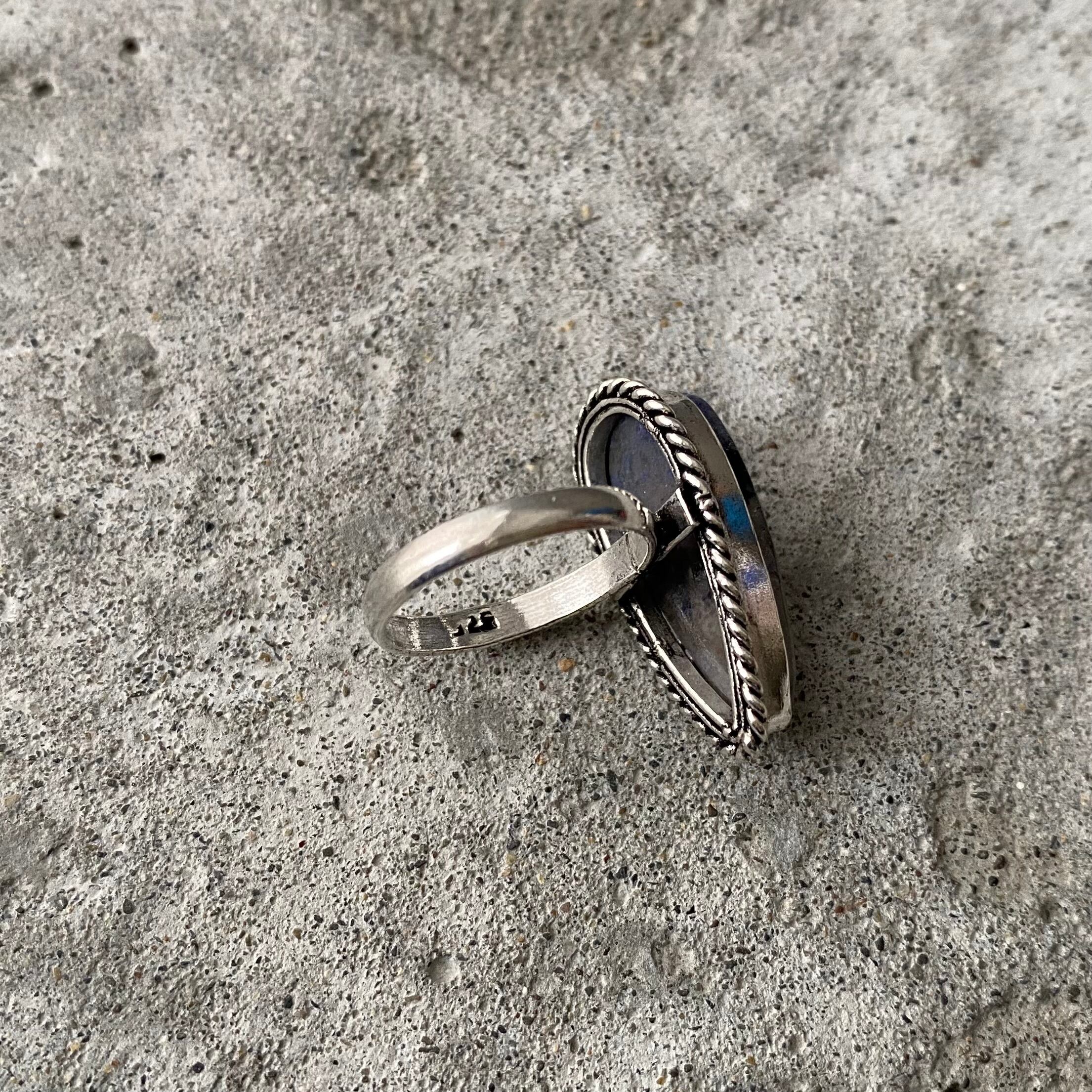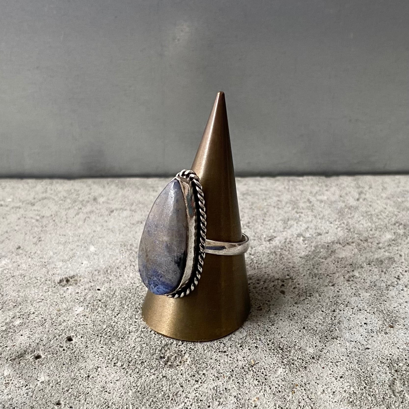 曇り空のようなアンニュイな色合いが魅力的な天然石リング。「ソーダライト」の石言葉は「夢」「目標達成」と言われ、持ち主が進むべき方向に向かうためのエネルギーを与えてくれると言われています。身につけやすいサイズ感で古着など様々なスタイルに合わせていただけます。