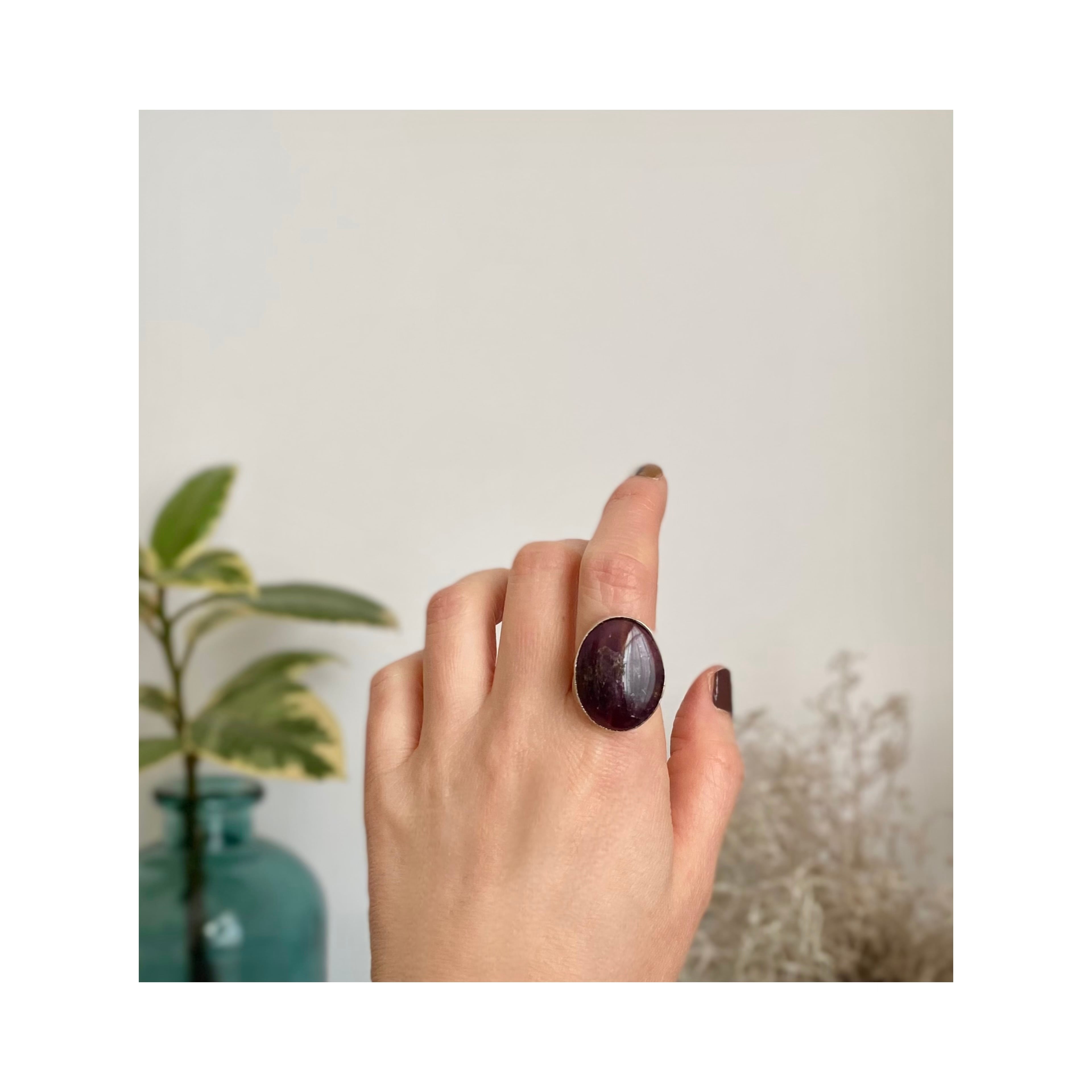 深みのあるパープルカラーの大きな天然石が魅力的なリング。2月の誕生石「アメジスト」は、持つ人に安らぎと癒しをもたらすと言い伝えられています。コーディネートに取り入れやすいシンプルなデザインで様々なスタイルに合わせていただけます。