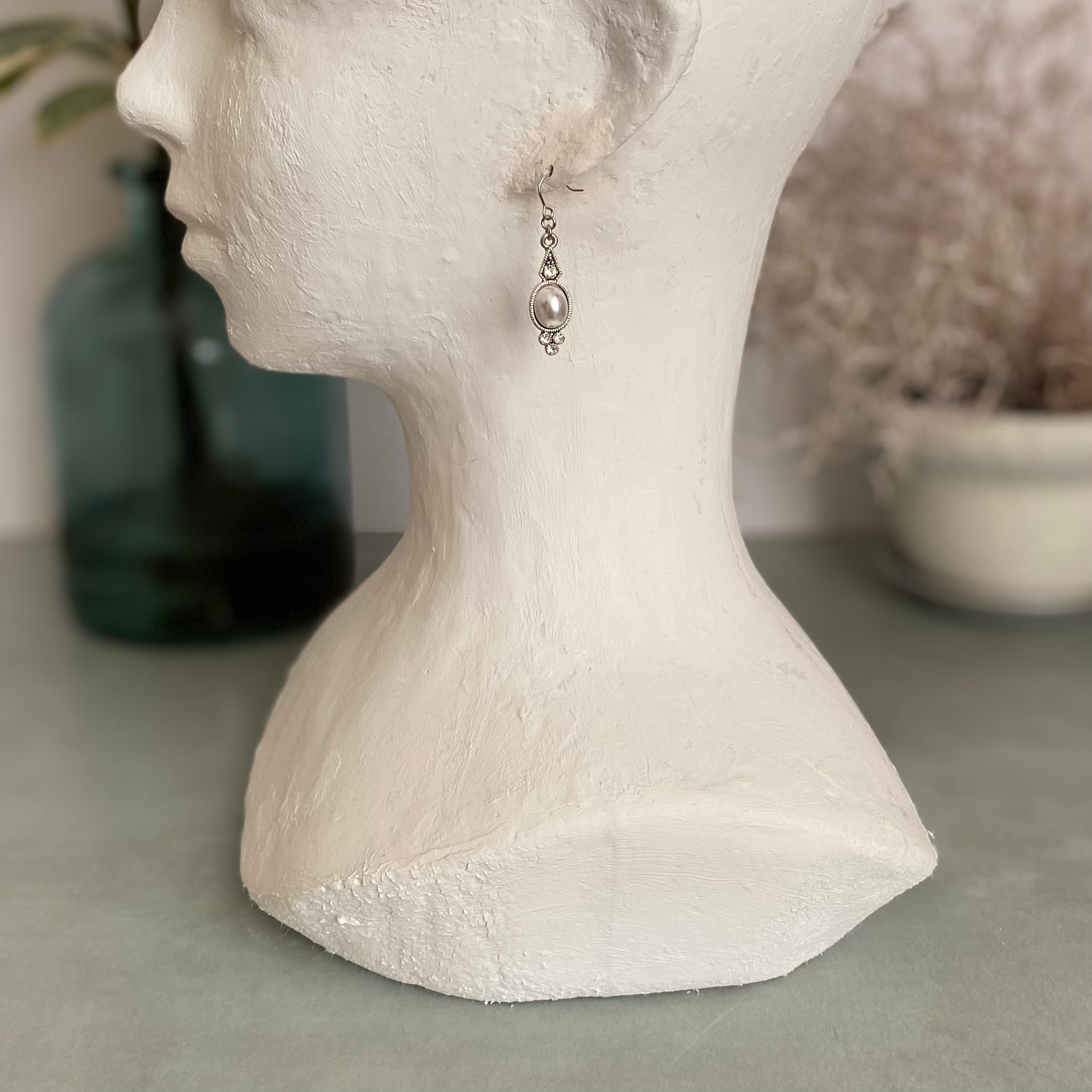 クラシカルなデザインのUSAユーズドピアス。パールとビジューが揺れるたびにキラキラと輝きお顔まわりを華やかな雰囲気にしてくれます。