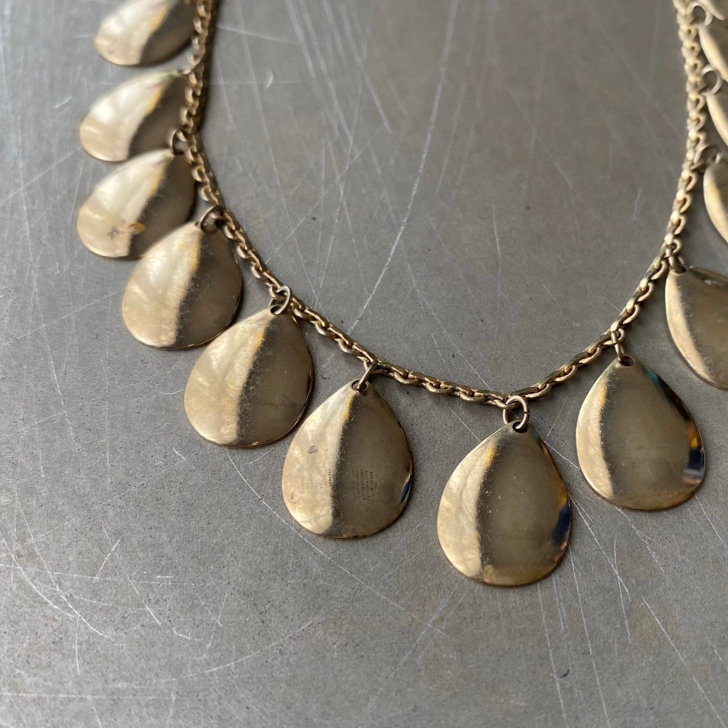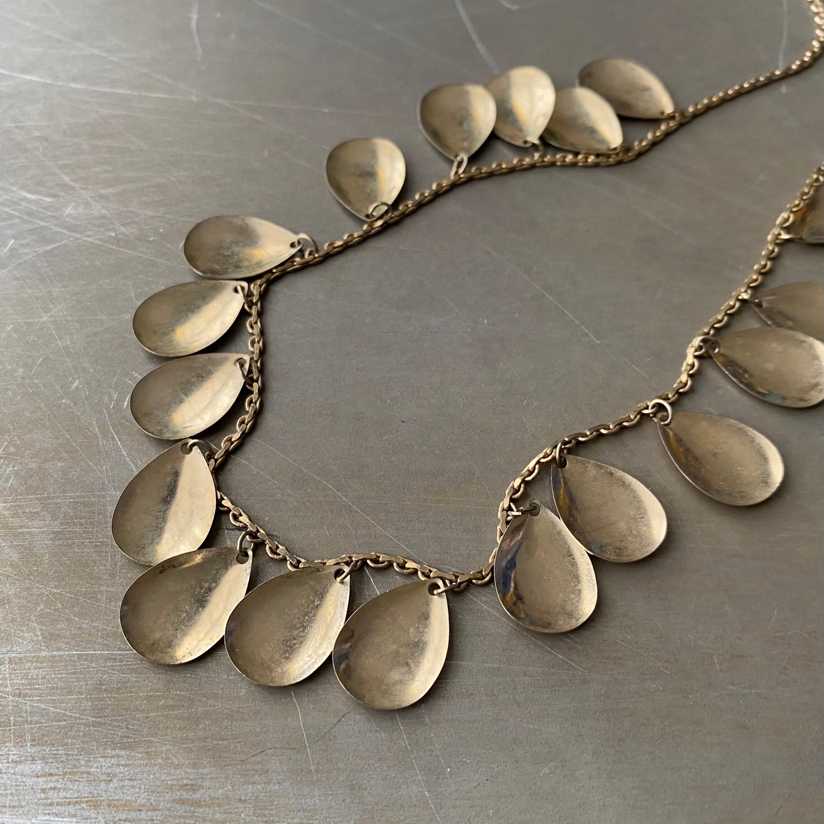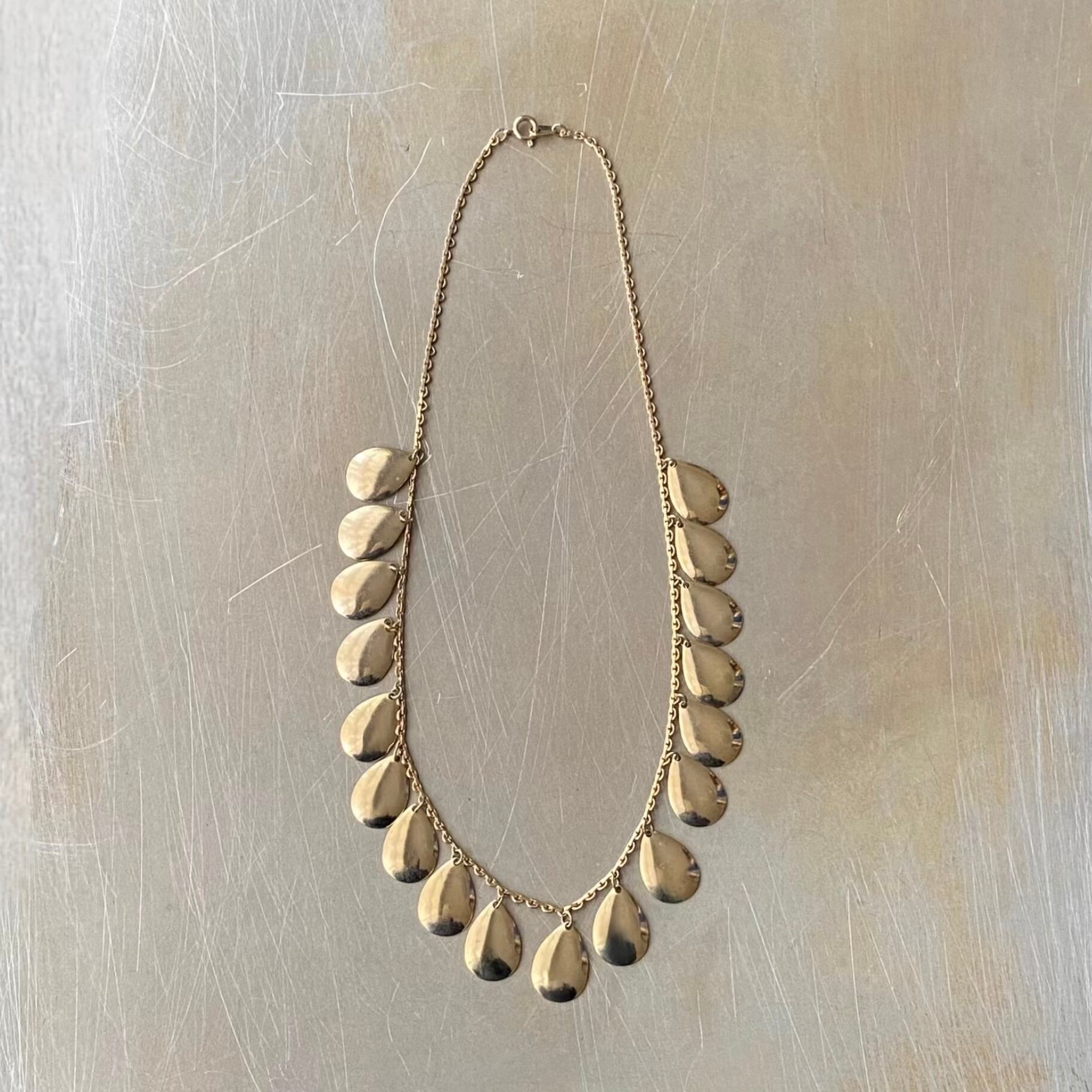 ドロップパーツが揺らめくスタイリッシュなデザインのヴィンテージネックレス。肌馴染みの良い古びたメタルの色味が魅力的。軽やかな着け心地でスタイリングにお洒落な雰囲気をプラスしてくれます。