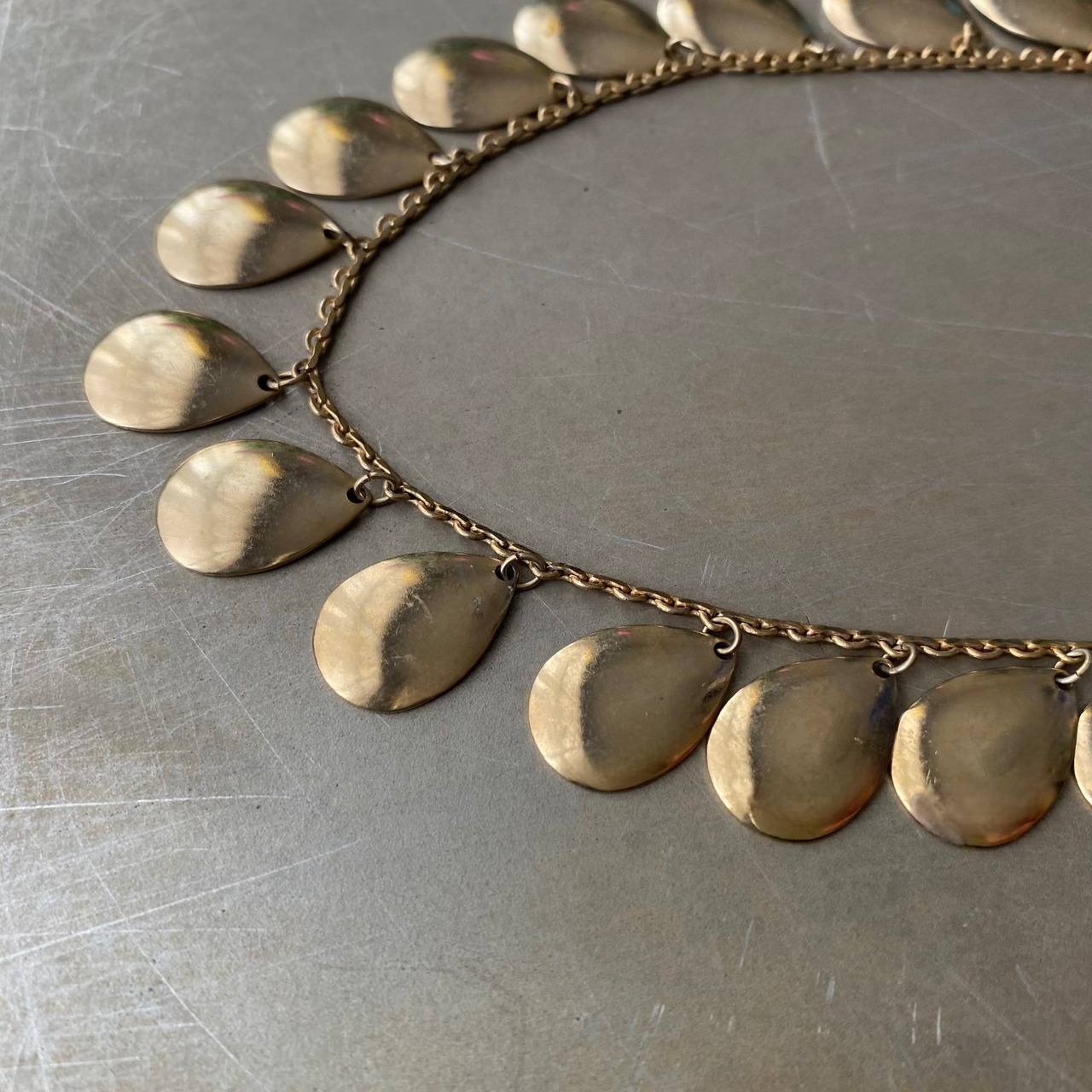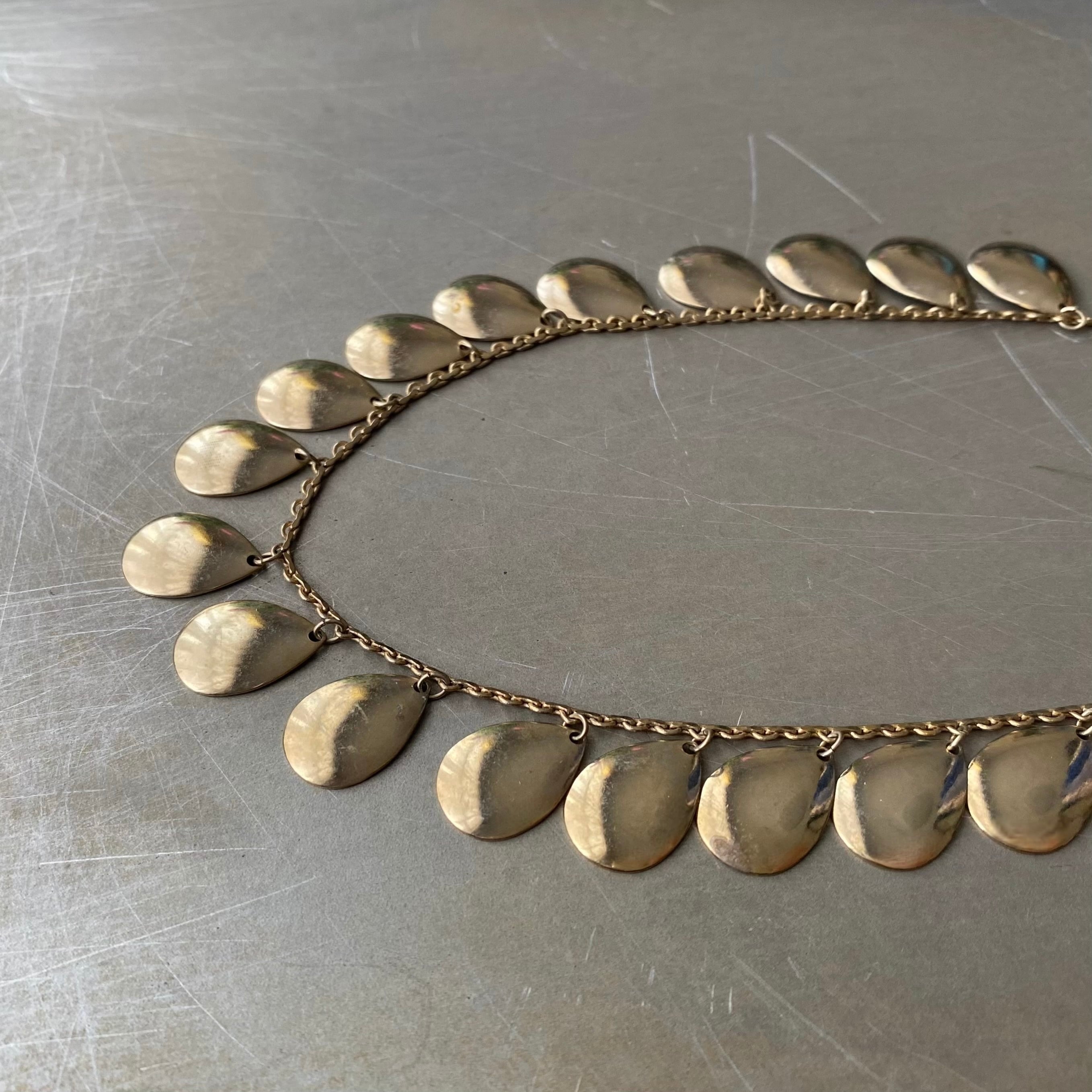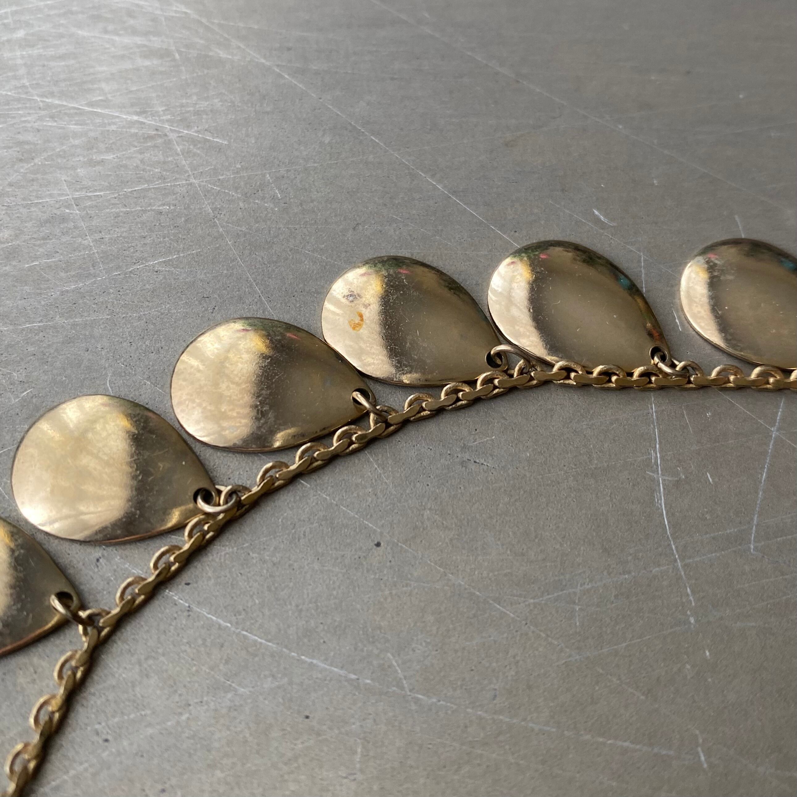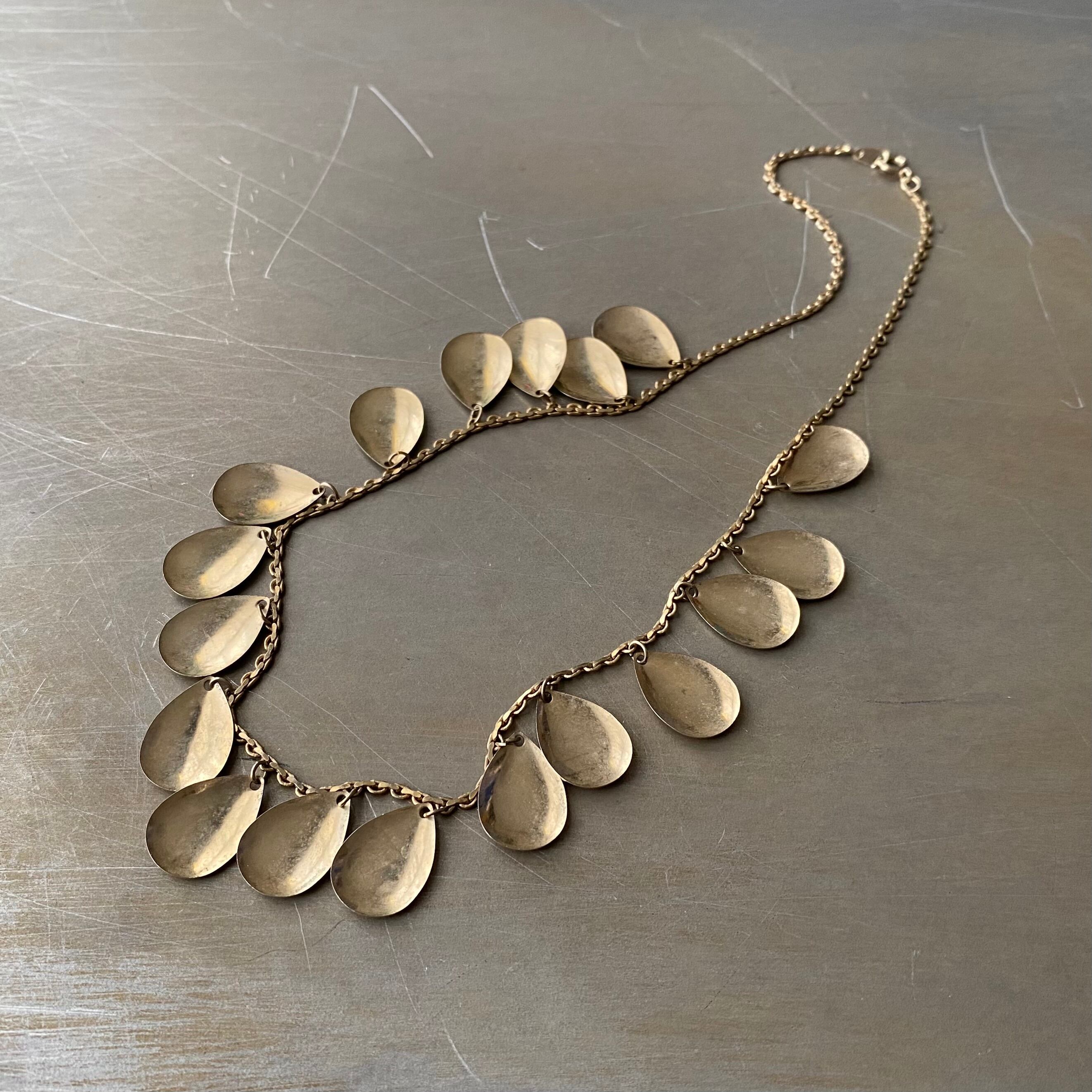 ドロップパーツが揺らめくスタイリッシュなデザインのヴィンテージネックレス。肌馴染みの良い古びたメタルの色味が魅力的。軽やかな着け心地でスタイリングにお洒落な雰囲気をプラスしてくれます。