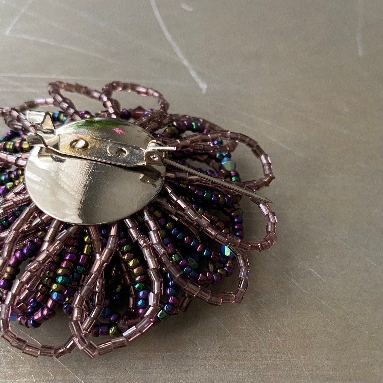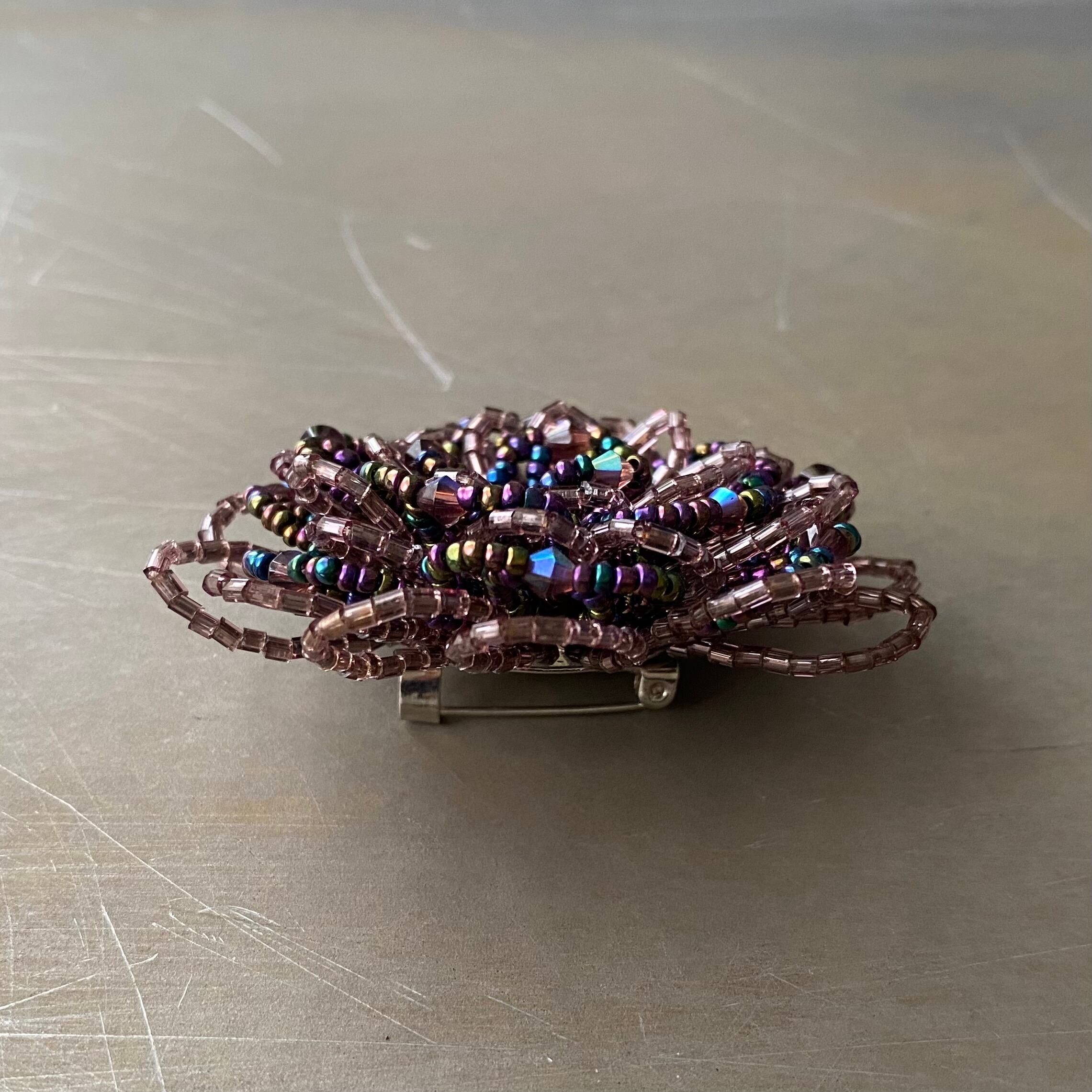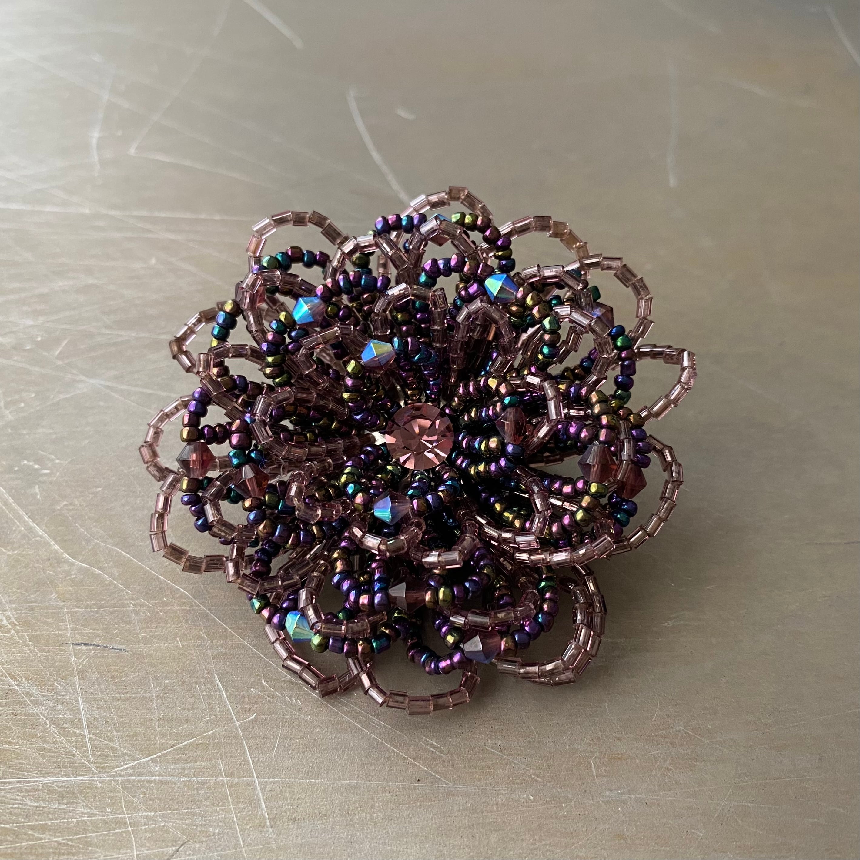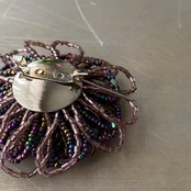 繊細なビーズで作られたフラワーモチーフのヴィンテージブローチ。落ち着いたパープルカラーで動くたびにキラキラと輝きます。存在感がありストールやジャケット等のアクセントにおすすめです。
