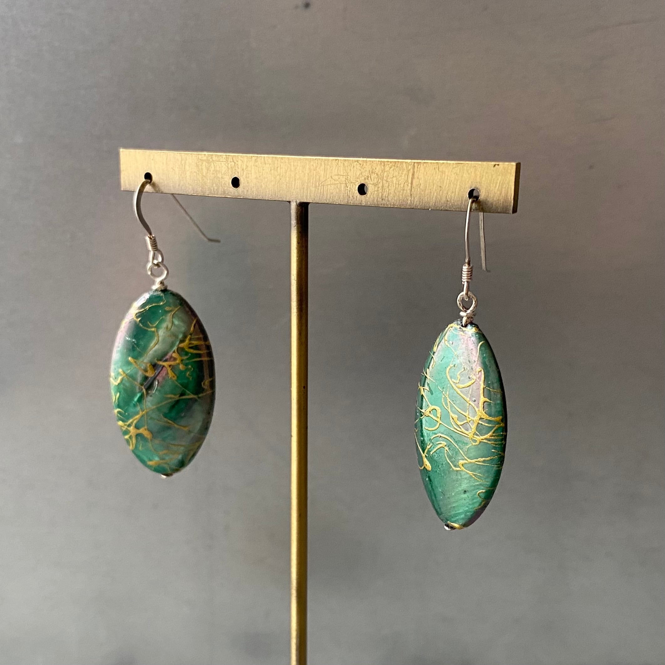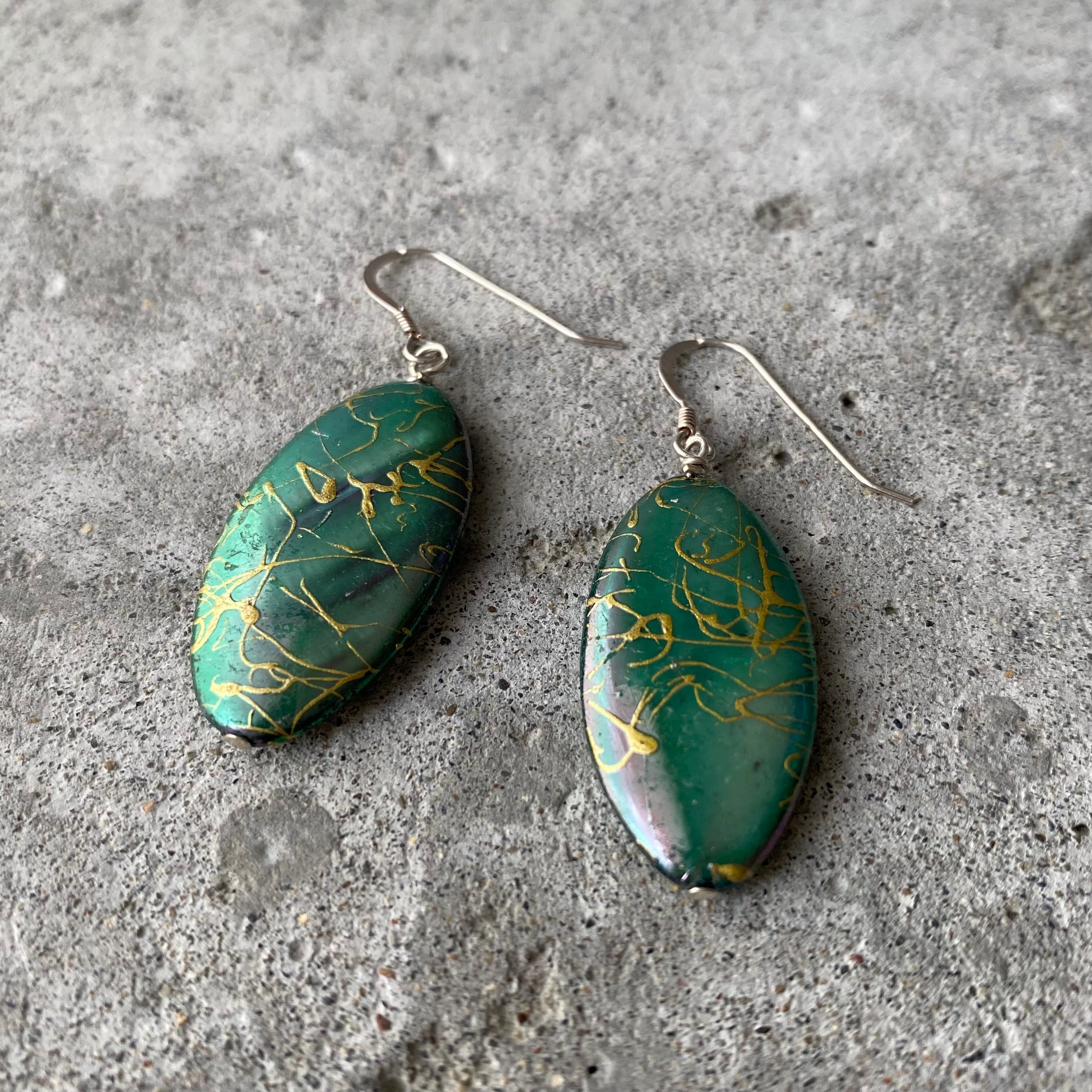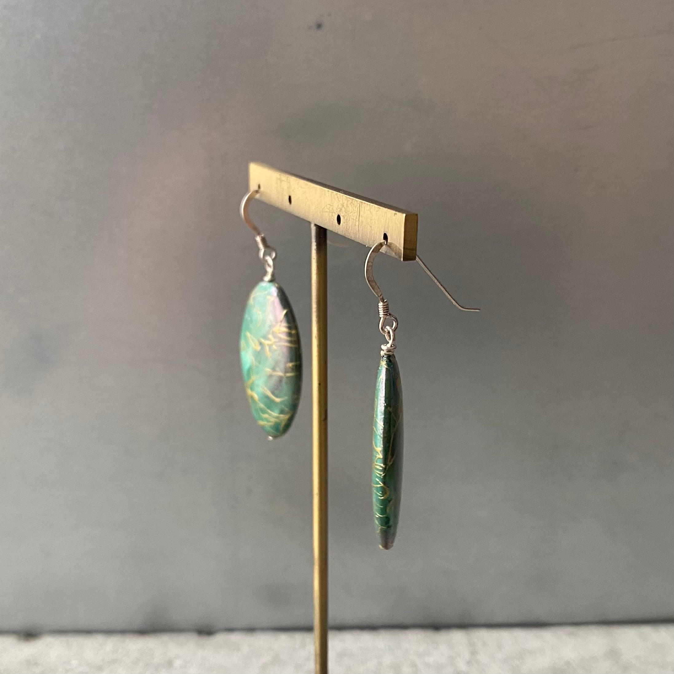 美しいグリーンのシェルにゴールドのペイントが映えるUSAヴィンテージピアス。動くたびにキラキラと輝きお顔まわりを華やかに彩ってくれます。