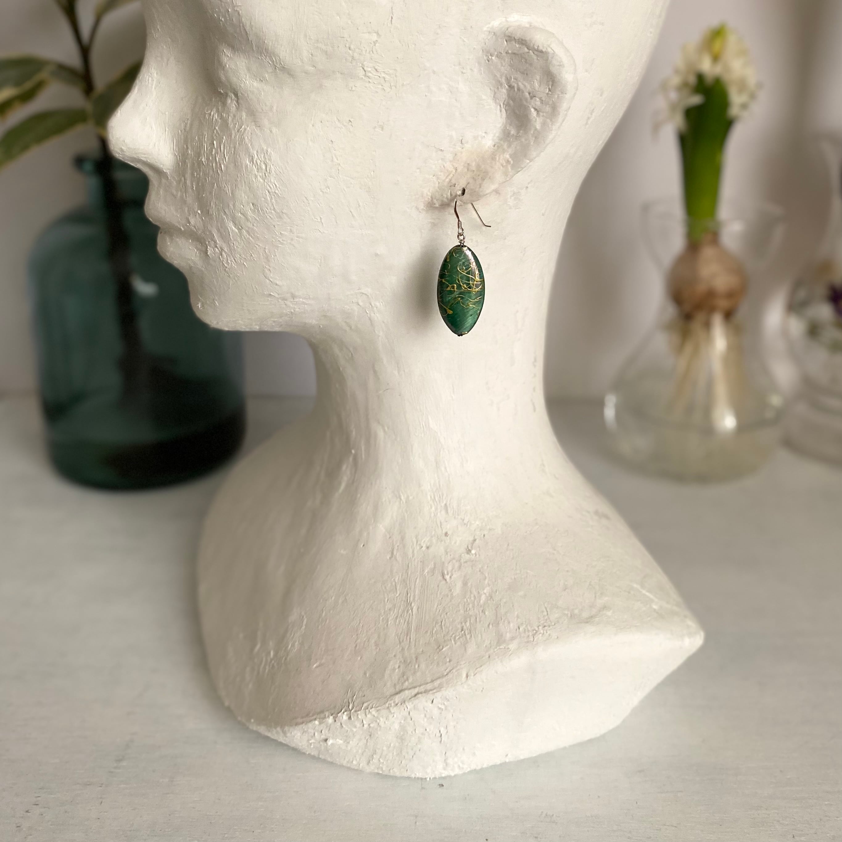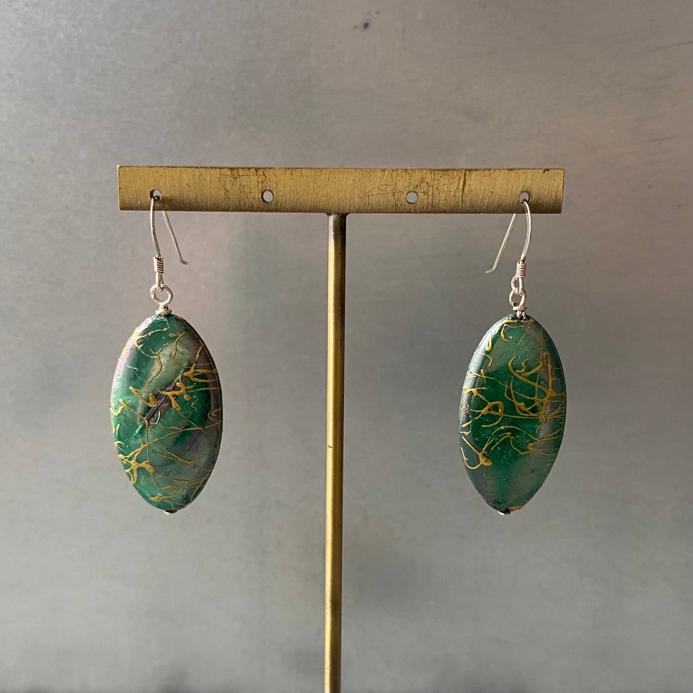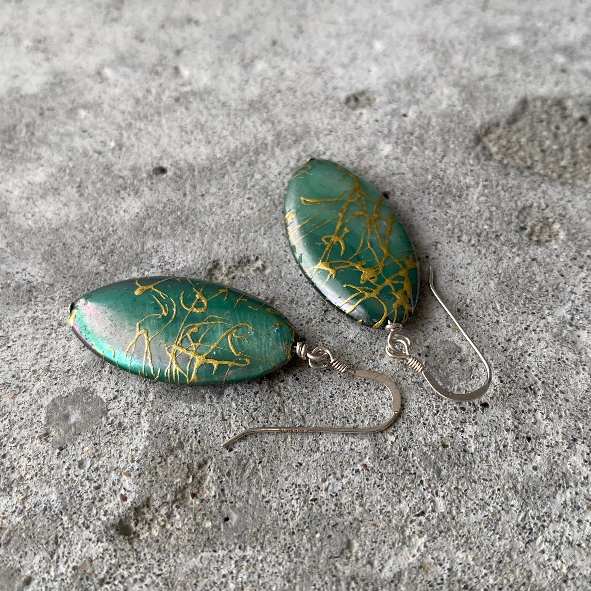 美しいグリーンのシェルにゴールドのペイントが映えるUSAヴィンテージピアス。動くたびにキラキラと輝きお顔まわりを華やかに彩ってくれます。