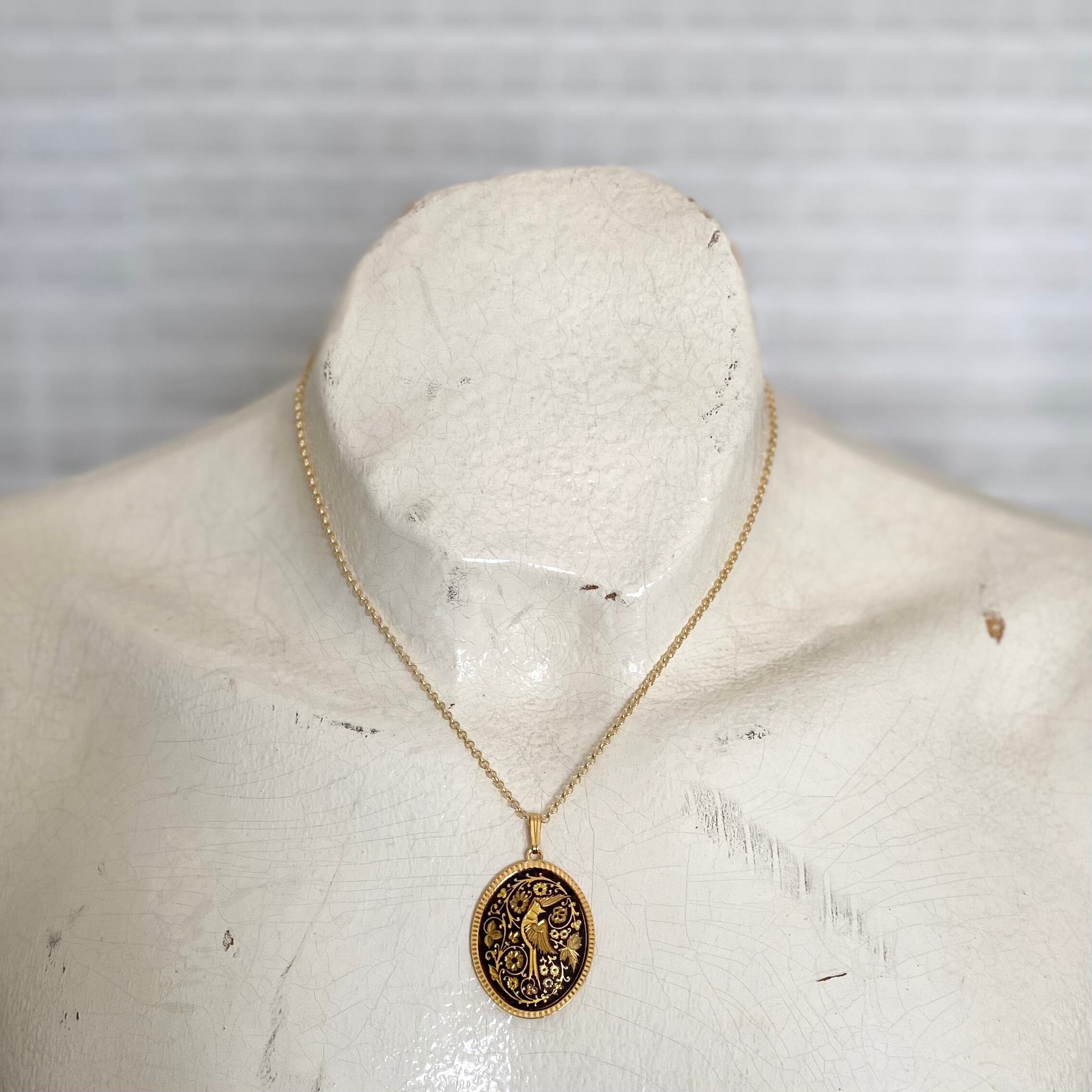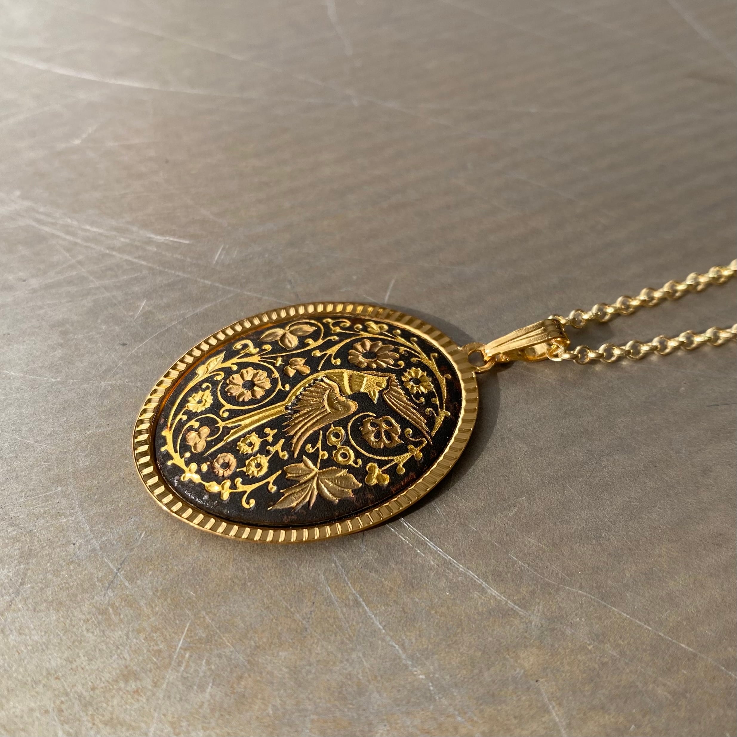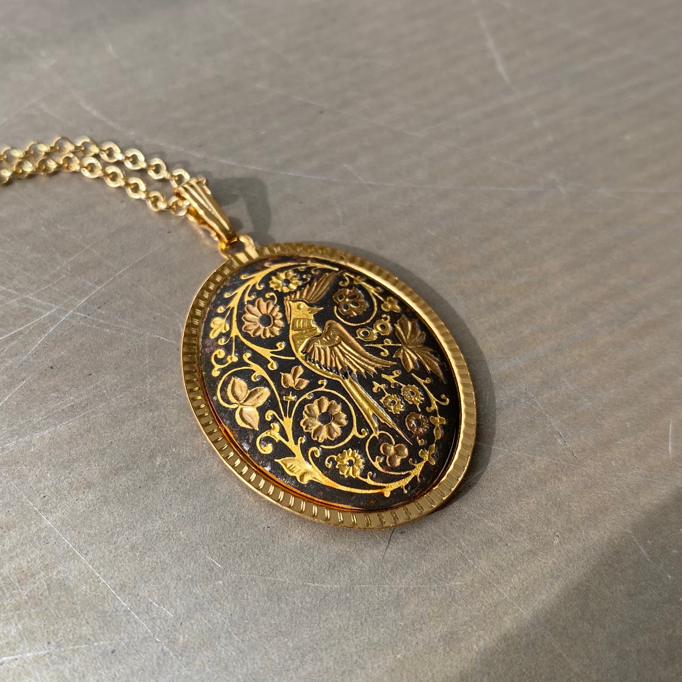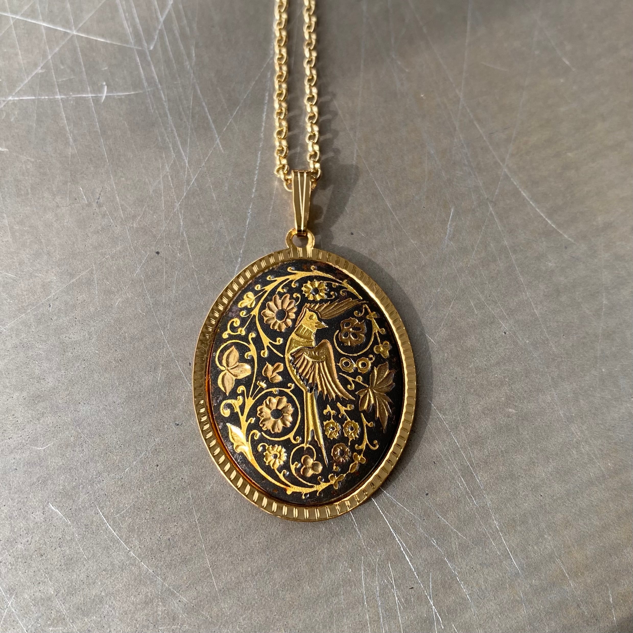 スペイン製「ダマスキナード」のユーロヴィンテージネックレス。象嵌で表現された繊細で美しい鳥や植物が魅力的なデザインです。エレガントな雰囲気で存在感がありシンプルなネックレスとの重ね着けにもおすすめです。