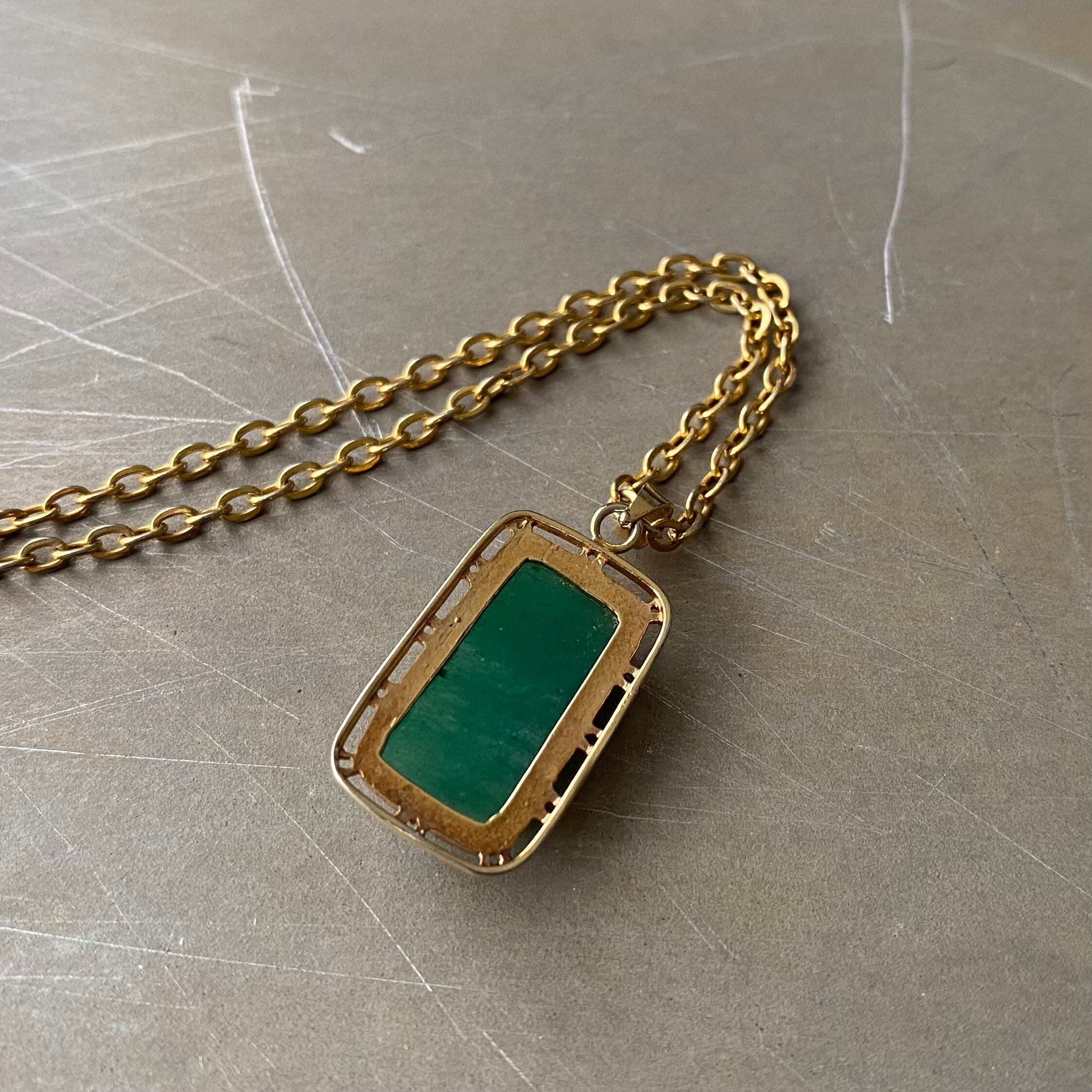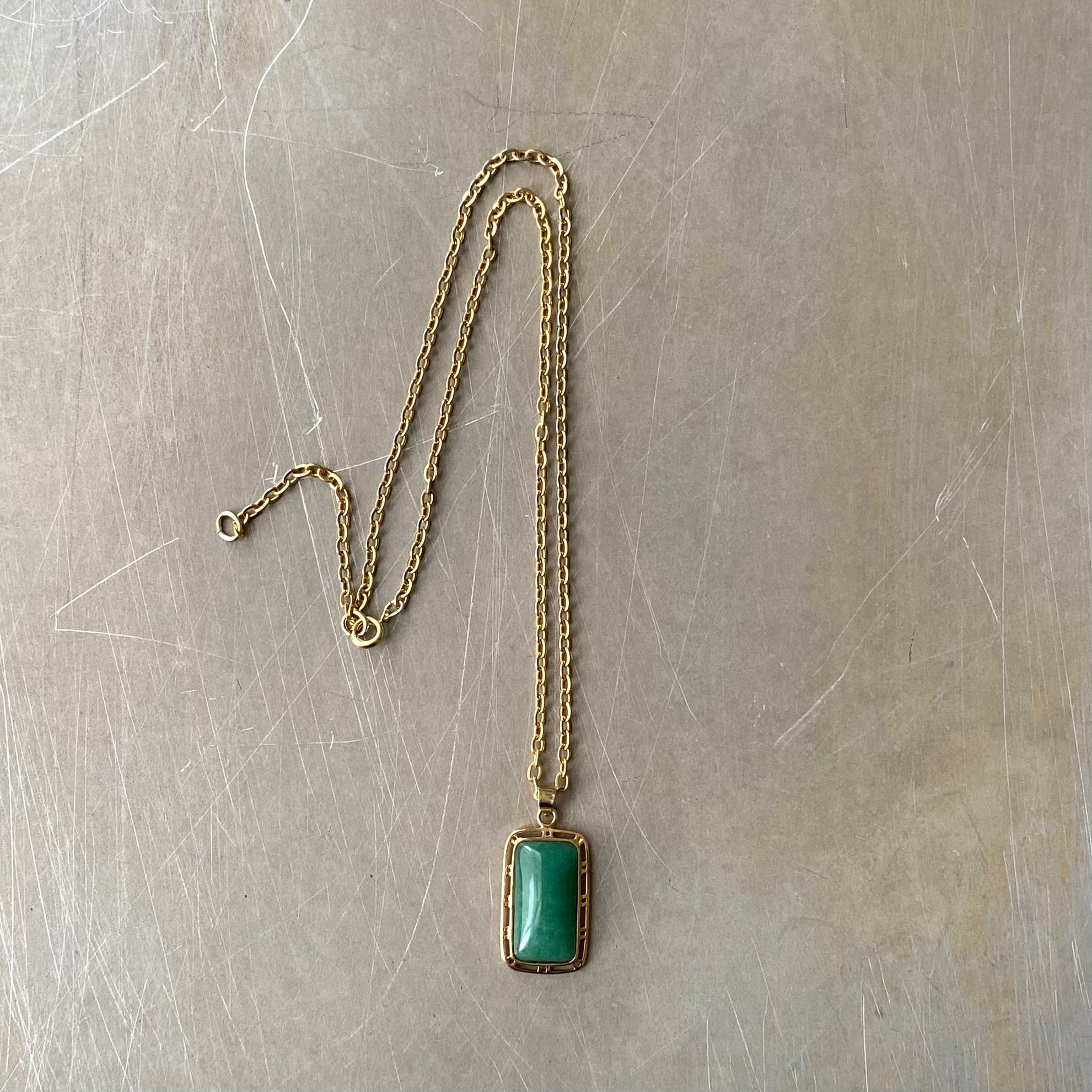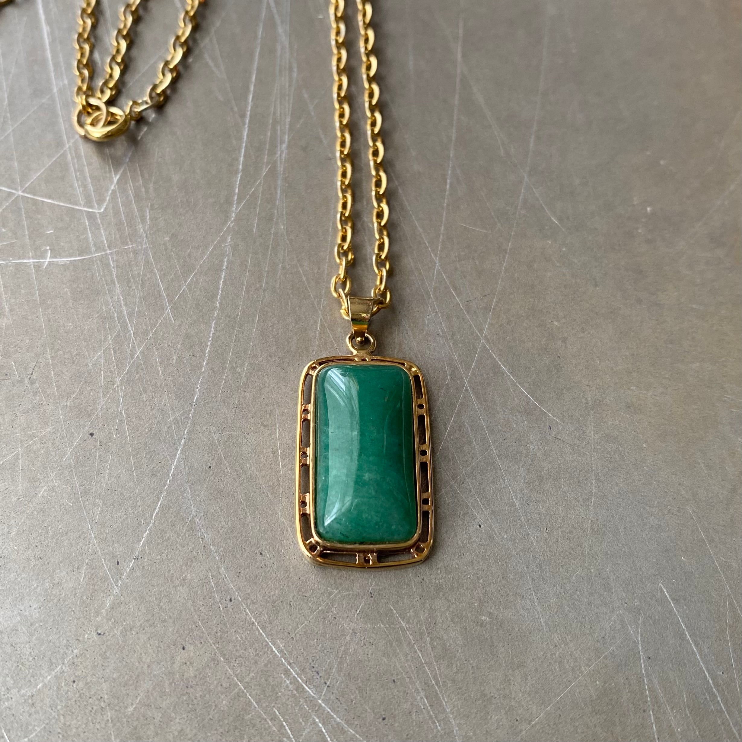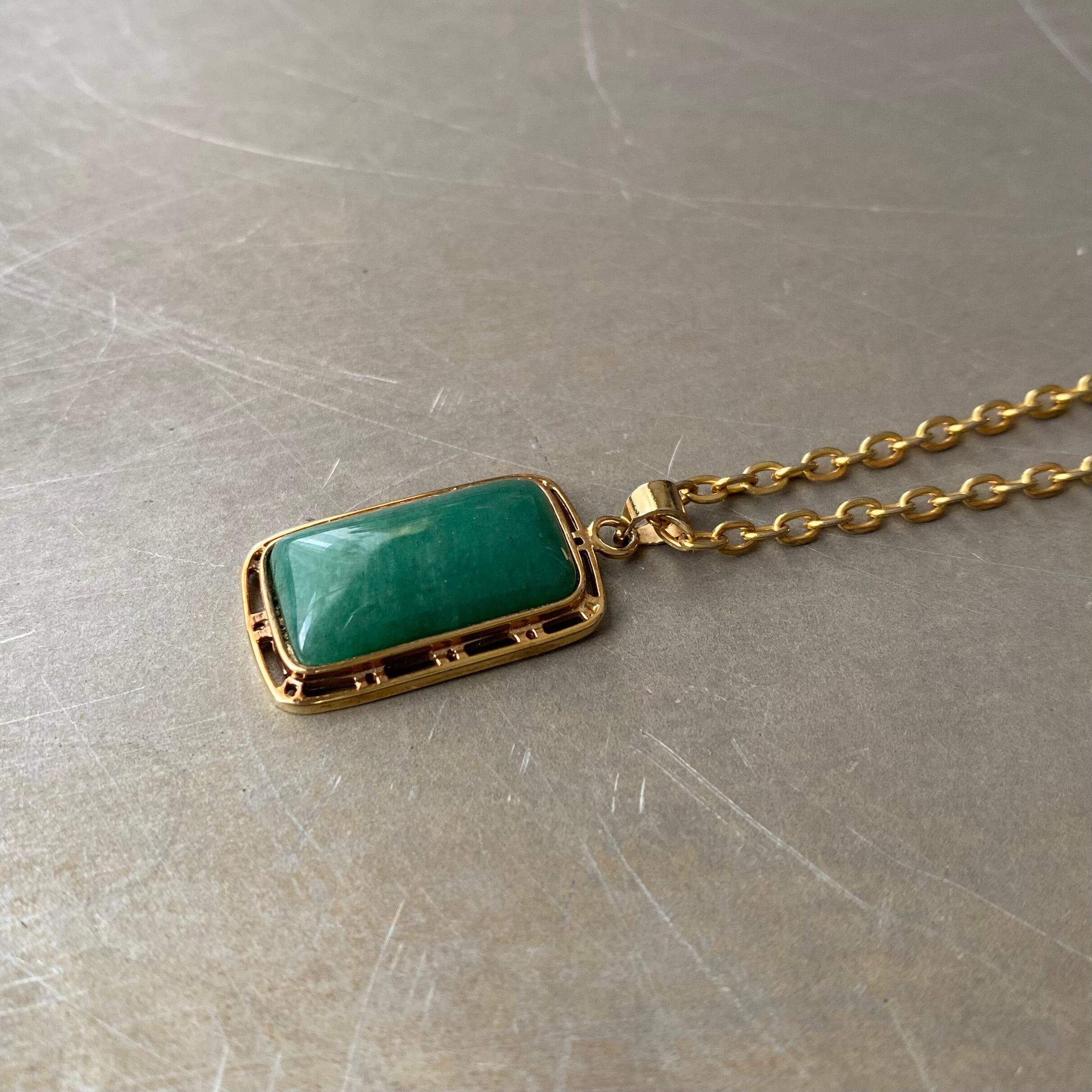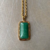 美しいグリーンの天然石が魅力的なヴィンテージネックレス。スクエアカボションのストーンとレトロな石座がマッチしたお洒落なデザインです。牡羊座・牡牛座の守護石でもある「グリーンアベンチュリン」は、ストレスを癒し、持ち主をより良い方向へ導いてくれると言い伝えられています。シンプルながら存在感があり様々なスタイルに合わせていただけます。