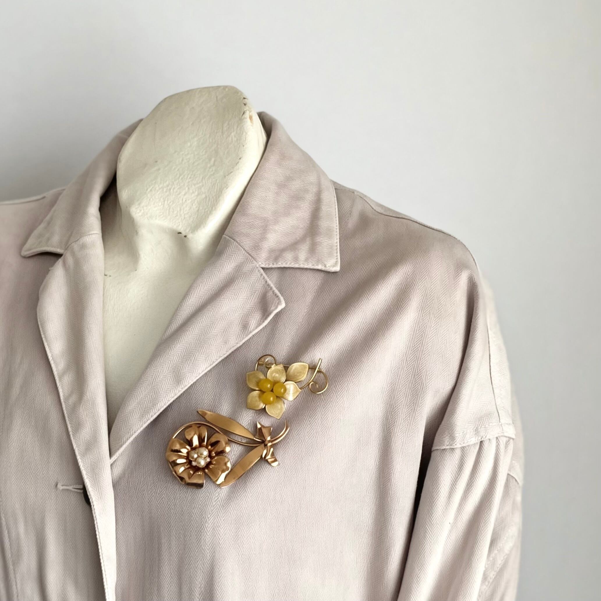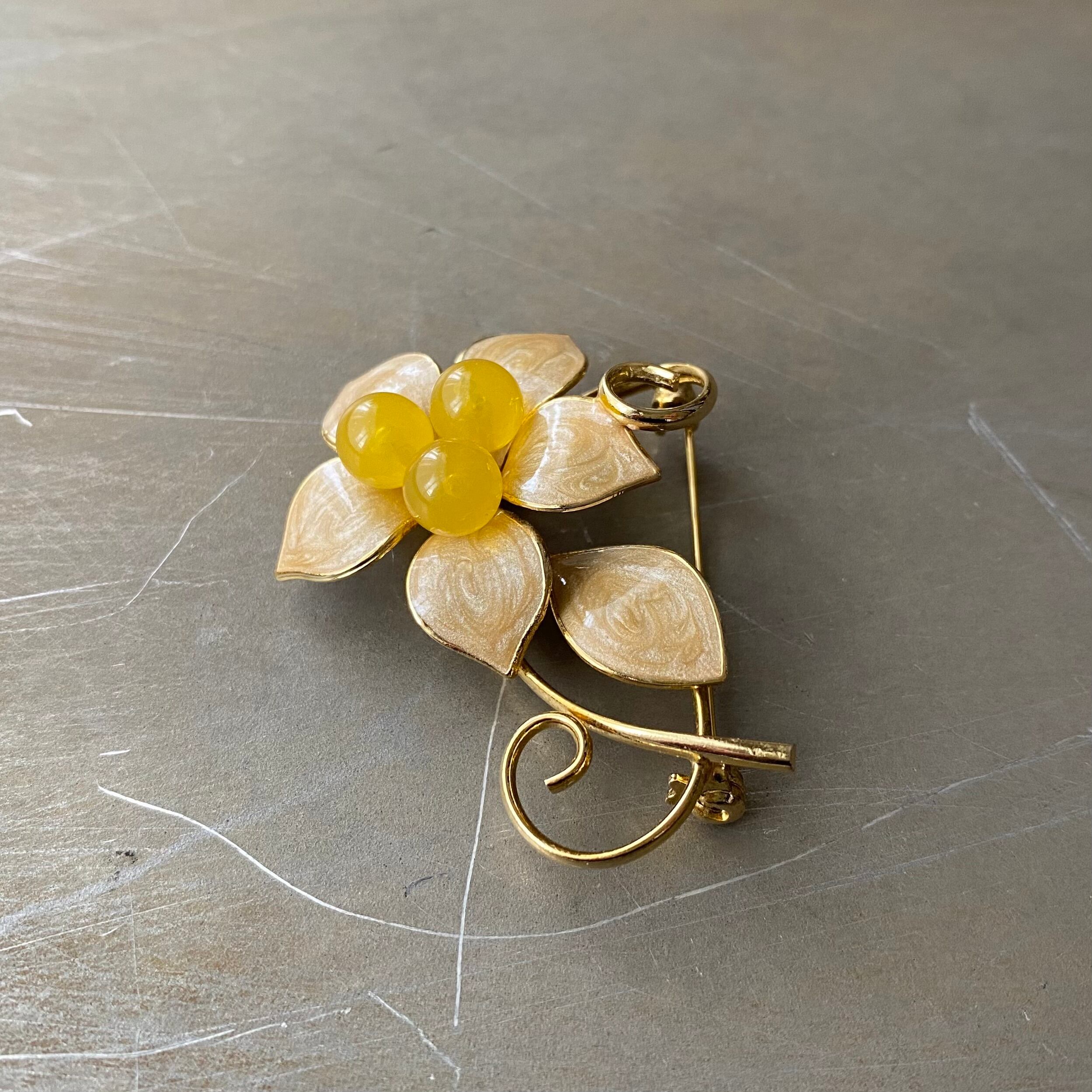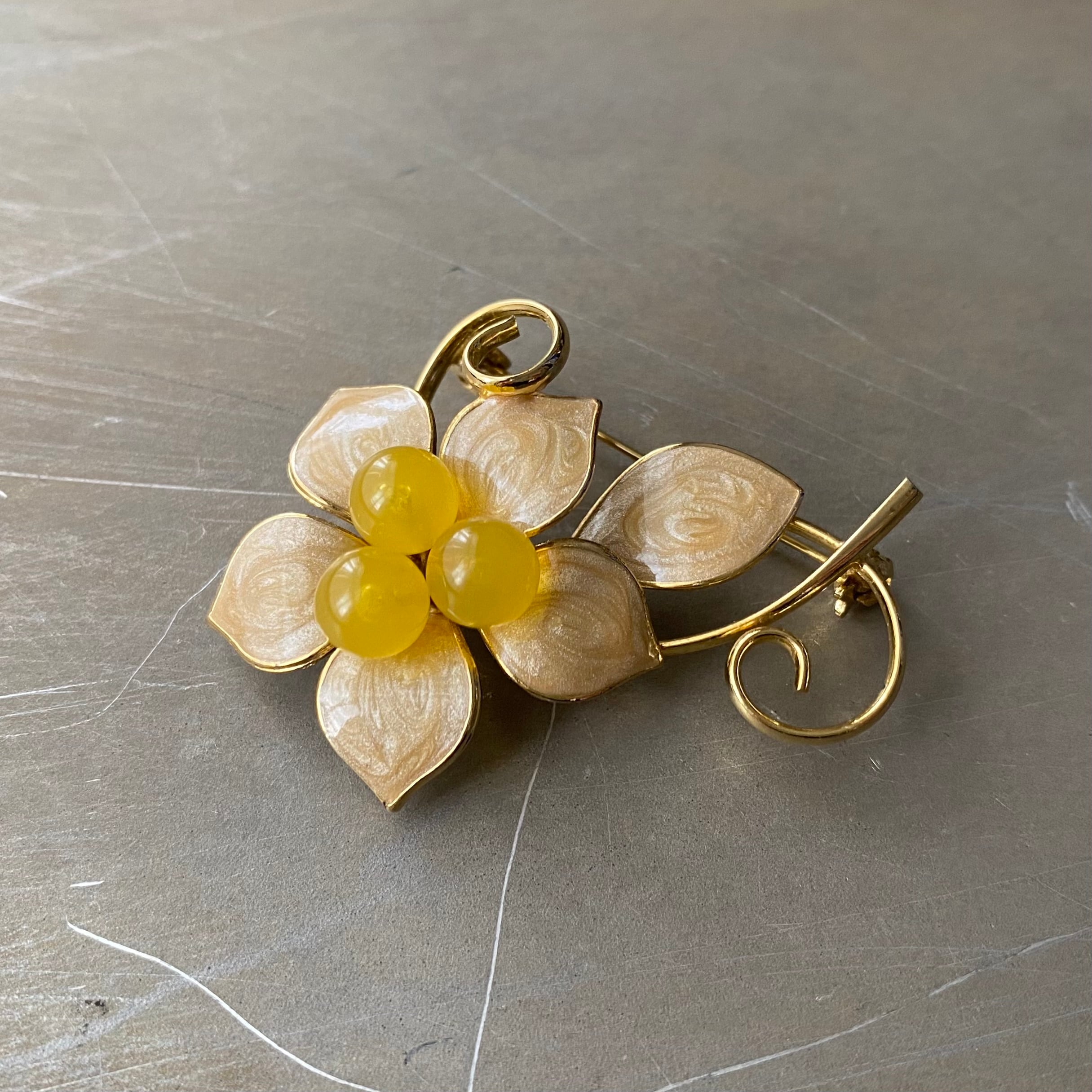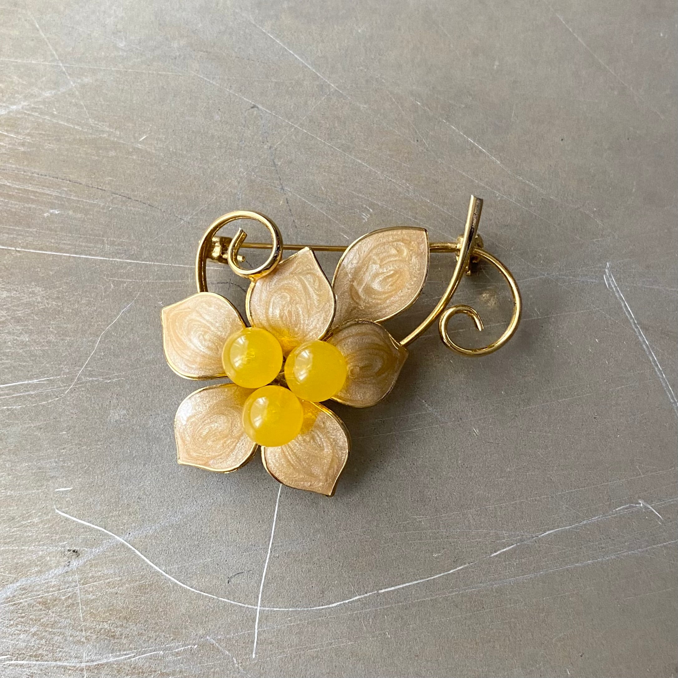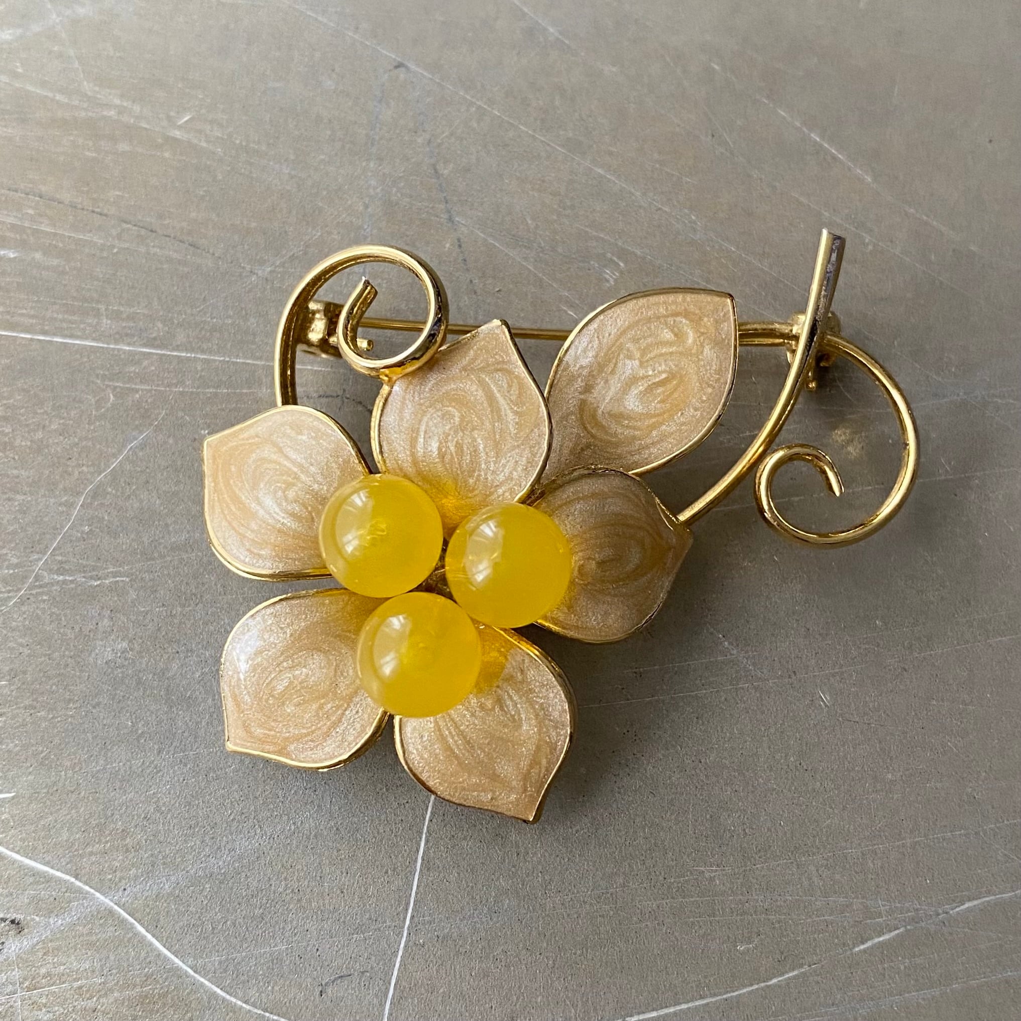 レトロ可愛いフラワーモチーフのヴィンテージブローチ。上品なベージュのエナメルに黄色のストーンが映えるお洒落なデザイン。身につけやすいサイズ感でストールやジャケット等のアクセントにおすすめです。