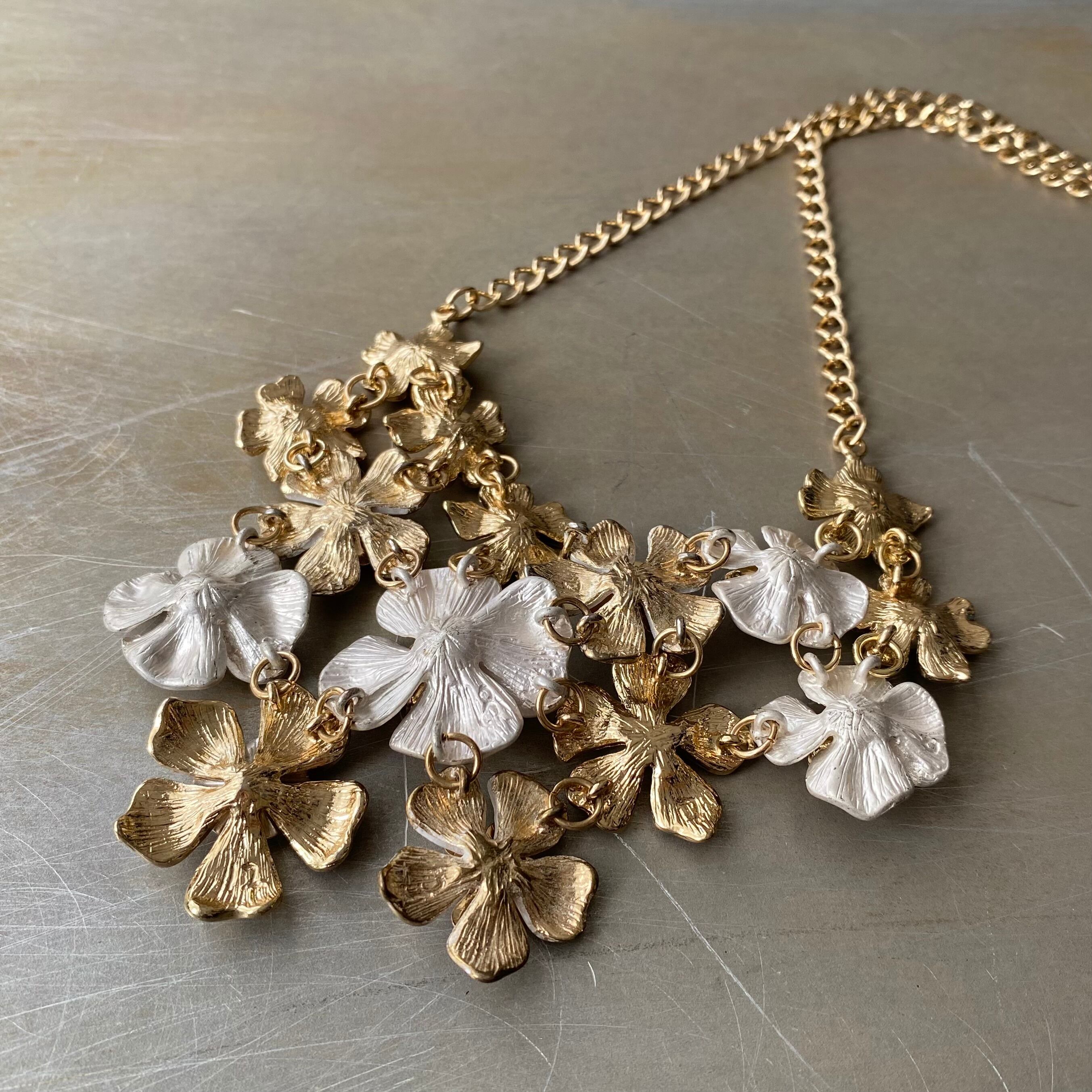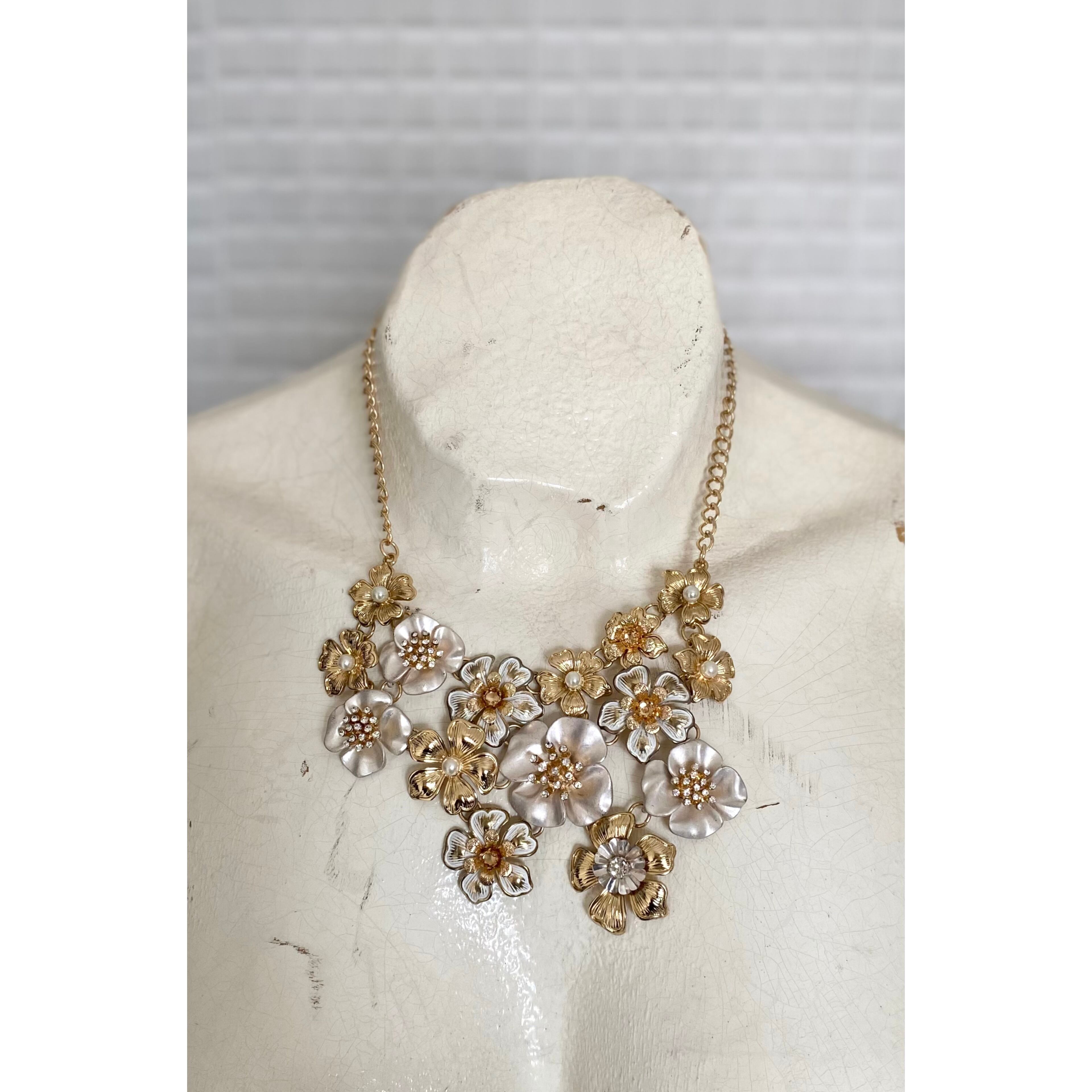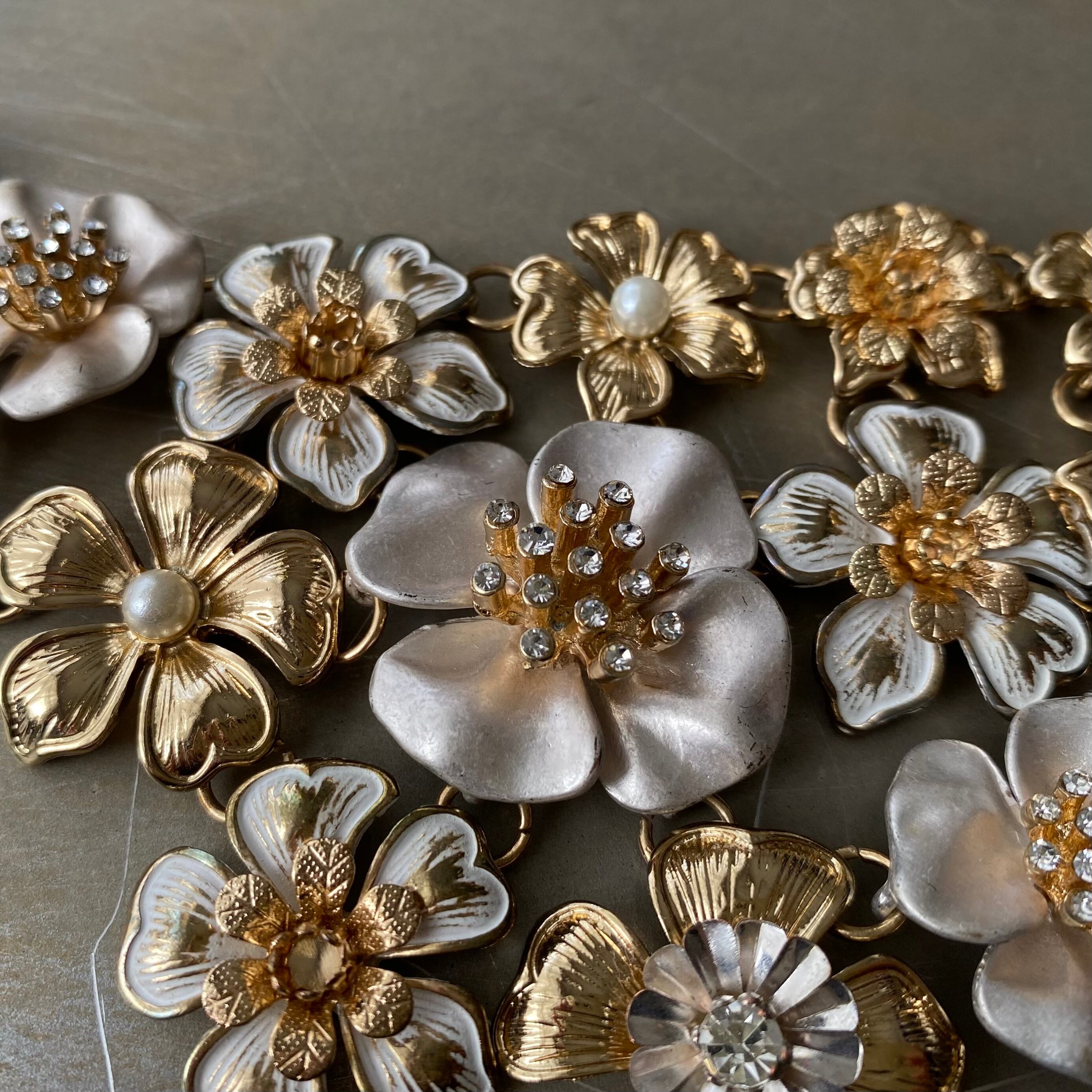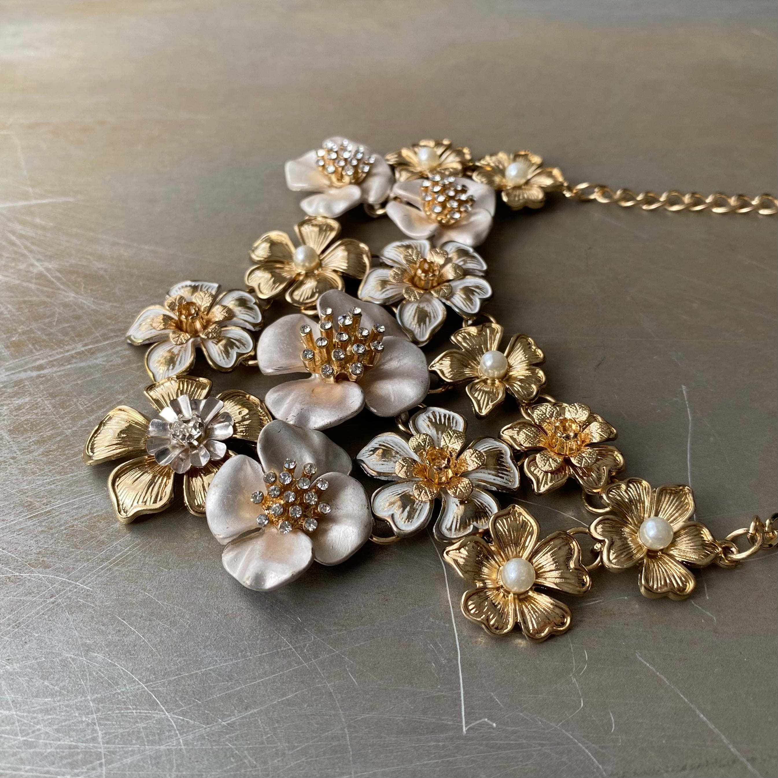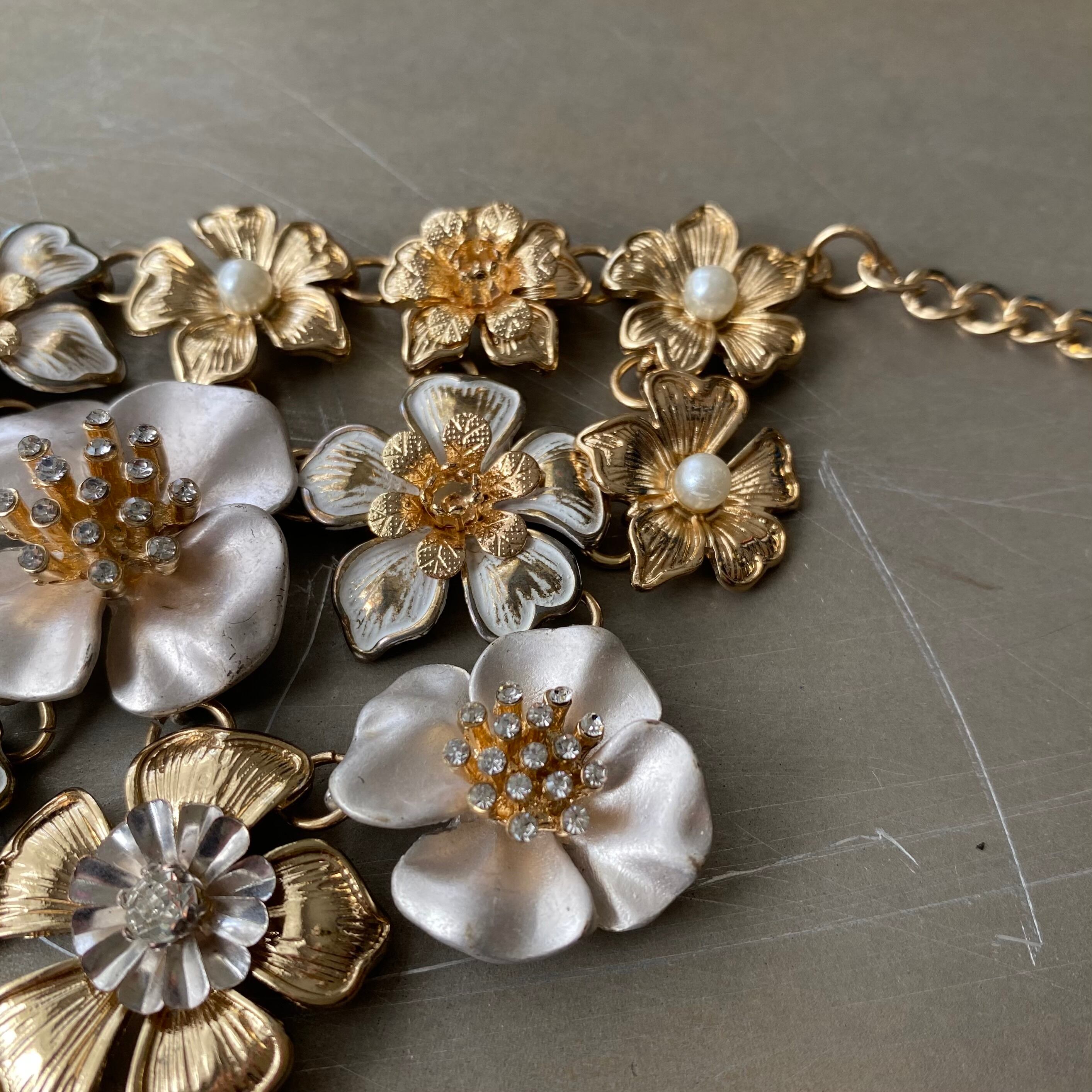 フラワーパーツが贅沢にあしらわれた華やかな雰囲気のUSAヴィンテージネックレス。ビジューがキラキラと輝くゴージャスなデザイン。大ぶりで存在感がありスタイリングの主役におすすめです。