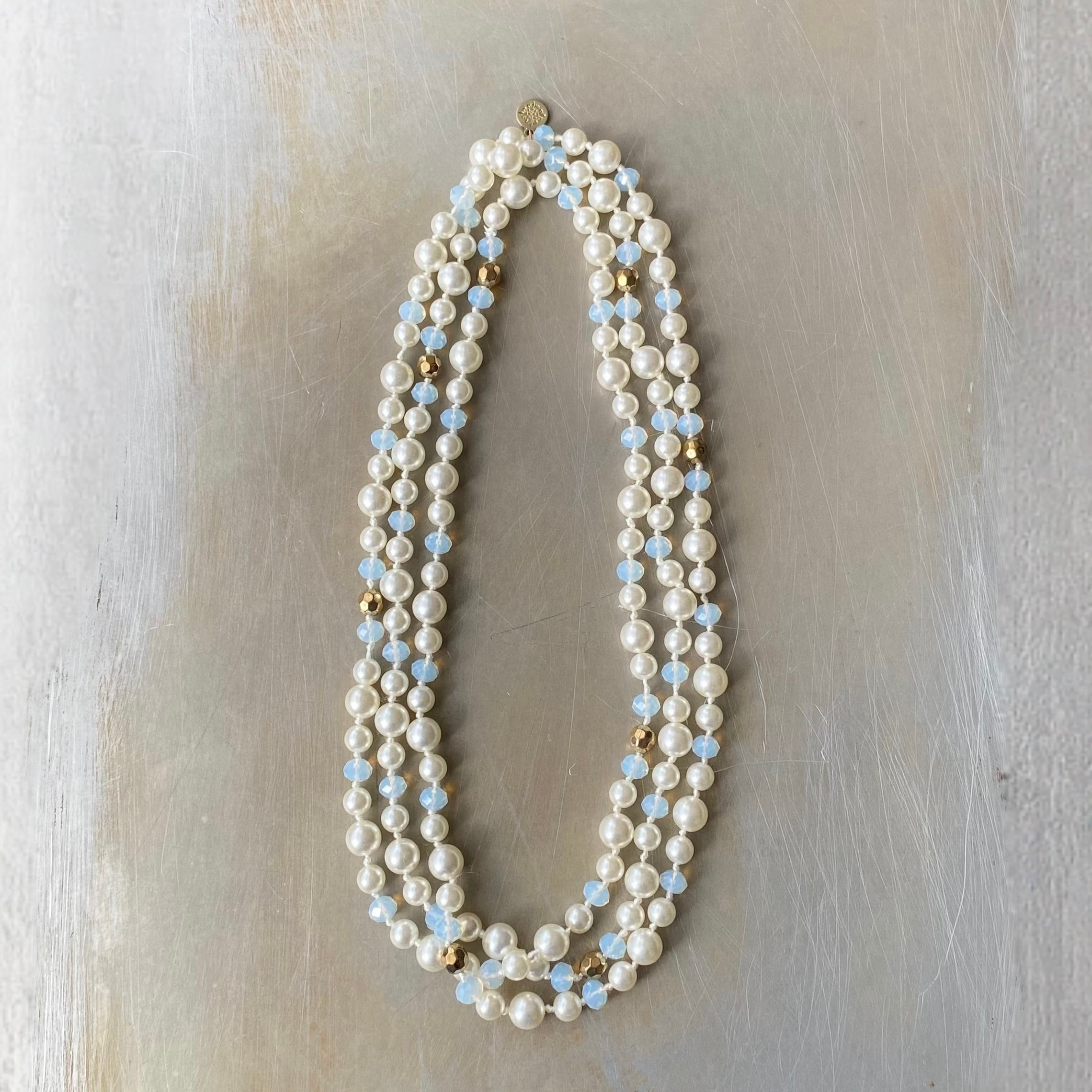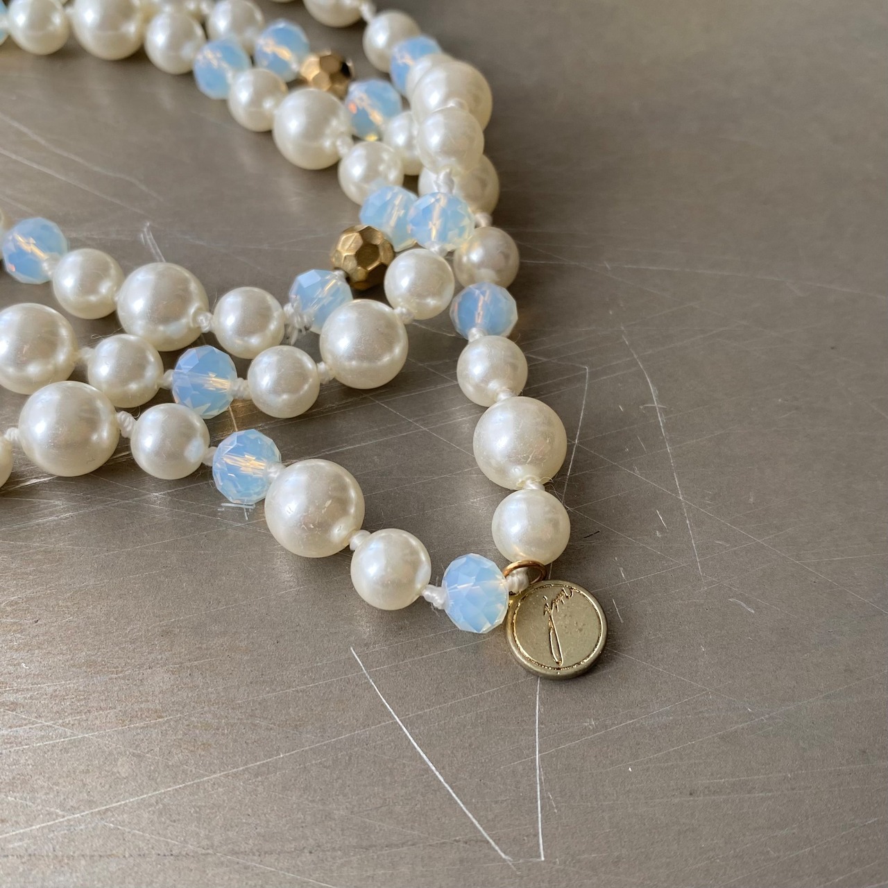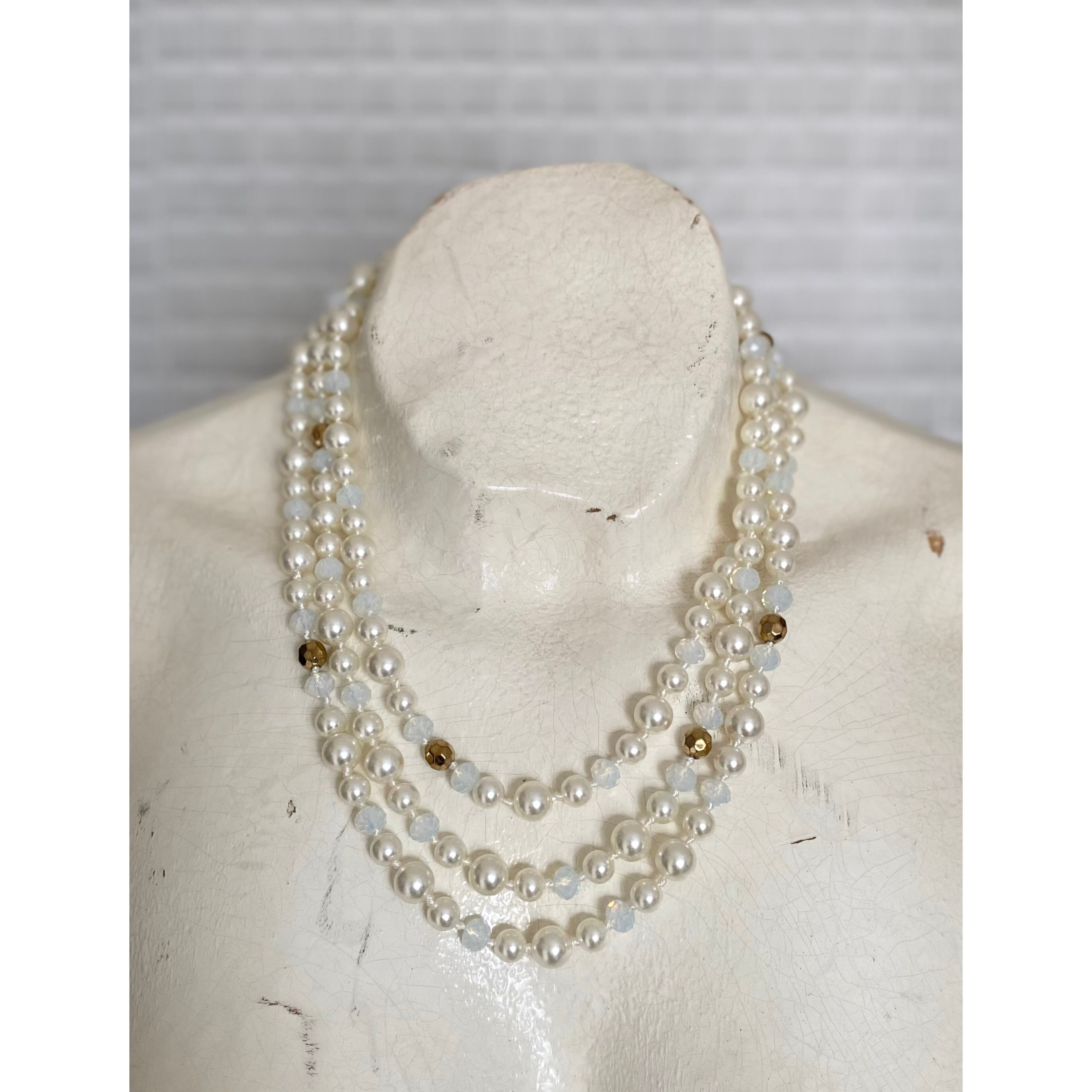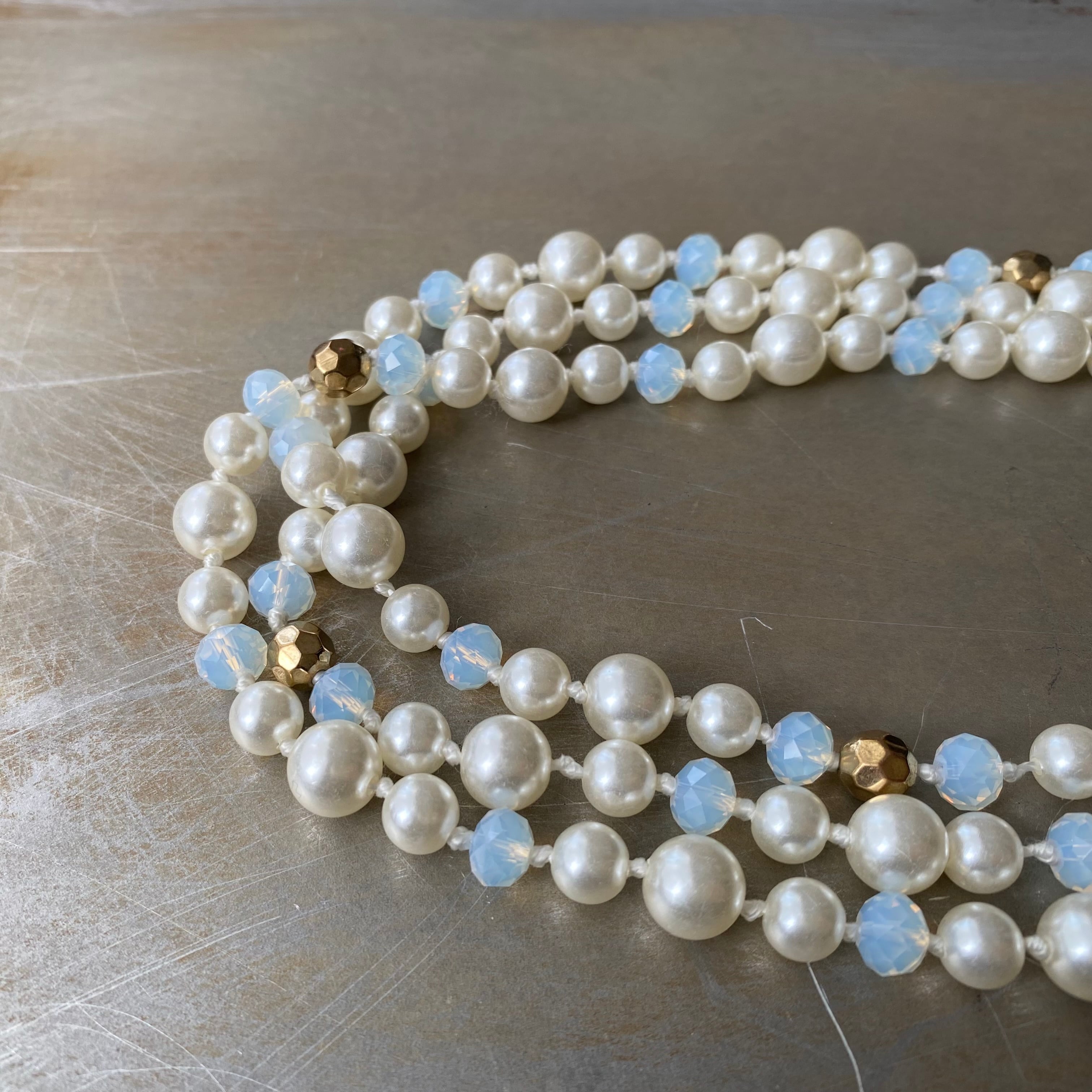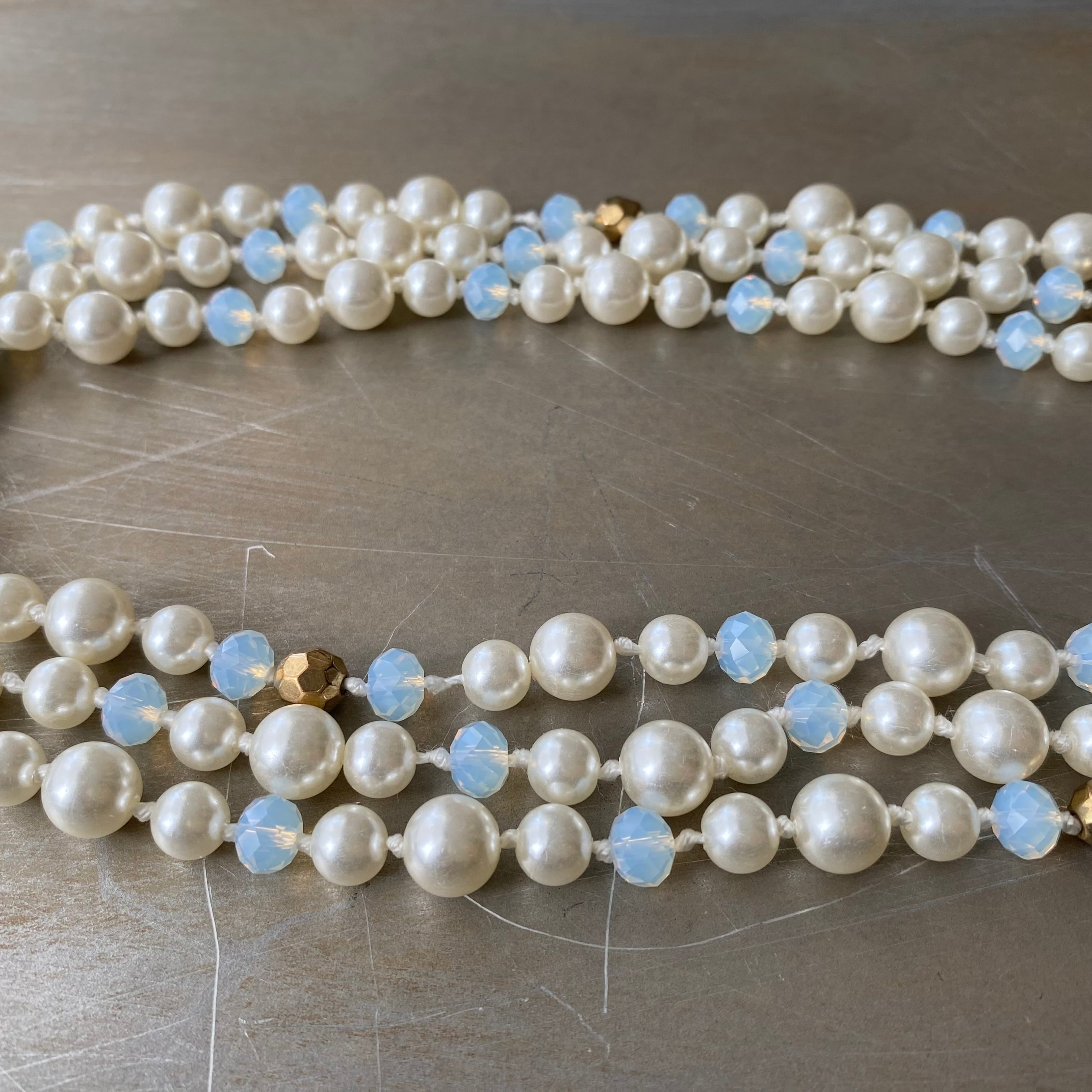 パールとビジューがマッチした華やかなデザインのUSAユーズドネックレス。オールノットのしっかりとした作りで、3連にするとボリューム感が出てより一層素敵な雰囲気になります。存在感がありパーティーシーンからカジュアルなスタイルまで幅広くお使いいただけます。