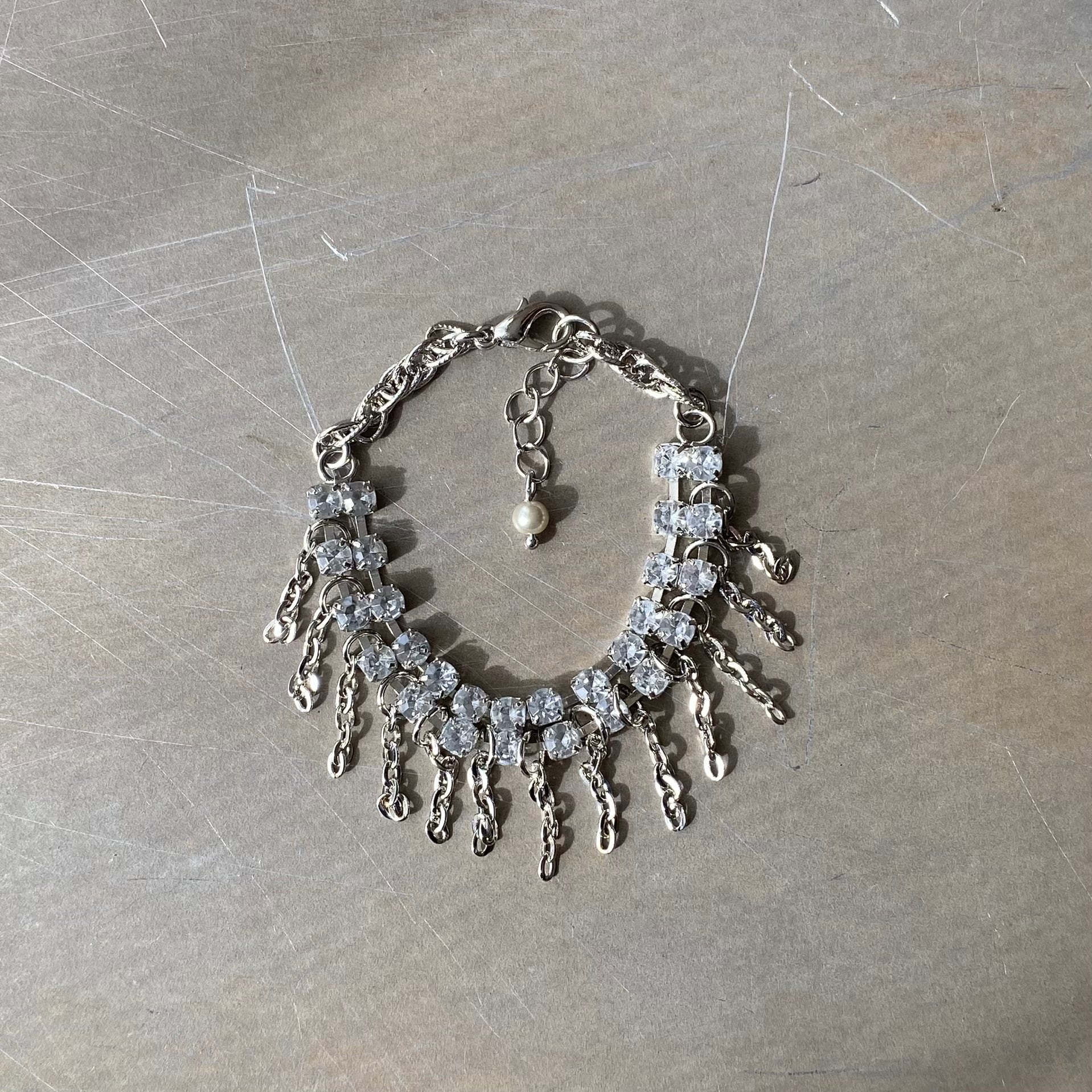 チェーンのタッセルが揺らめく個性的なデザインのヴィンテージブレスレット。ビジューがキラキラと輝きスタイリングにお洒落な雰囲気をプラスしてくれます。