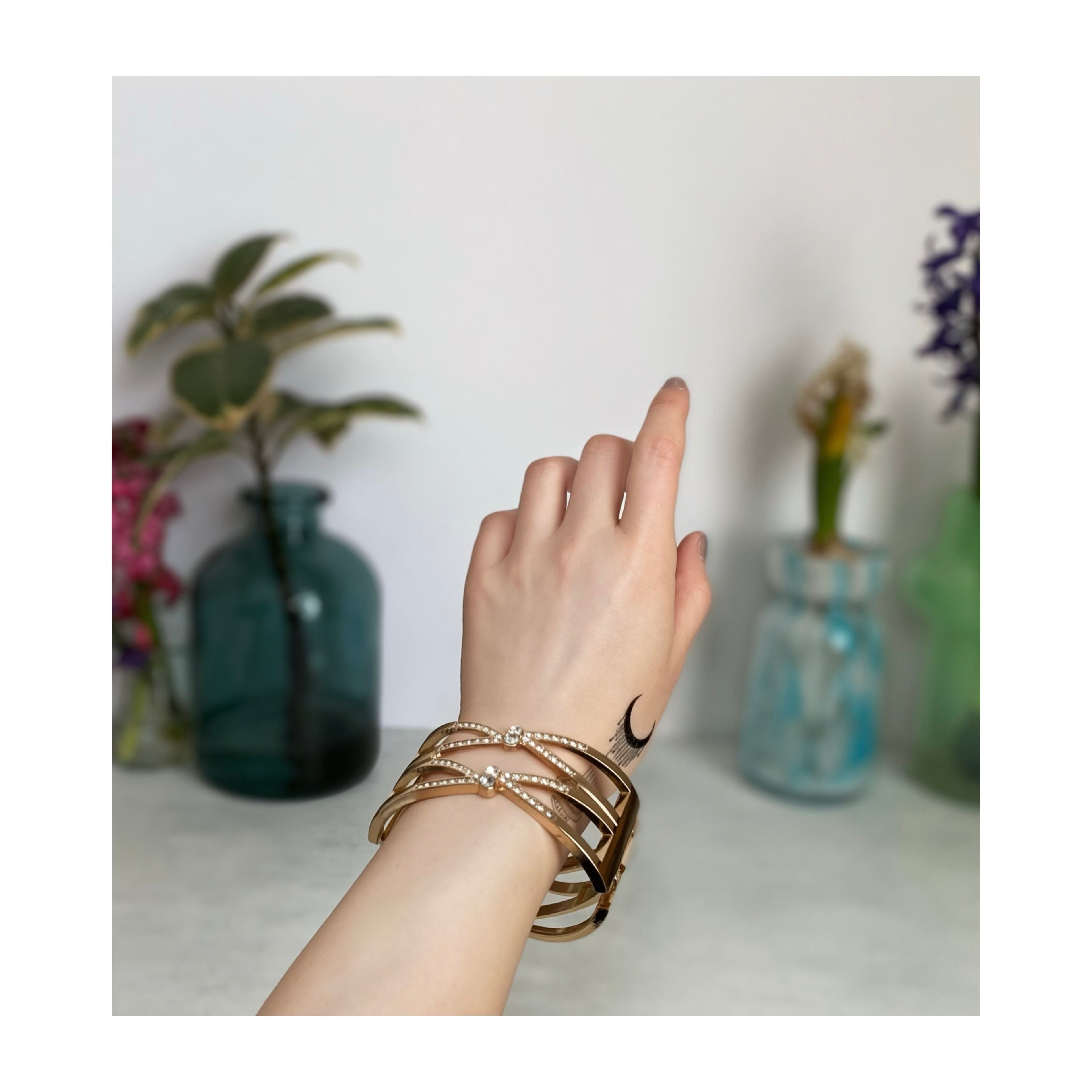 ビジューがキラキラと輝くスタイリッシュな雰囲気のUSAユーズドバングル。端の部分が開閉するタイプです。大ぶりで存在感がありスタイリングのアクセントにおすすめです。