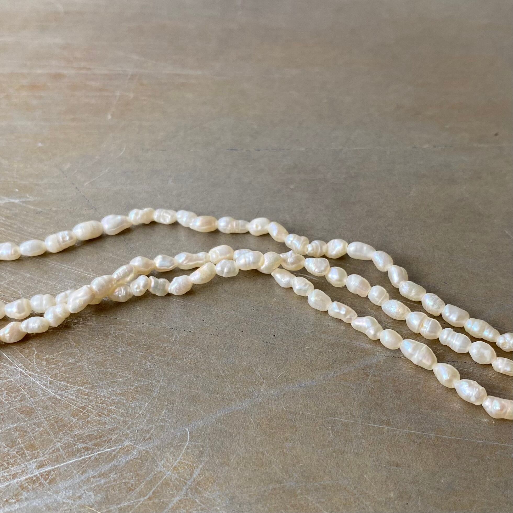 繊細な淡水パールが魅力的なヴィンテージネックレス。ほどよい存在感の3連タイプでラフな形のパールがお洒落な雰囲気。パーティーシーンからカジュアルなスタイルまで幅広く合わせていただけます。