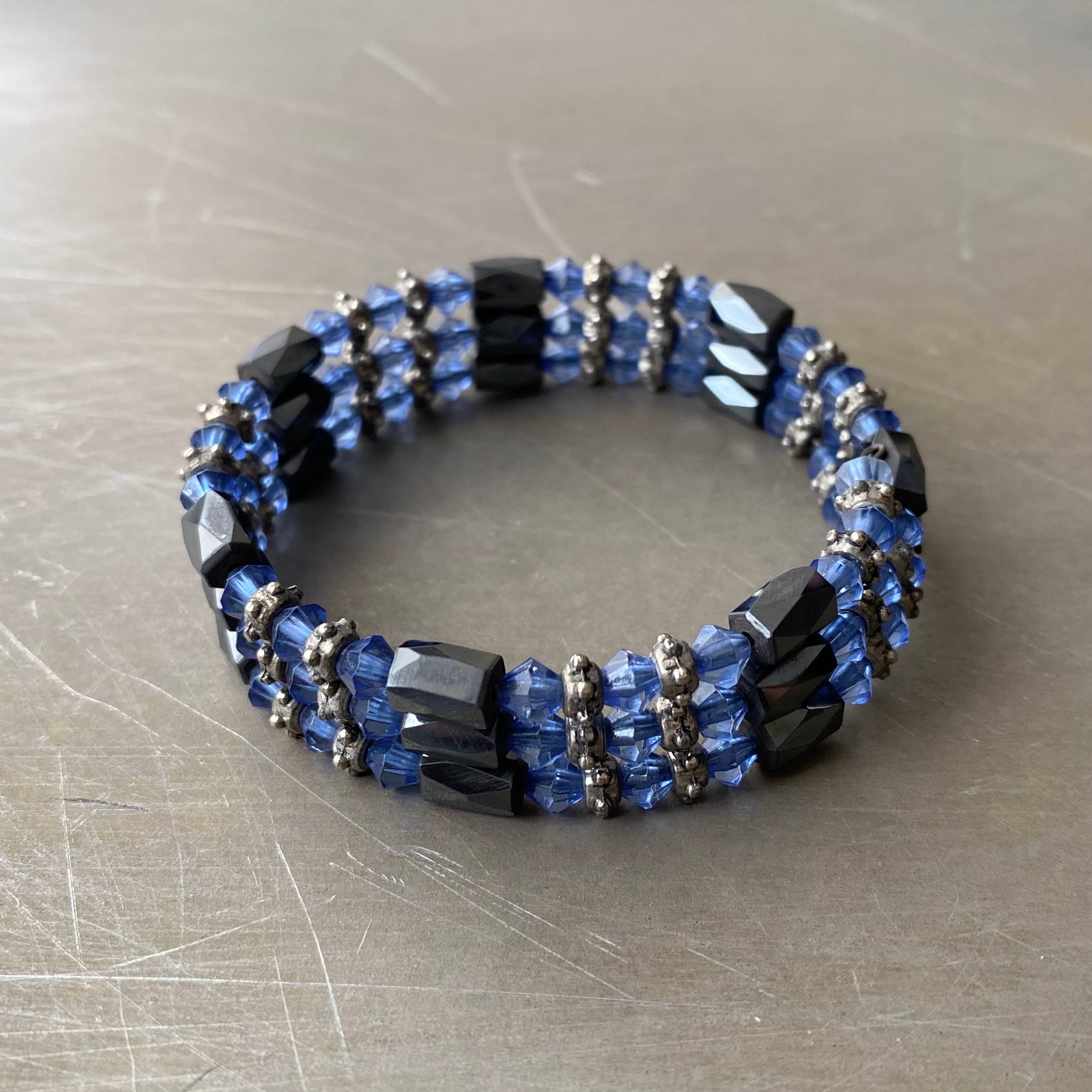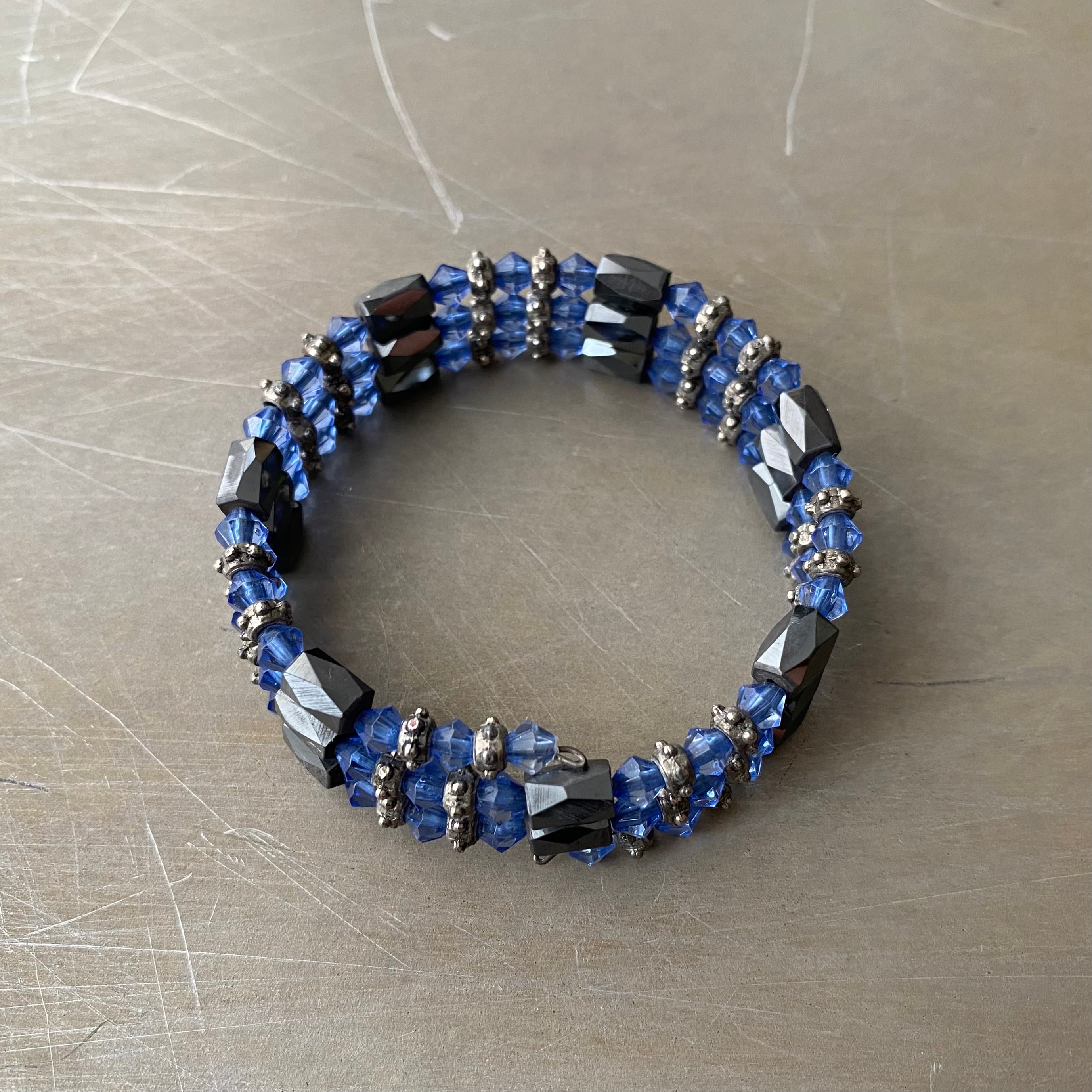 スタイリッシュな雰囲気のUSAヴィンテージブレスレット。ブルーのビジューと磁気を帯びた天然石「ヘマタイト」がマッチしたクールなデザイン。中にワイヤーが通っているのでお好きなサイズに調整してお使いいただけます。
