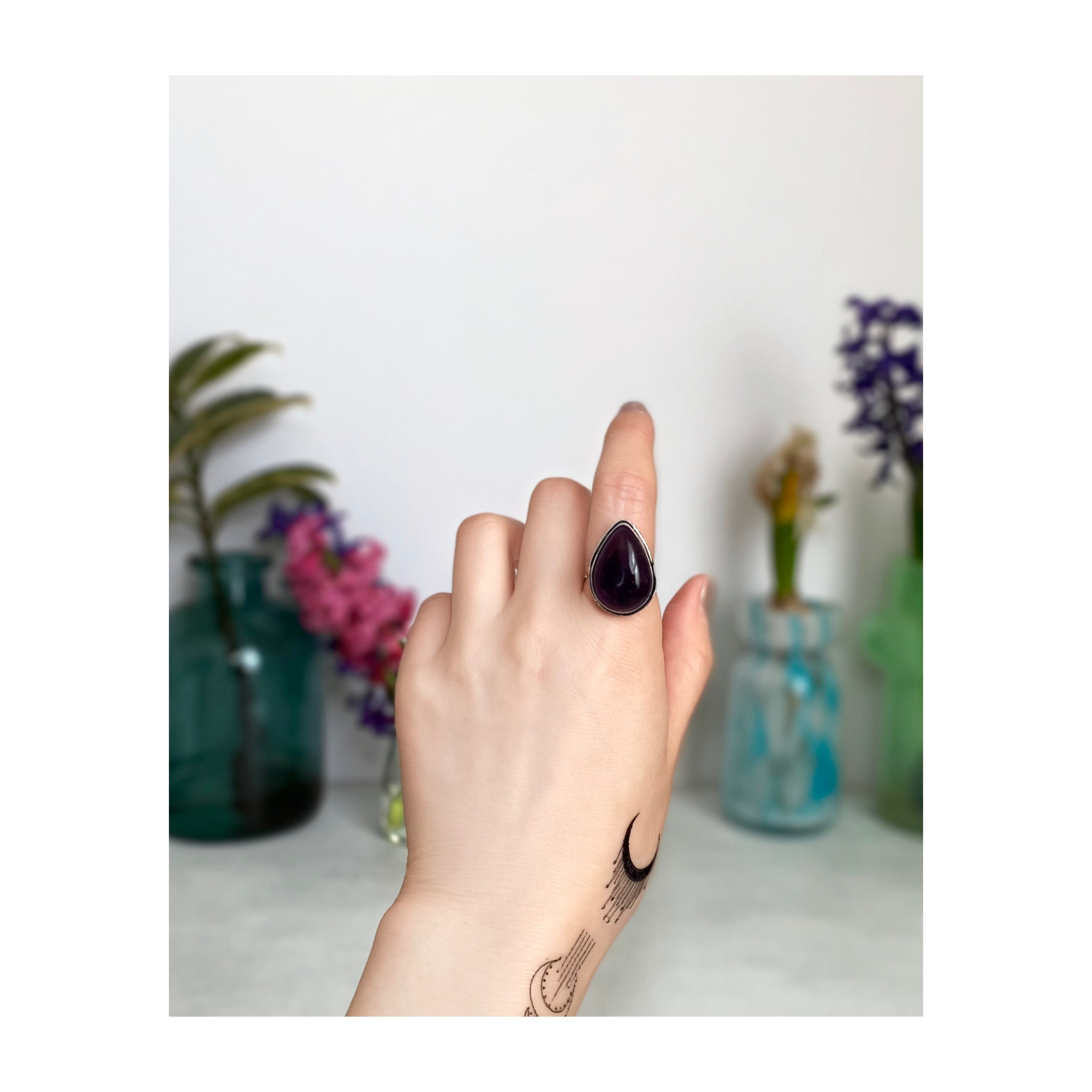 深みのあるパープルカラーが魅力的な天然石リング。2月の誕生石「アメジスト」は、持つ人に安らぎと癒しをもたらすと言い伝えられています。ほどよく存在感があり古着など様々なスタイルに合わせていただけます。