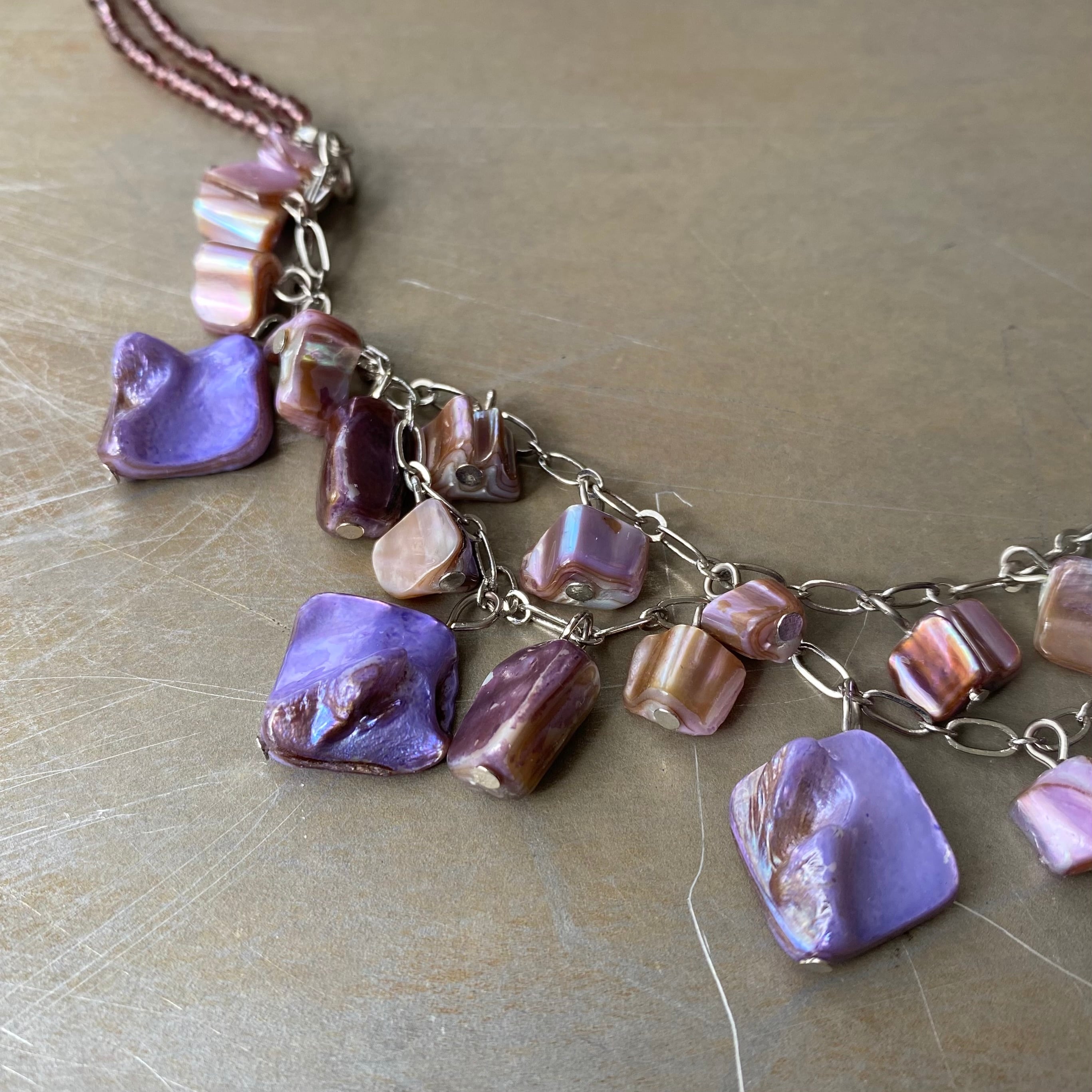 パープルカラーのシェルが揺らめく個性的な雰囲気のUSAヴィンテージネックレス。ボリューム感がありお顔まわりを華やかに彩ってくれます。