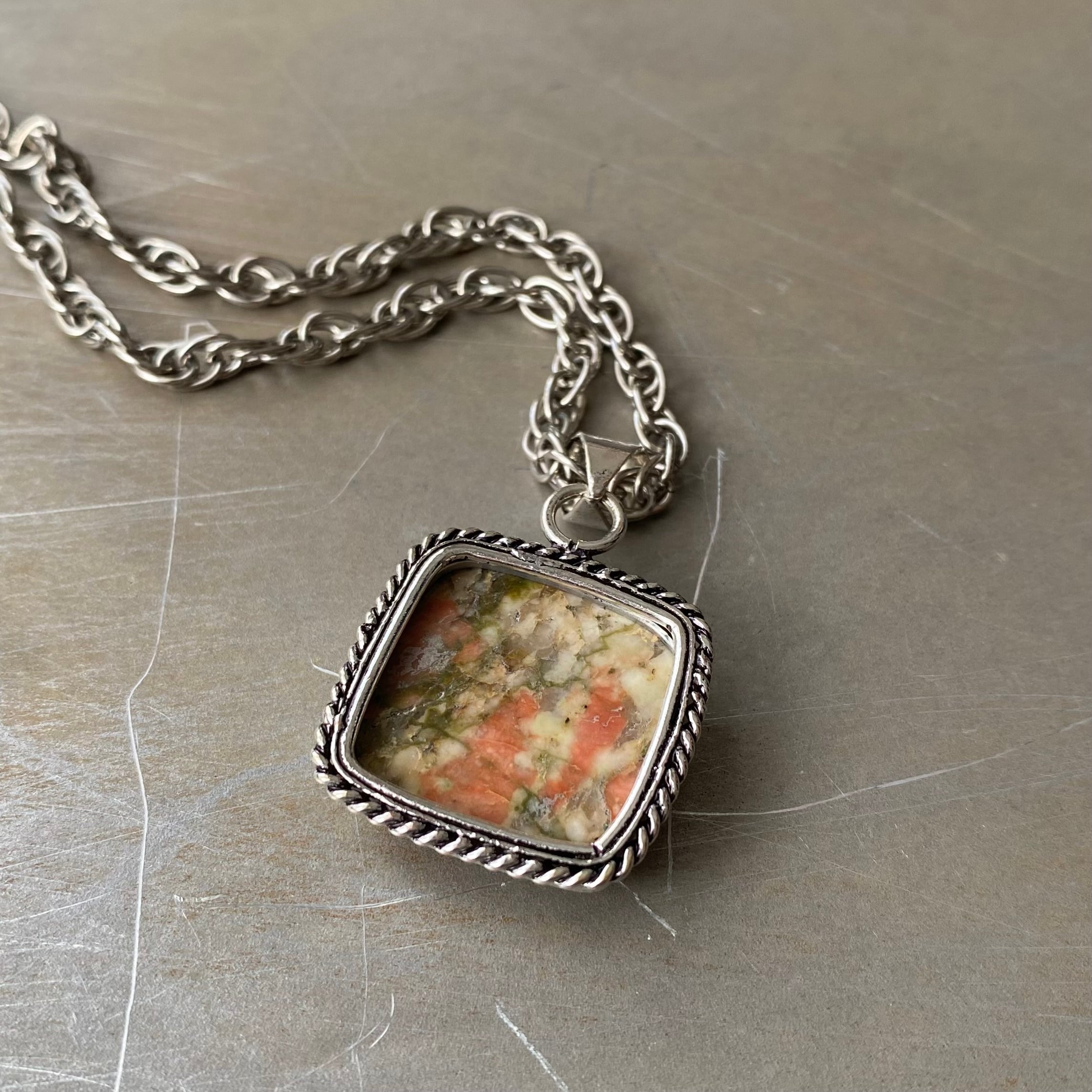 複数の鉱物が混じりあってできた独特の色合いが魅力的な天然石ネックレス。「ユナカイト」は、心の傷を癒やし未来への希望を与えてくれると言い伝えられています。大ぶりで存在感がありコーディネートのアクセントに。古着やユニセックスなスタイルにもオススメです。