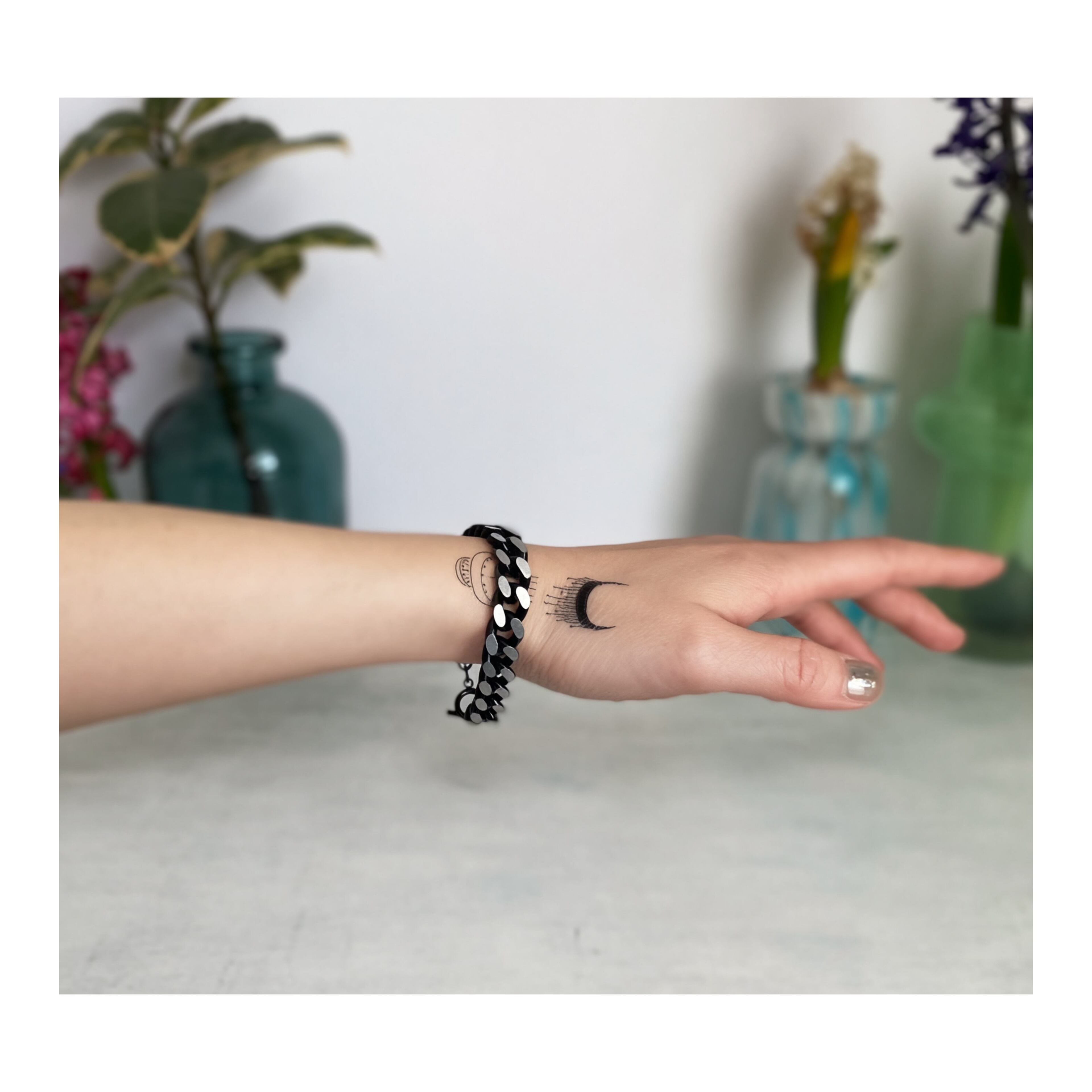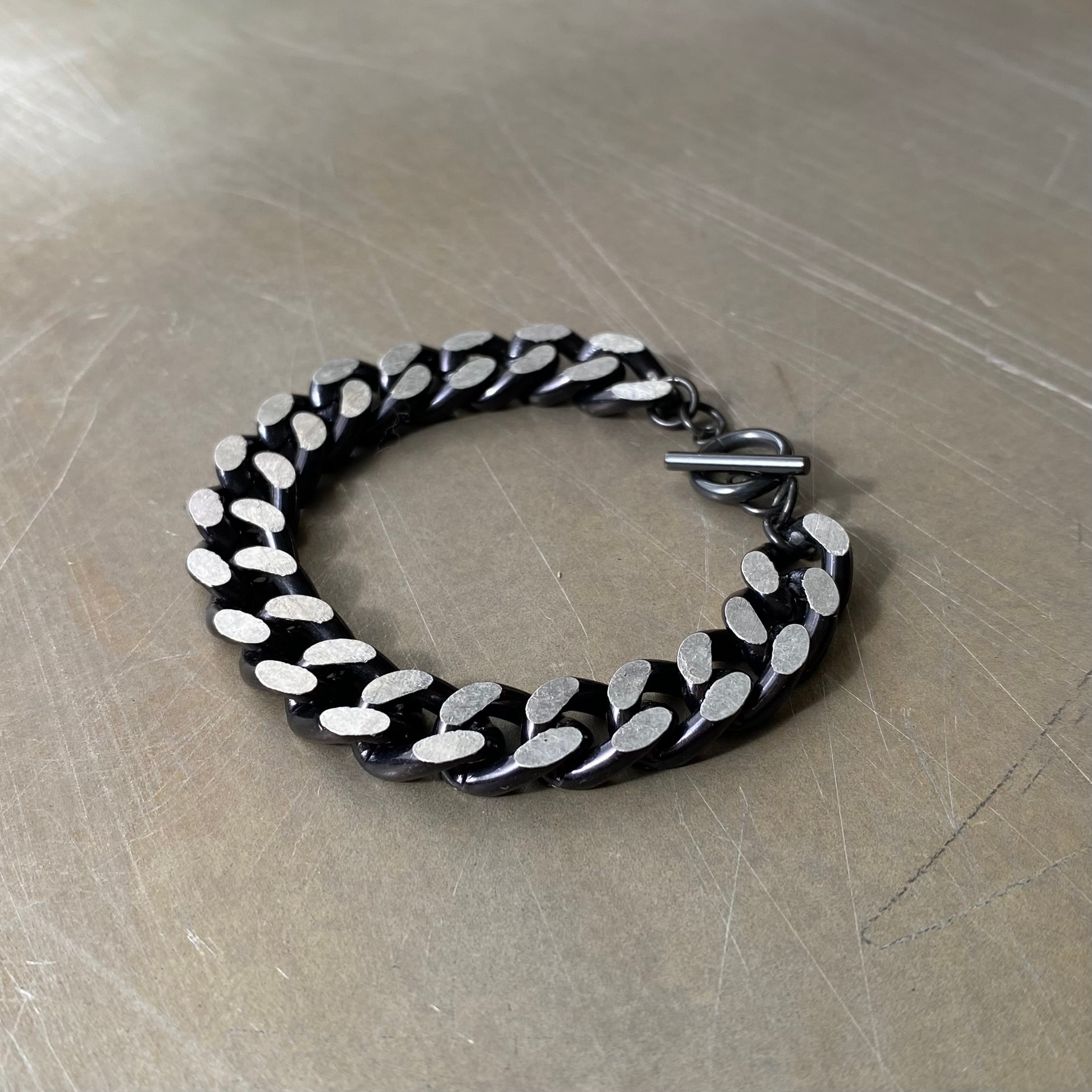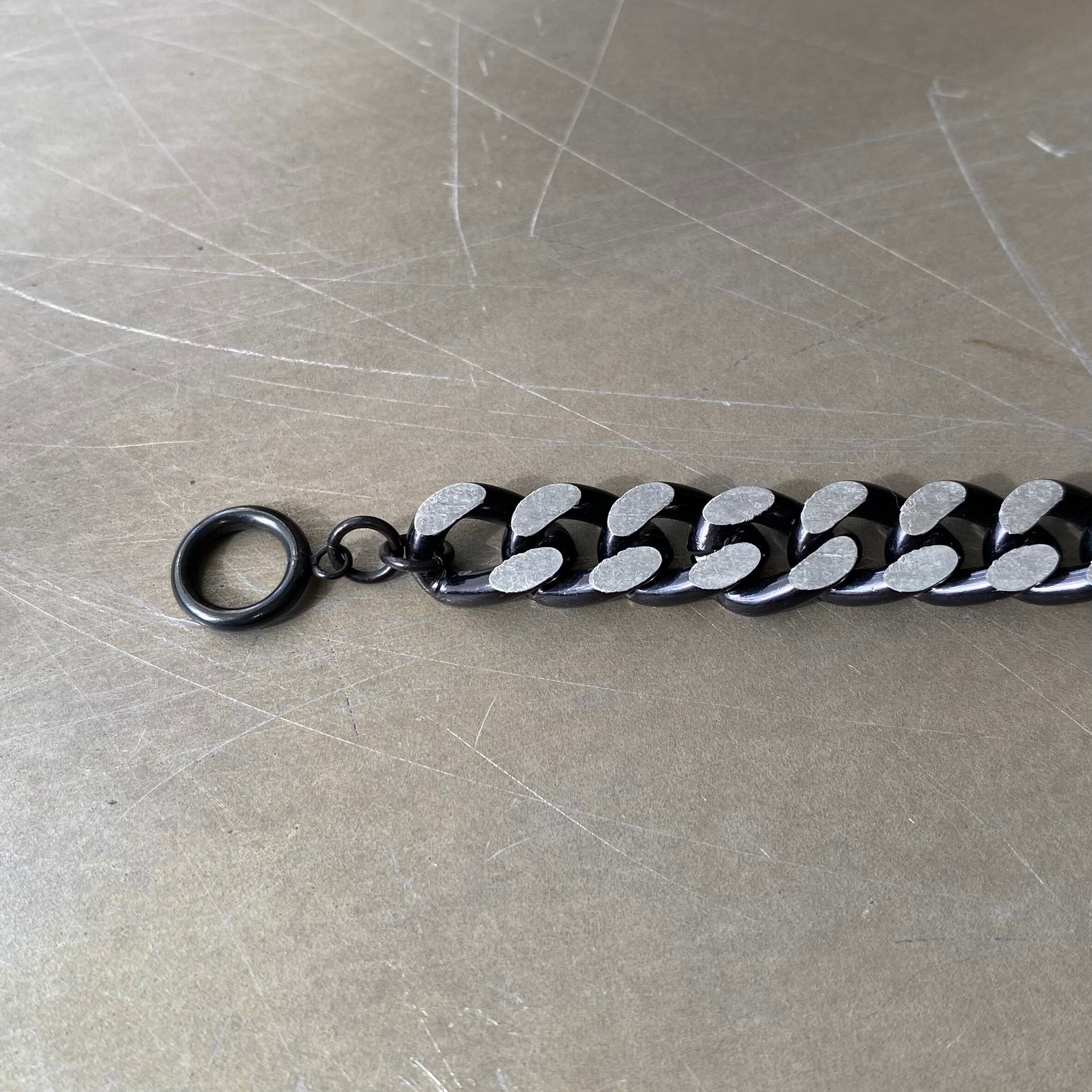 ブラック×シルバーの色合いがクールなヴィンテージチェーンブレスレット。着脱のしやすいマンテル金具がポイント。シンプルながら個性的なデザインでスタイリングにお洒落な雰囲気をプラスしてくれます。