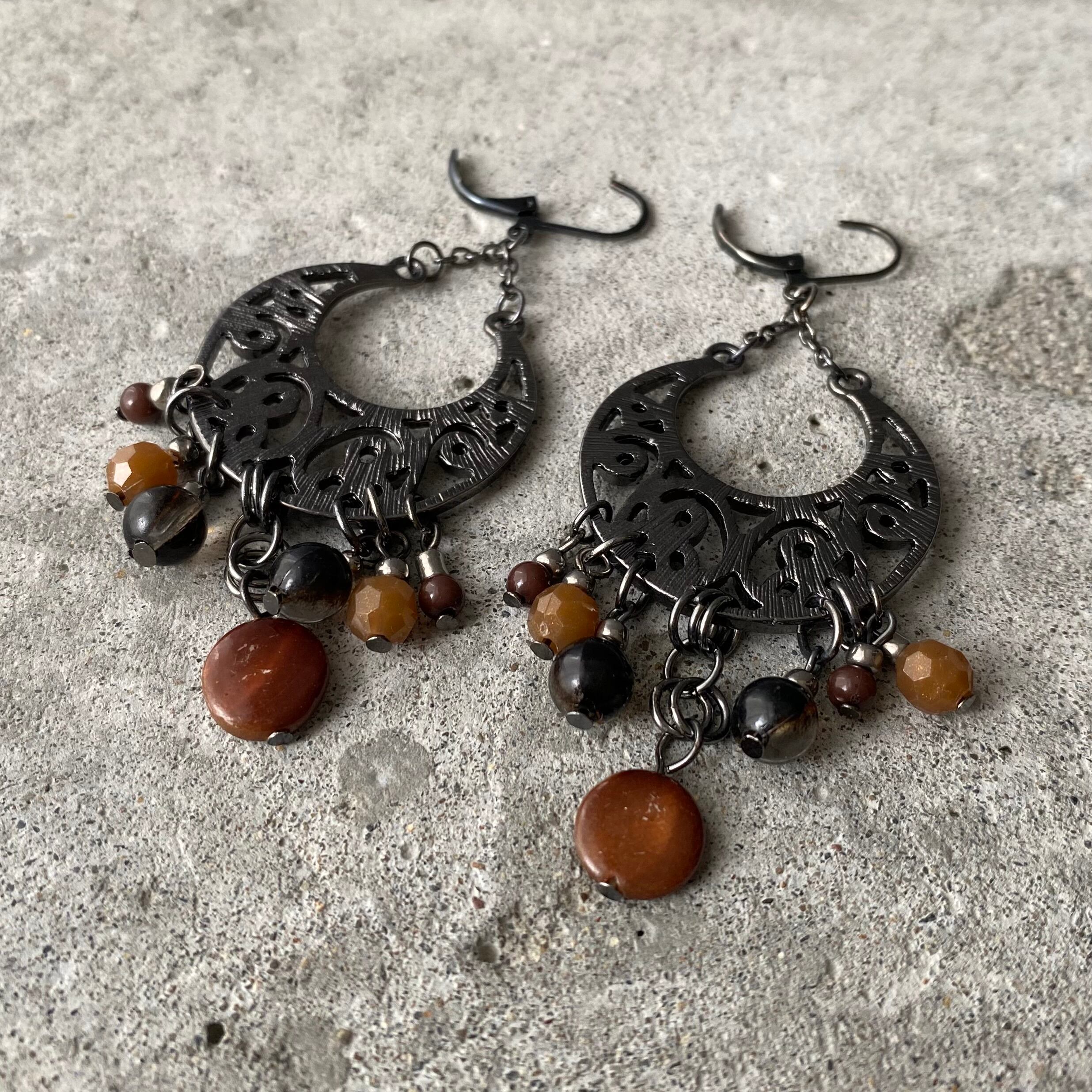 ブラックのメタルに落ち着いた色合いのビーズがマッチした個性的なデザインのUSAユーズドピアス。大ぶりで存在感がありスタイリングのアクセントにおすすめです。