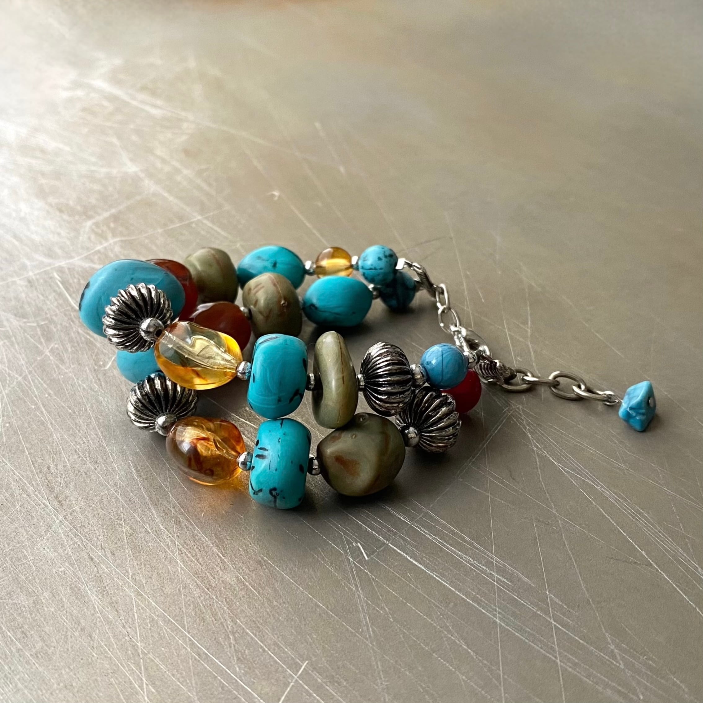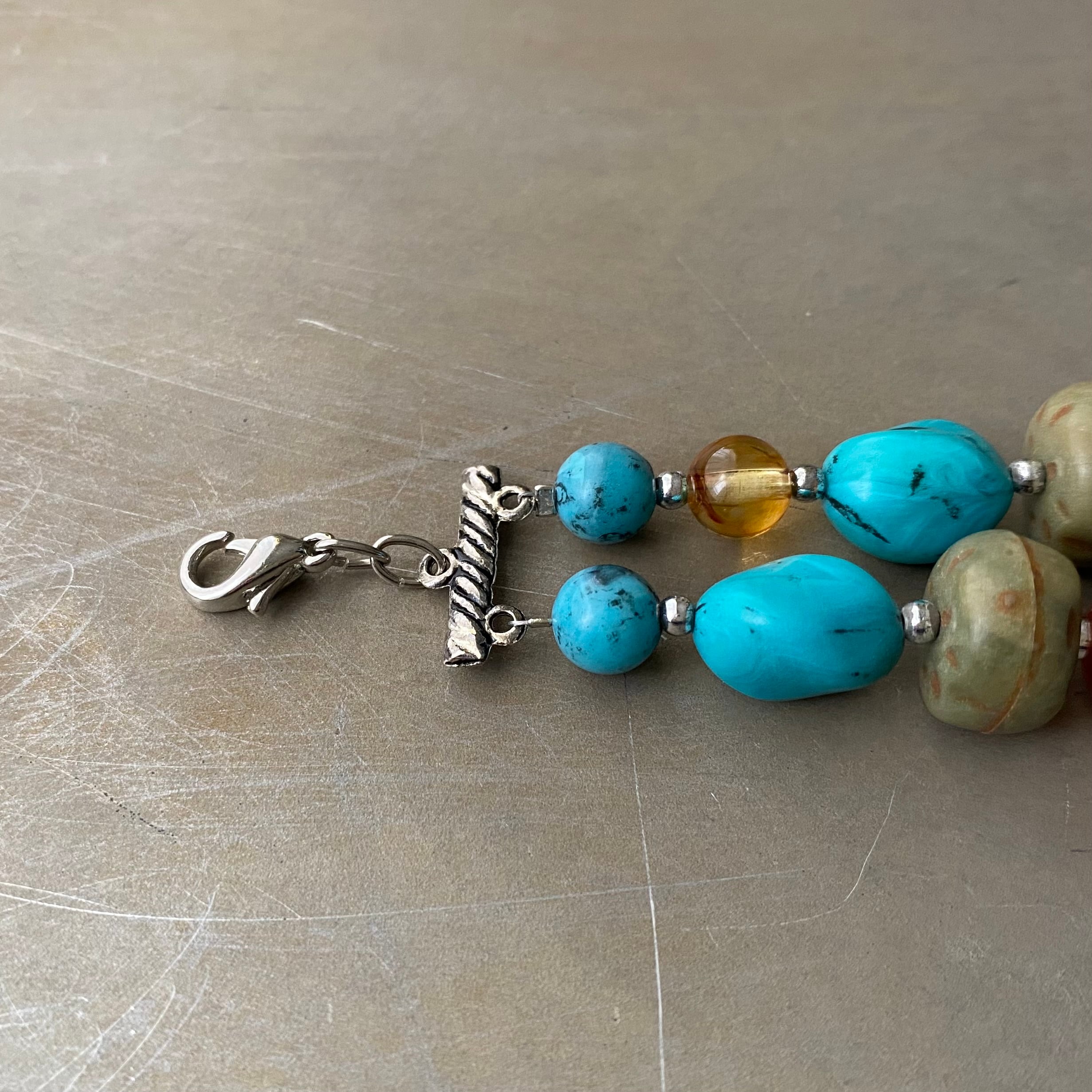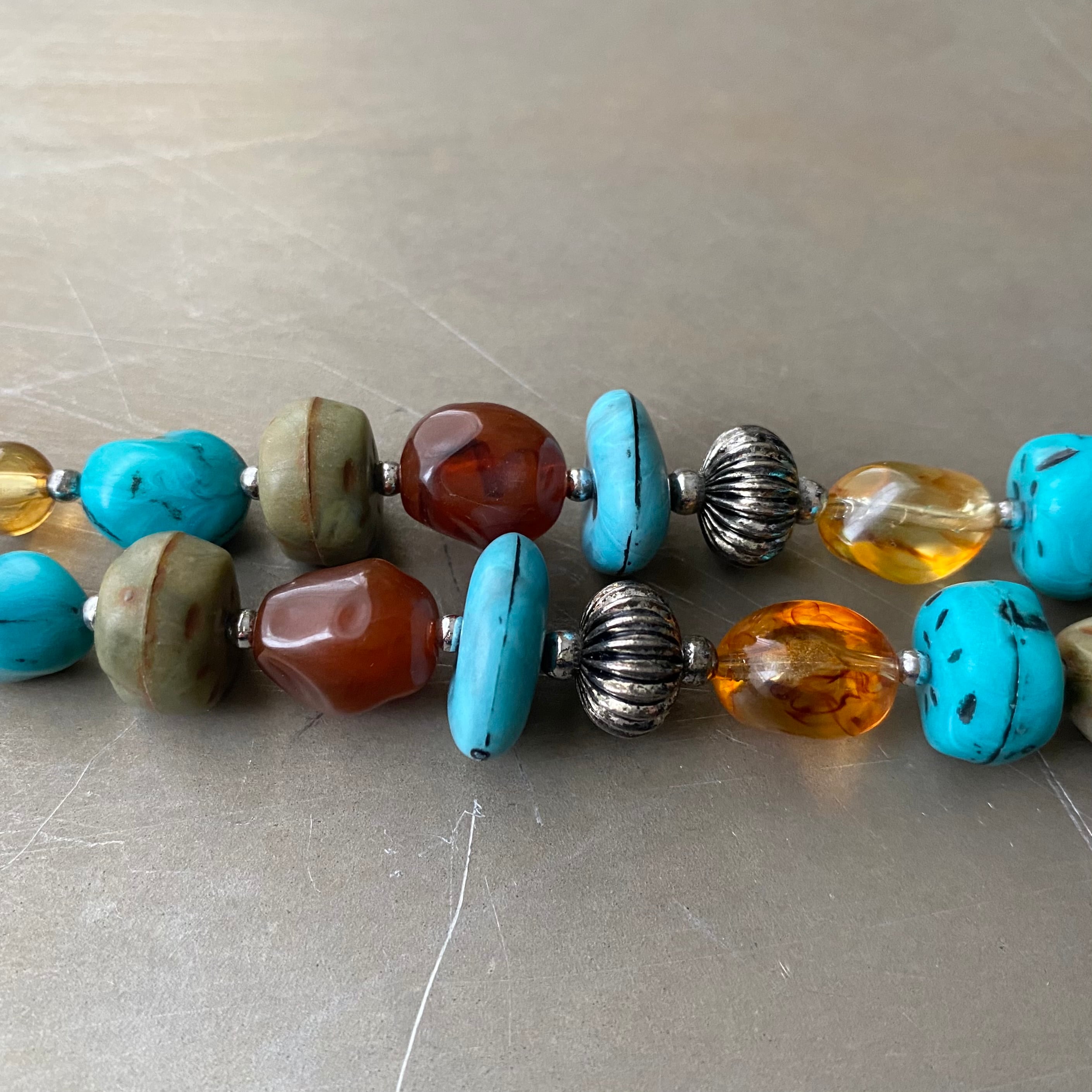 まるで天然石のようなラフカットのビーズが魅力的なUSAヴィンテージブレスレット。ヴィンテージならではのレトロな色合いがお洒落な雰囲気。存在感がありスタイリングを明るく彩ってくれます。