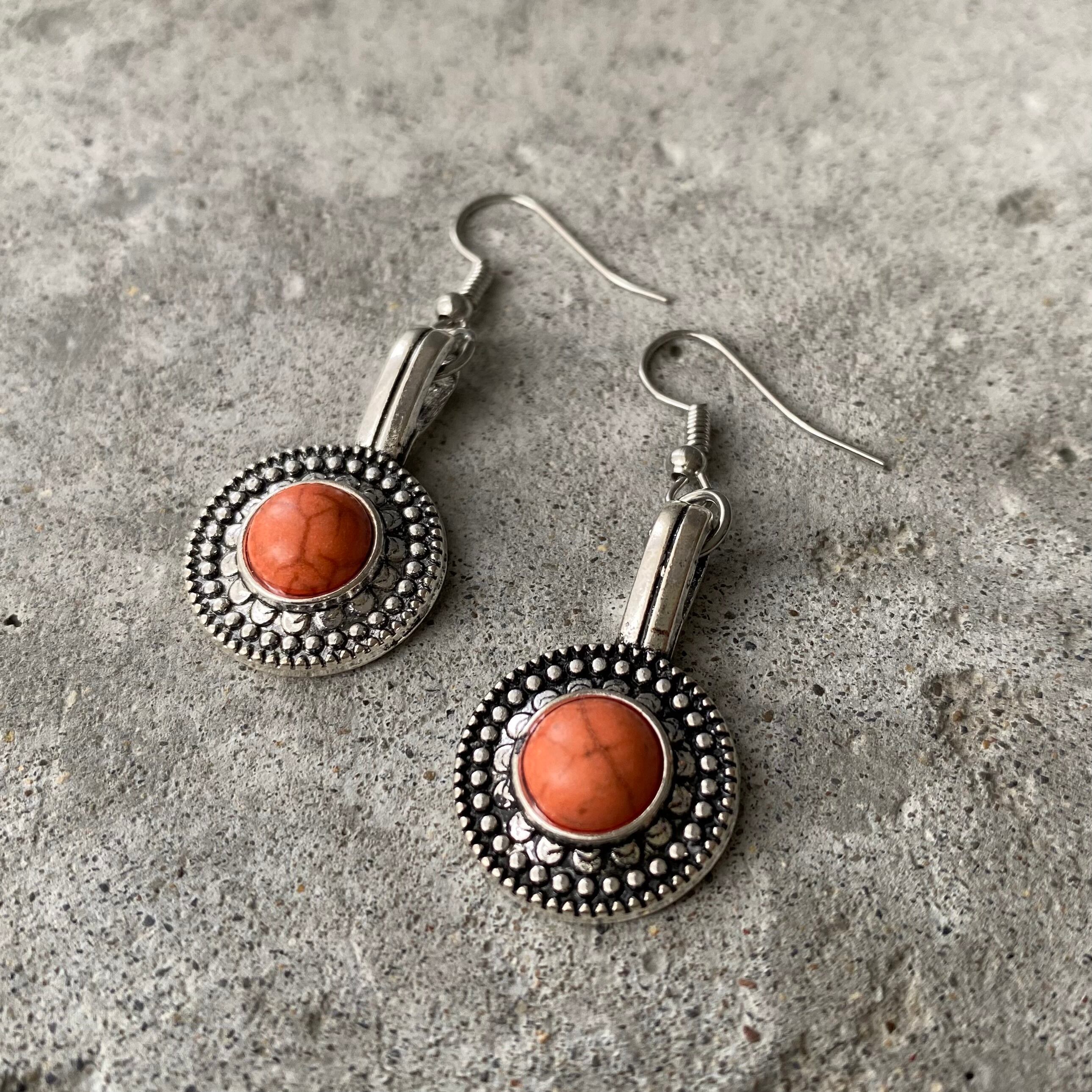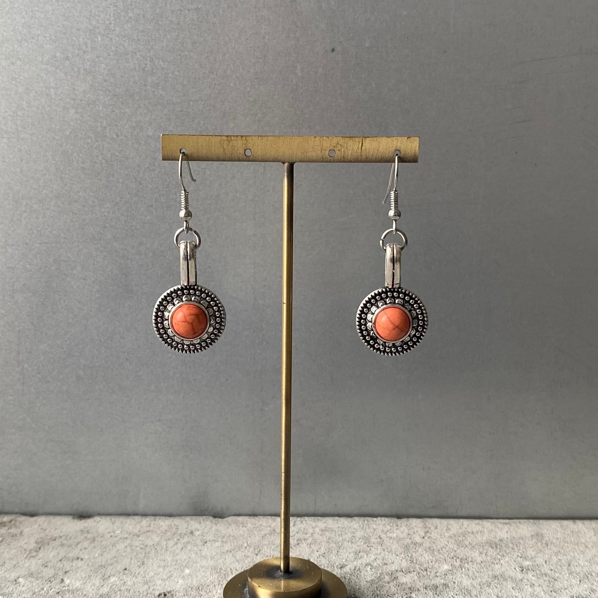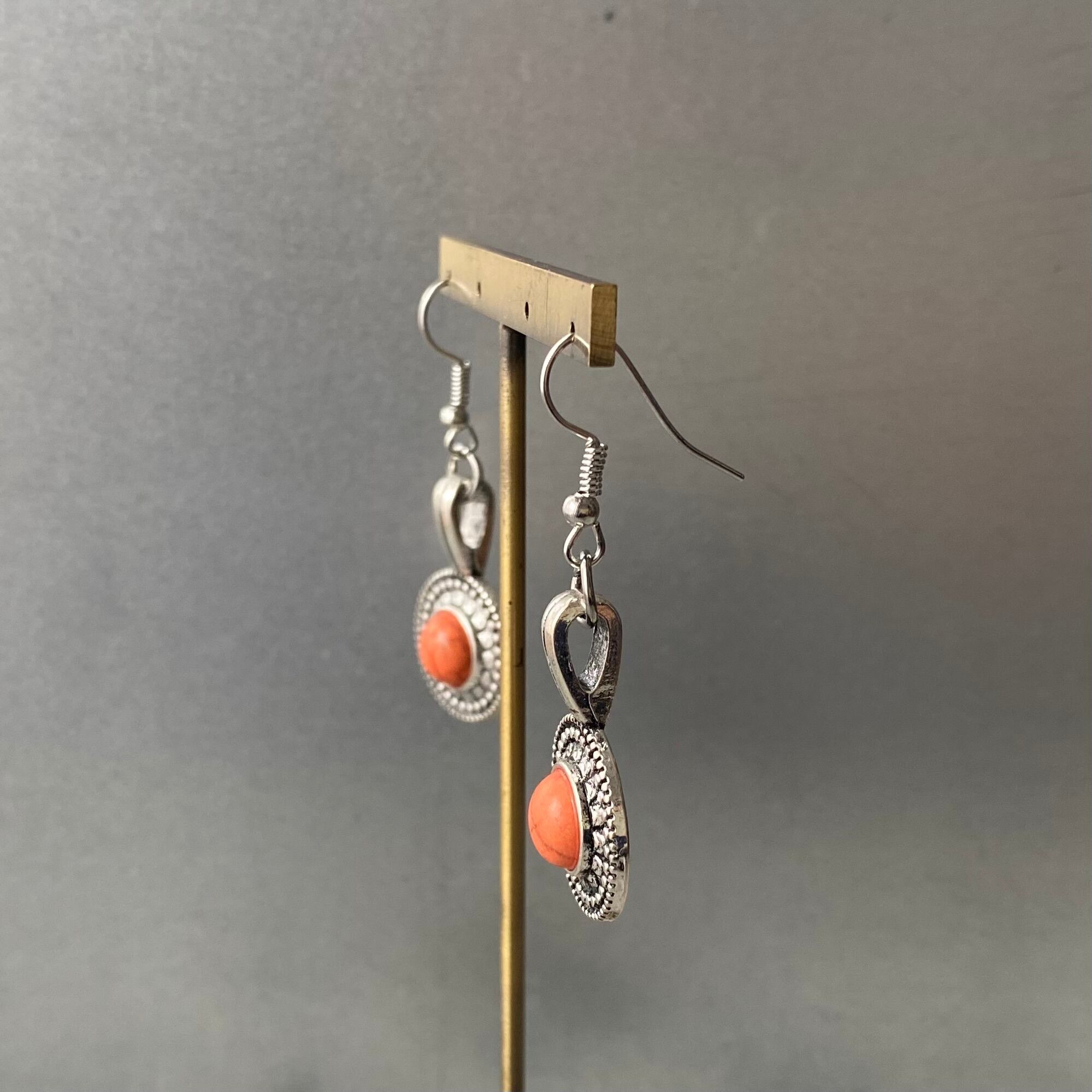 エスニックなメタルパーツにコーラルカラーのストーンが映えるUSAユーズドピアス。スタイリングの差し色になり古着コーデにもおすすめです