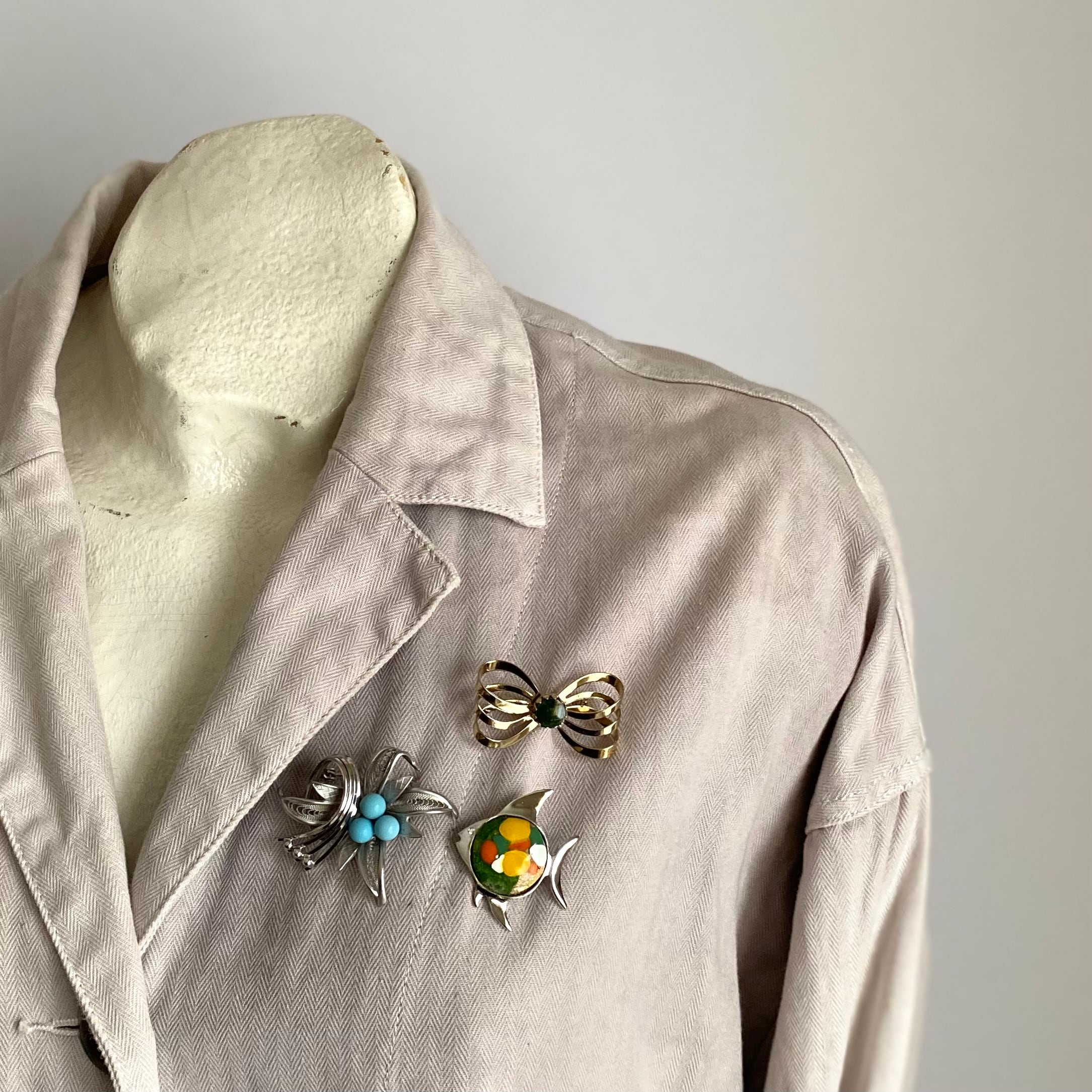 クラシカルな雰囲気が魅力的なボタニカルモチーフのヴィンテージブローチ。軽やかで繊細なフィリグラーナデザインにライトブルーのストーンが映えるエレガントな作り。身につけやすいサイズ感でジャケットやストール等のアクセントにおすすめです。