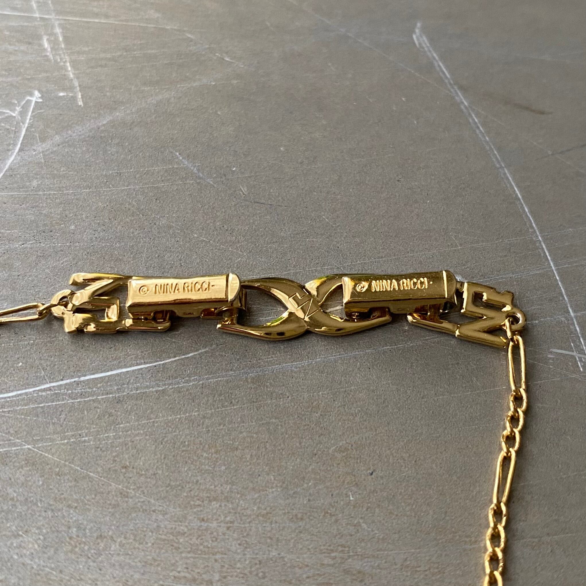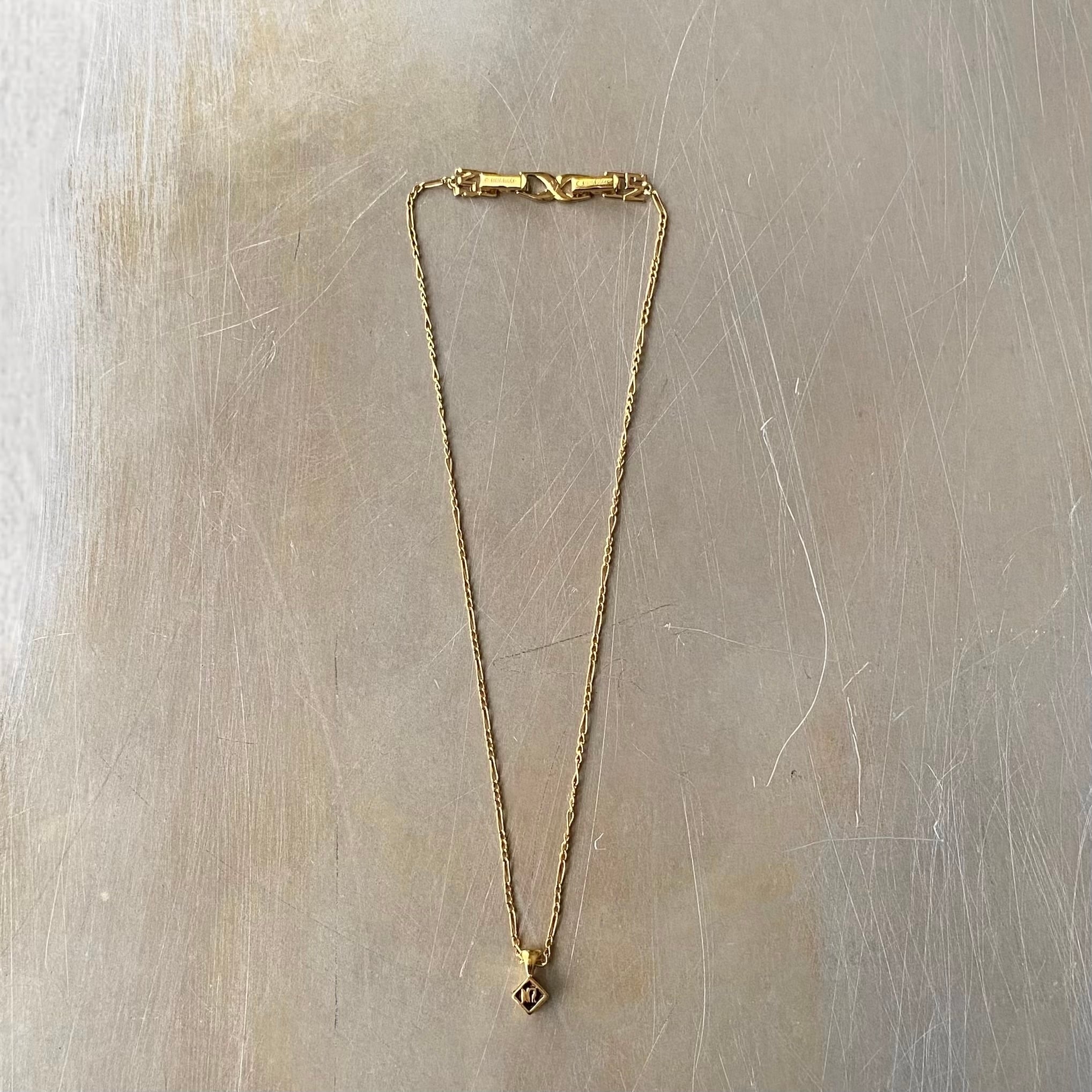 1932年にパリで創業された「ニナ リッチ」のUSAヴィンテージネックレス。小さなキューブ型のチャームに黒いエナメルが施され、ゴールドのブランドロゴが映えるシンプルながらお洒落なデザインです。身につけやすいサイズ感で様々なスタイルに合わせていただけます。