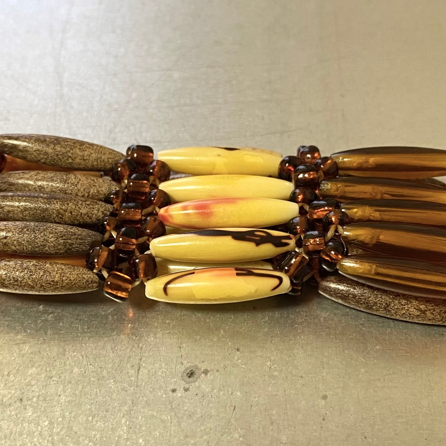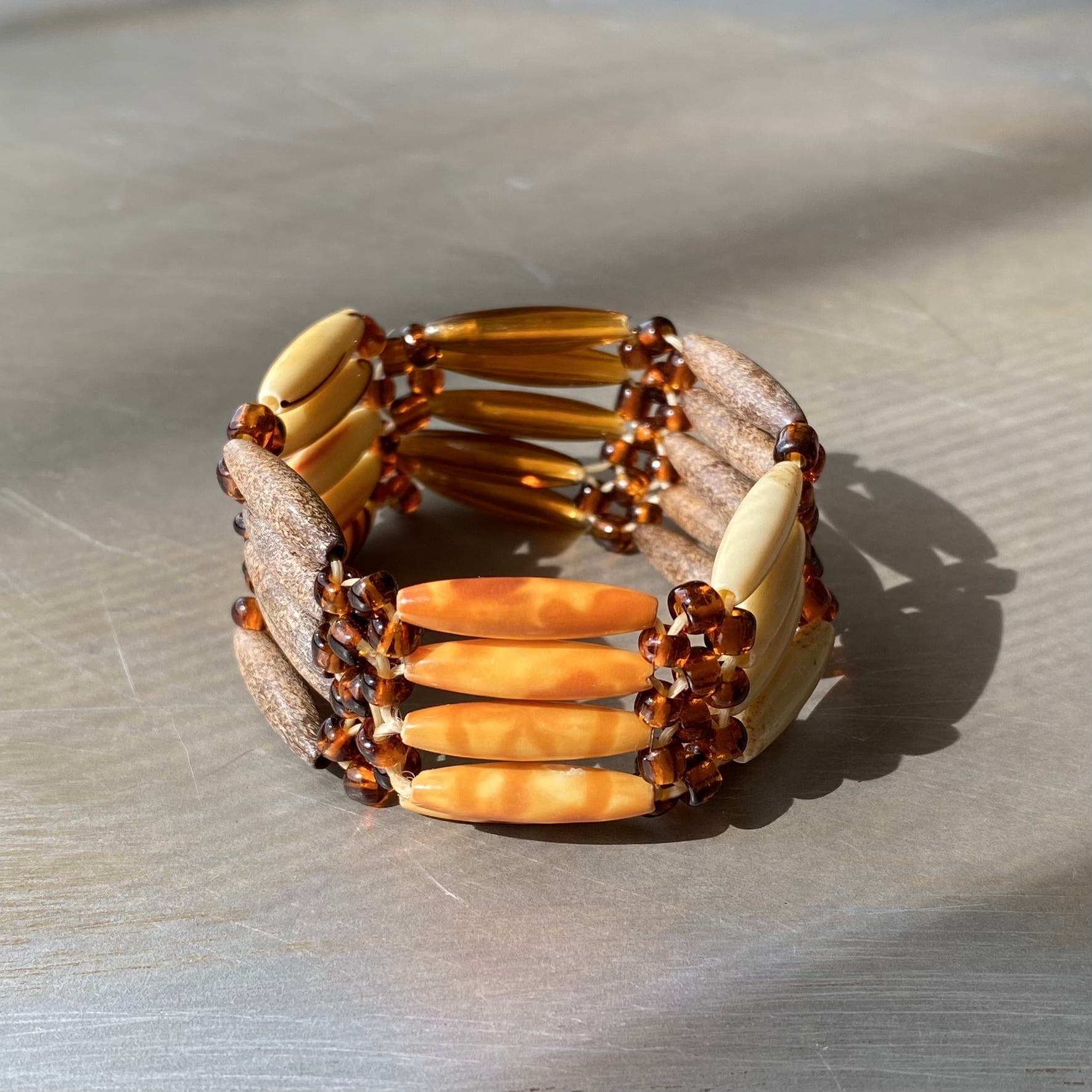 ボヘミアンな雰囲気のUSAヴィンテージブレスレット。内側にはゴムが通っており、簡単に着脱していただけます。存在感がありシンプルなスタイルをお洒落に彩ってくれます。