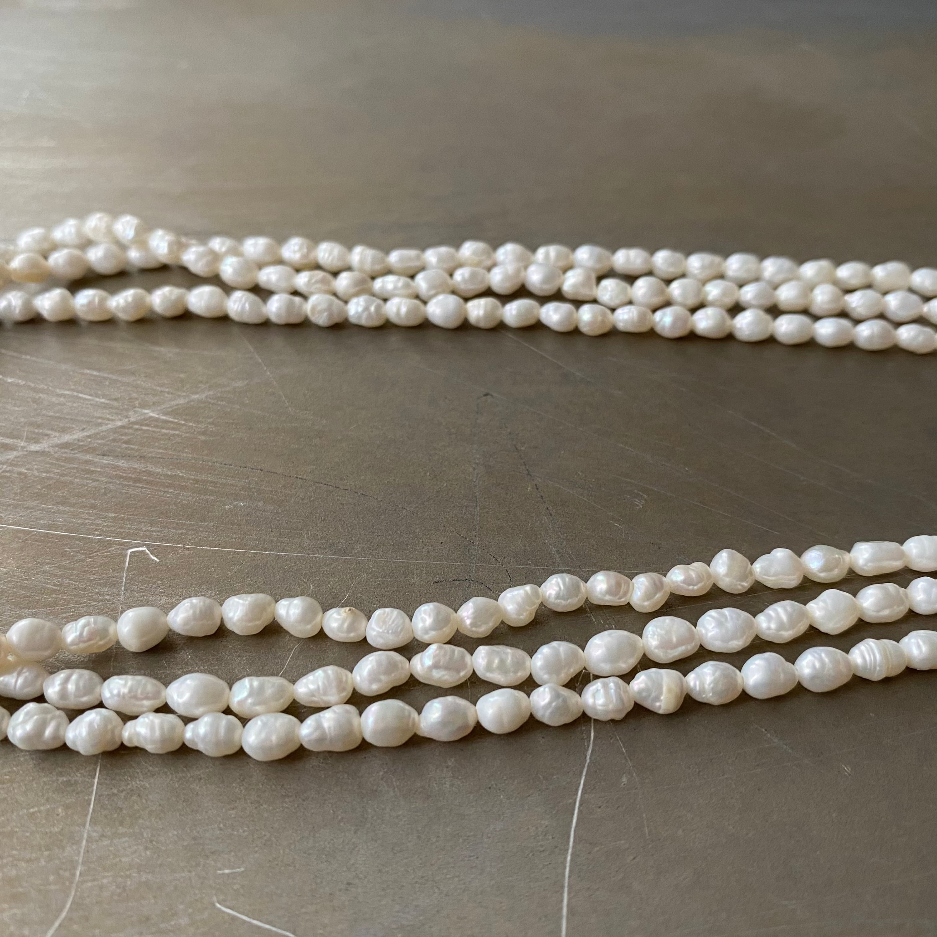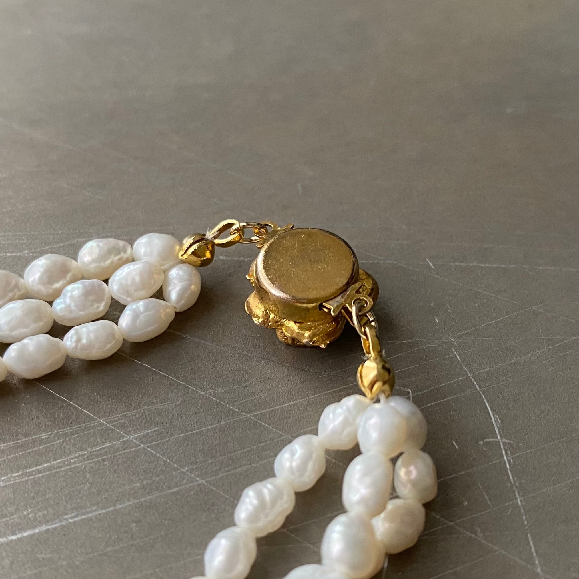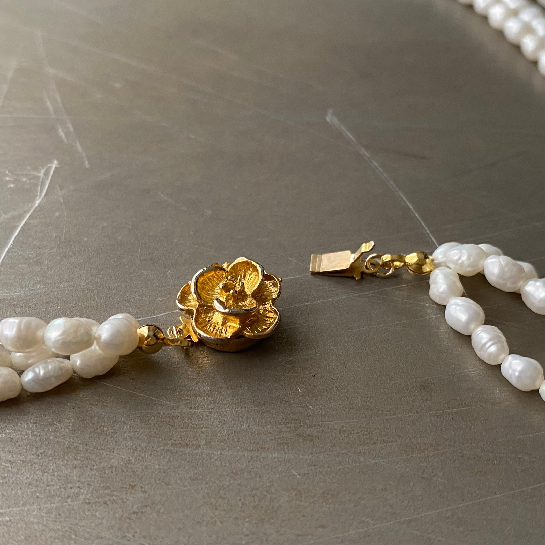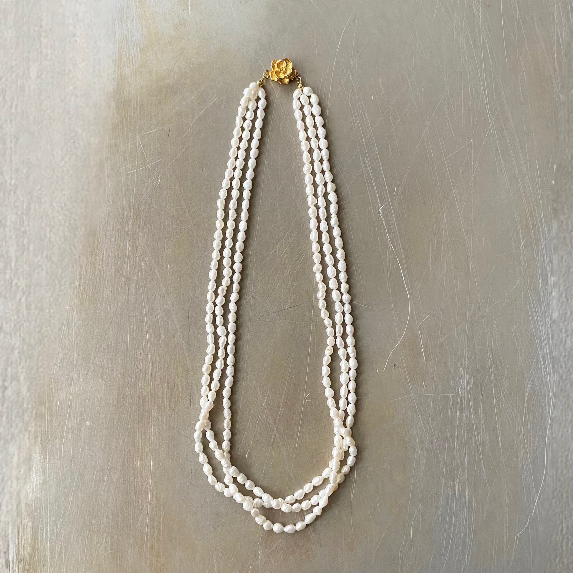 ふぞろいな形の淡水パールが魅力的なヴィンテージネックレス。フラワーモチーフのレトロな金具が素敵なポイント。2連タイプの美しいパールがお顔まわりを華やかな雰囲気にしてくれます。パーティーシーンからカジュアルなスタイルまで幅広く合わせていただけるアイテムです。