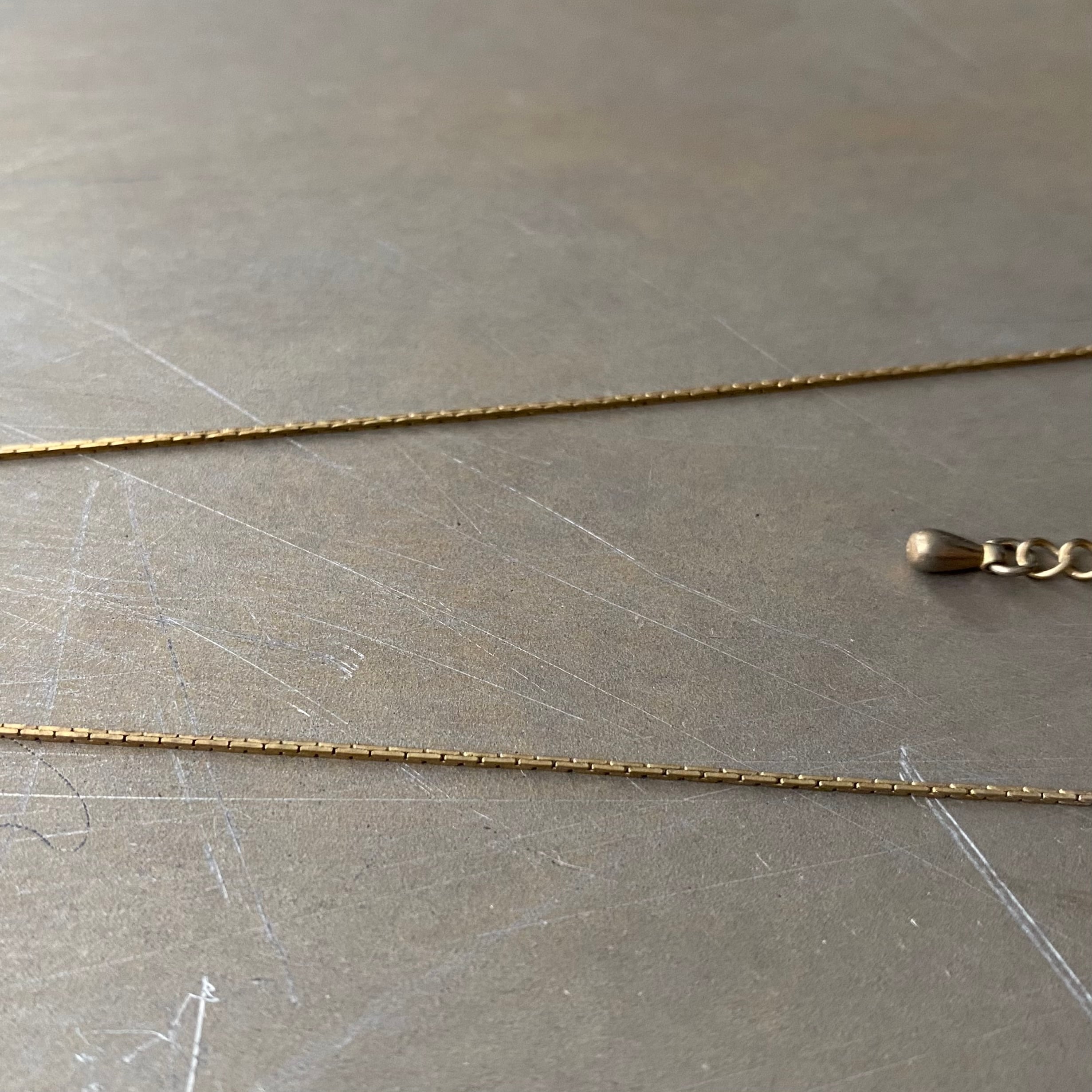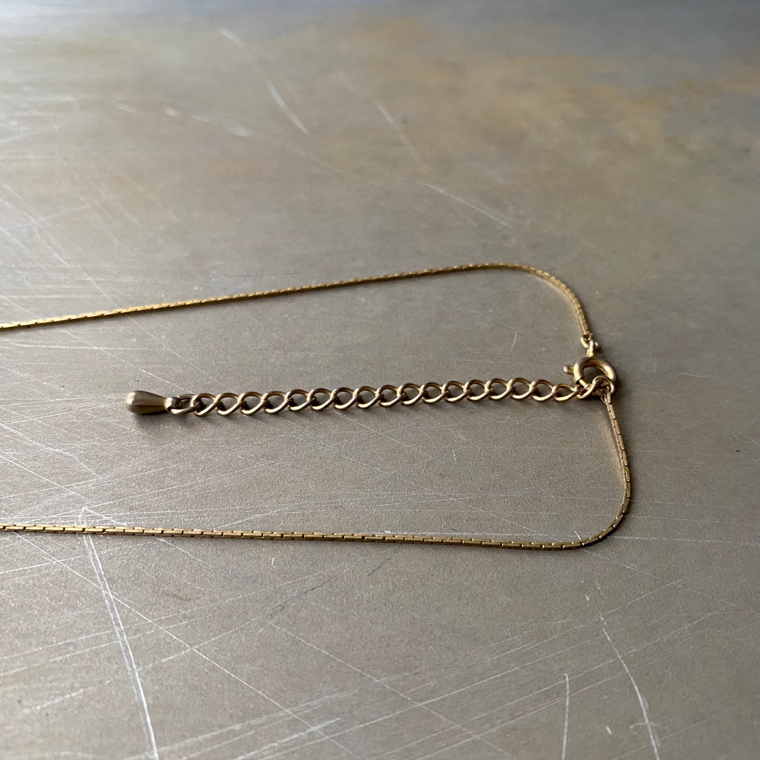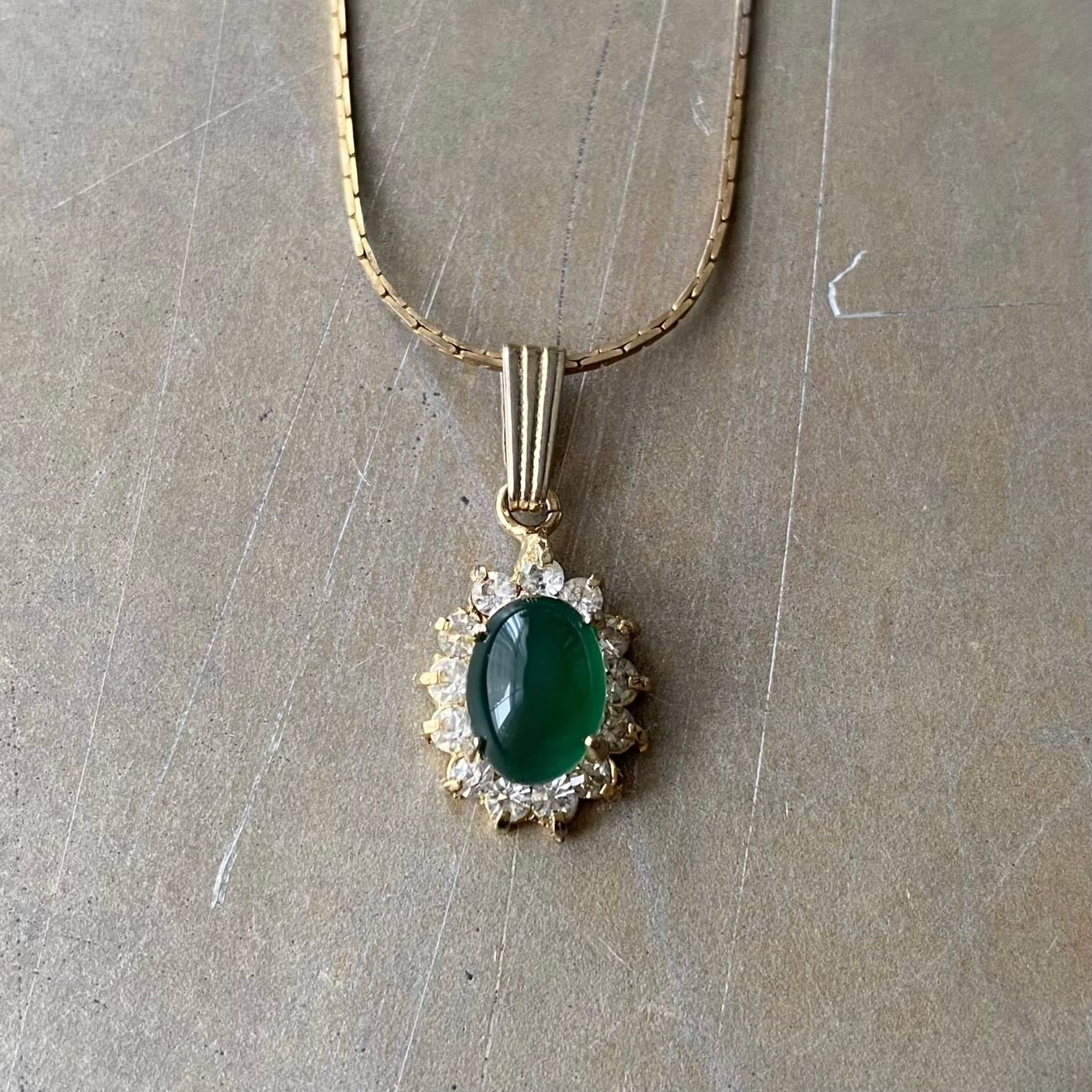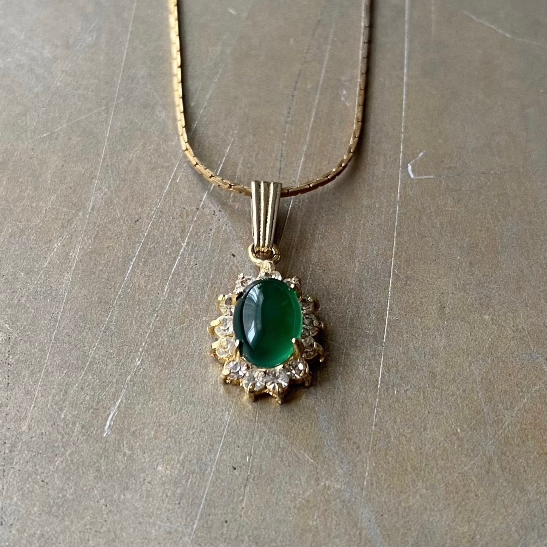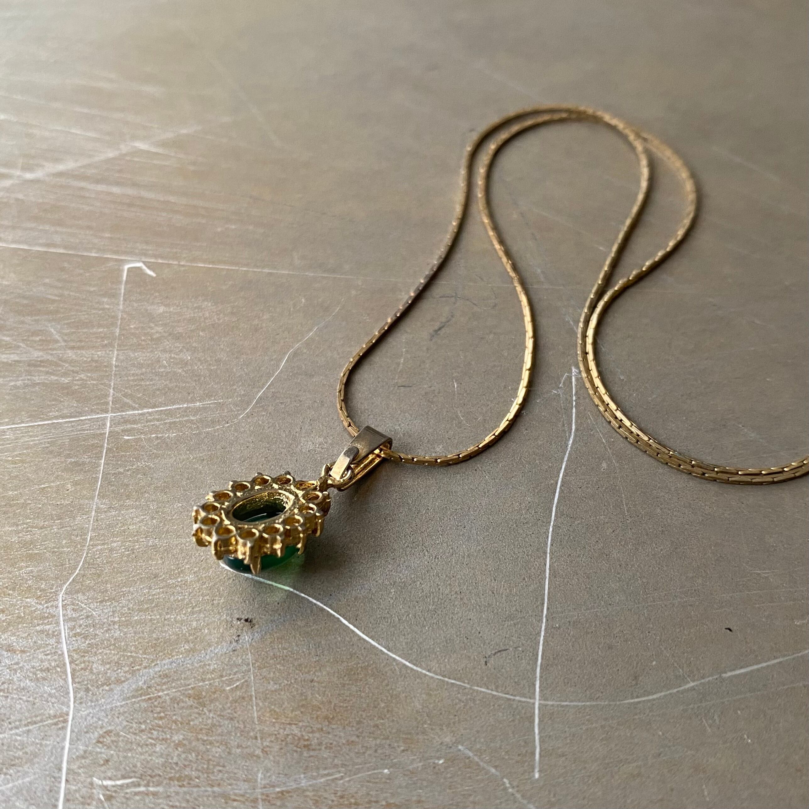 美しいグリーンのストーンが輝くヴィンテージネックレス。古びたメタルの色合いや細身の繊細なチェーンが魅力的。身につけやすいサイズ感で様々なスタイルに合わせていただけます。