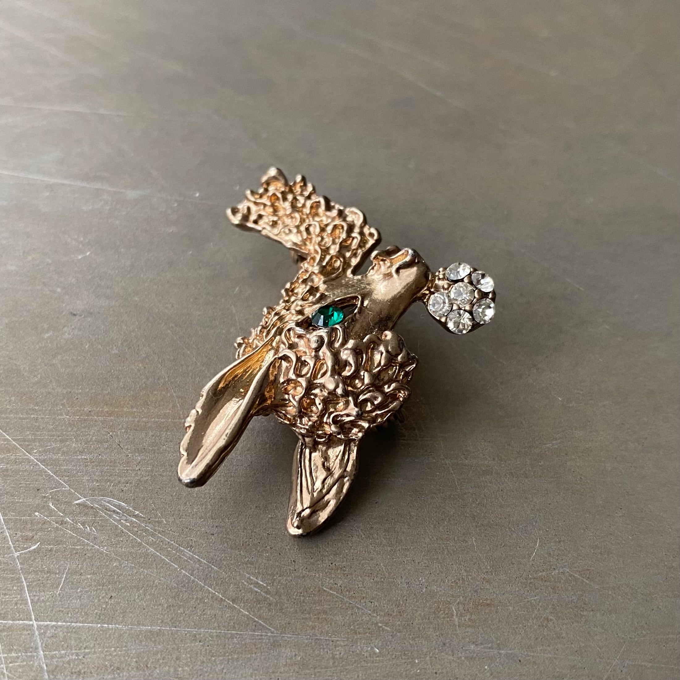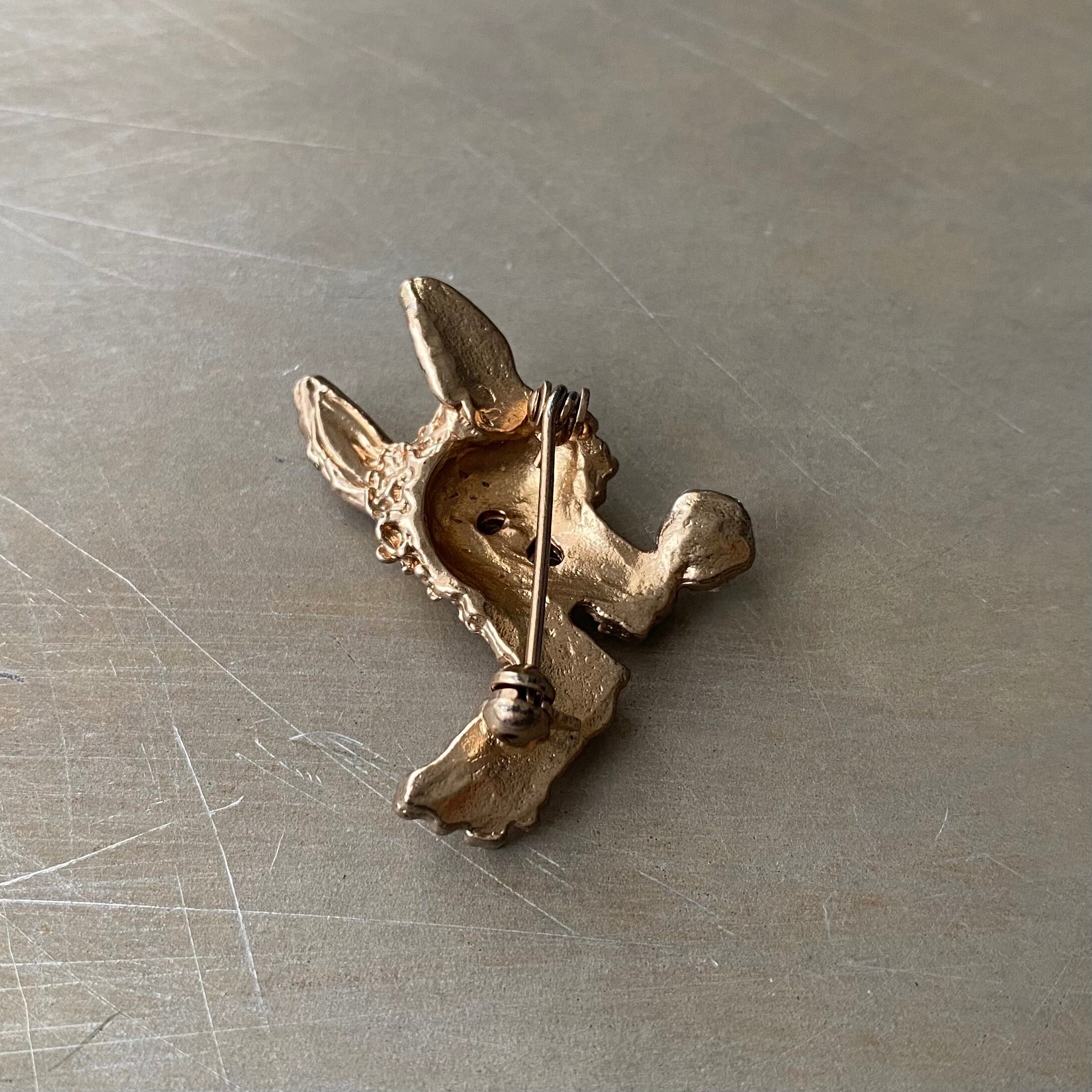 大きな耳とモフモフの毛に包まれたレトロ可愛い動物のヴィンテージブローチ。口にはキラキラ輝くビジューのお花を咥えています。コーディネートに取り入れやすいサイズ感で、ストールやジャケット等のアクセントにおすすめです。