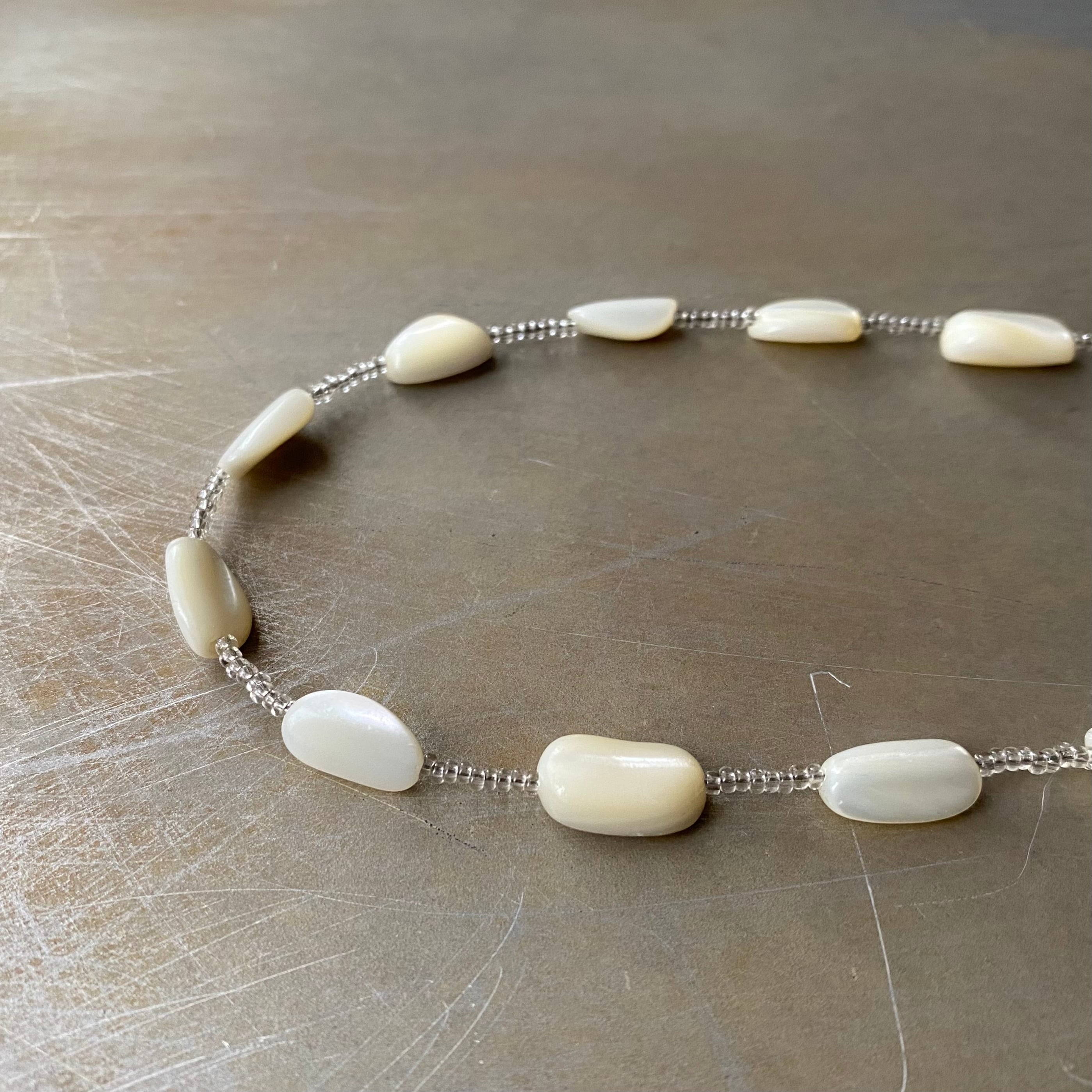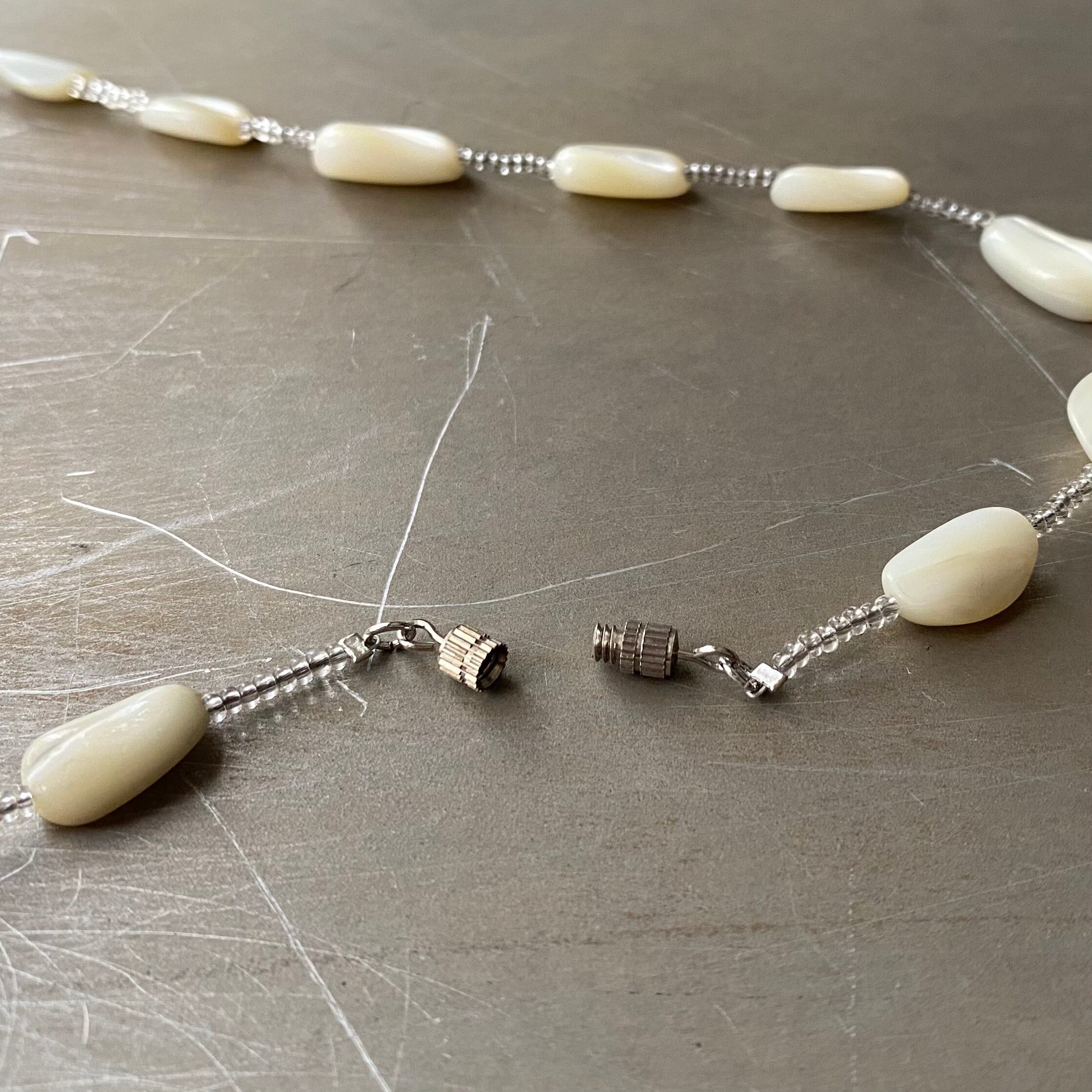 上品な輝きのシェルとガラスビーズがマッチしたクラシカルな雰囲気のヴィンテージネックレス。真珠の母貝である「マザーオブパール」は、持ち主の心を癒しネガティブなエネルギーから守ってくれると言い伝えられています。コーディネートに取り入れやすいデザインでお顔まわりを明るい雰囲気にしてくれます。