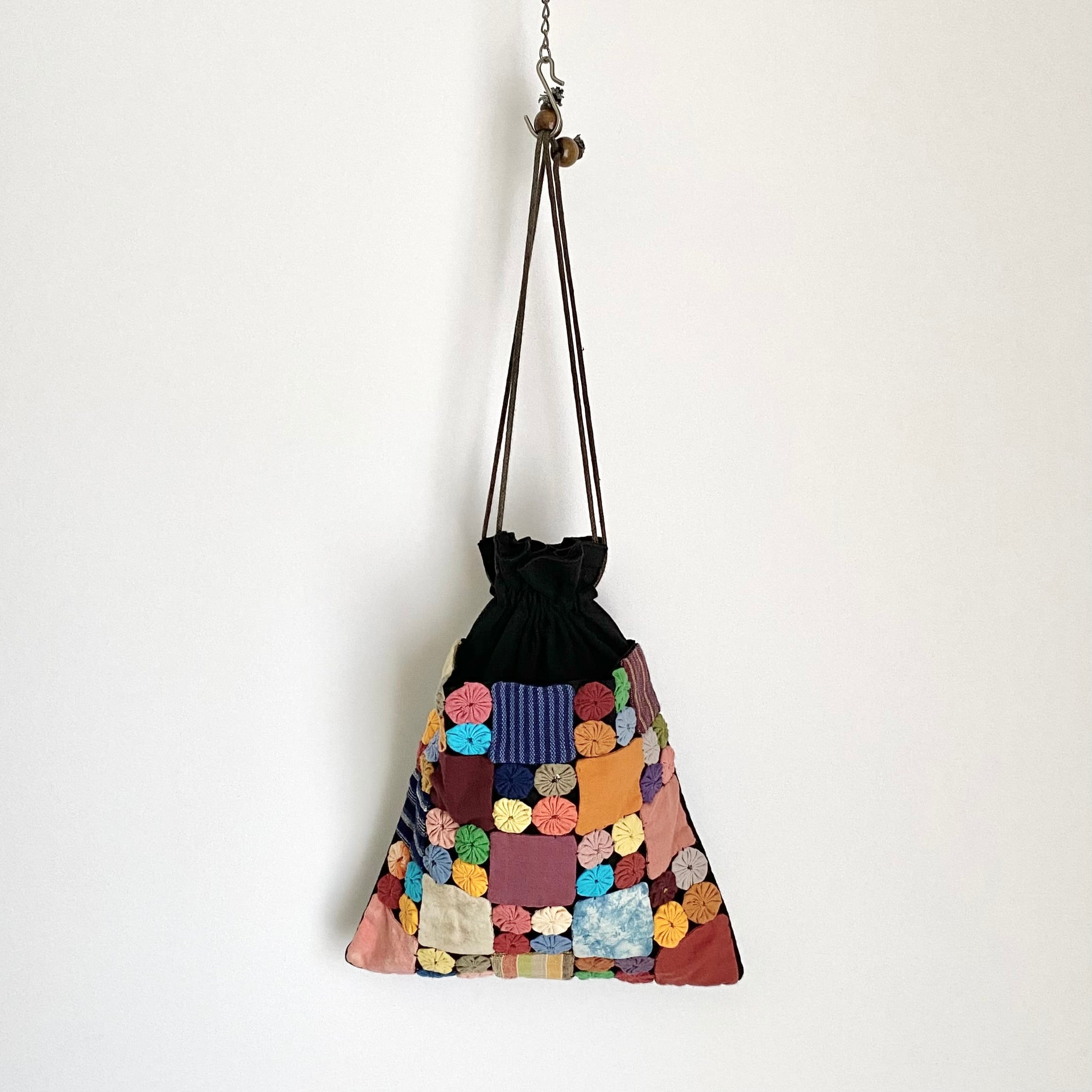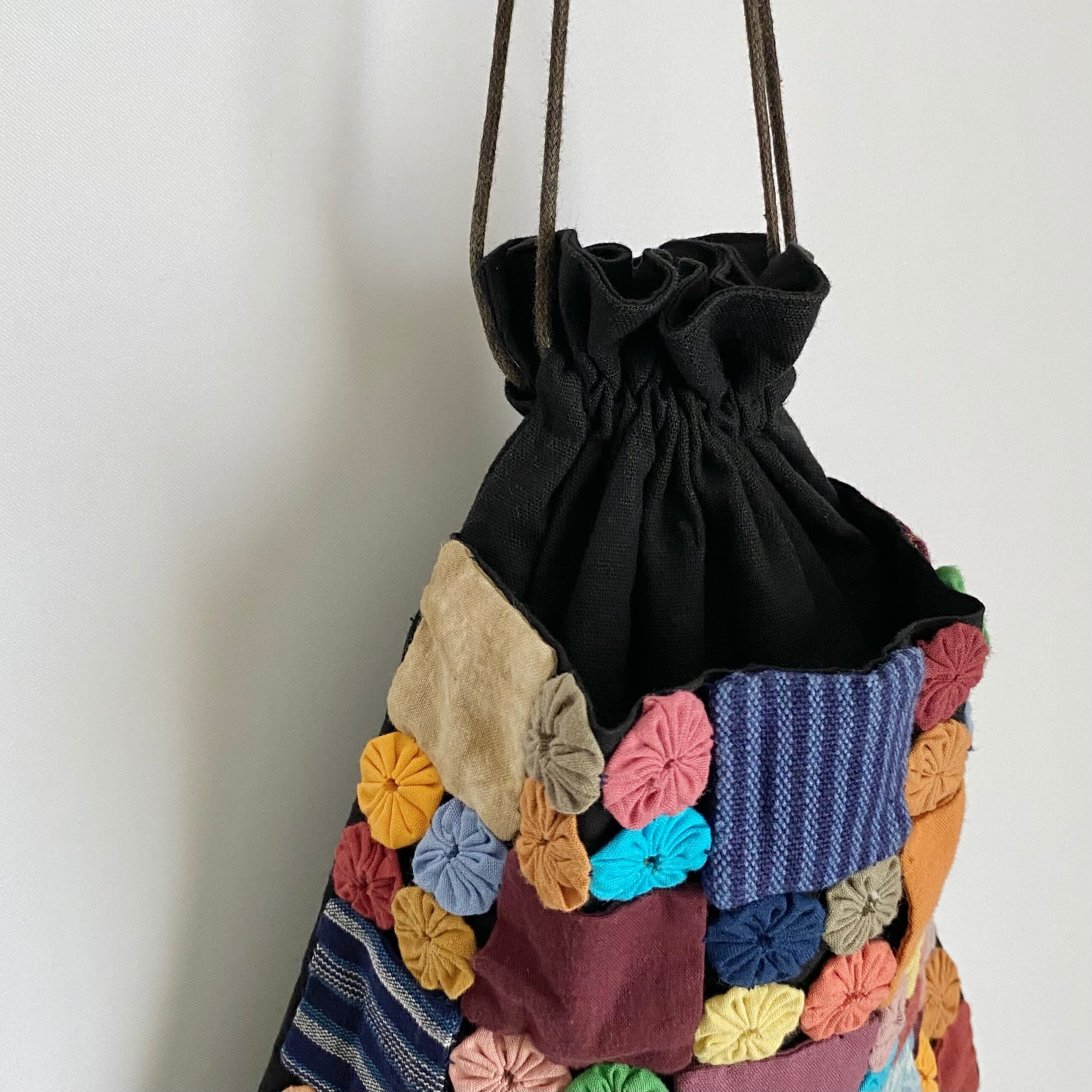 レトロ可愛い巾着バッグ。カラフルな布で作られたお花のような装飾が素敵なデザイン。外側のパッチワーク部分が大きなポケットになっています。お出かけに便利なサイズ感でスタイリングのアクセントにおすすめです。
