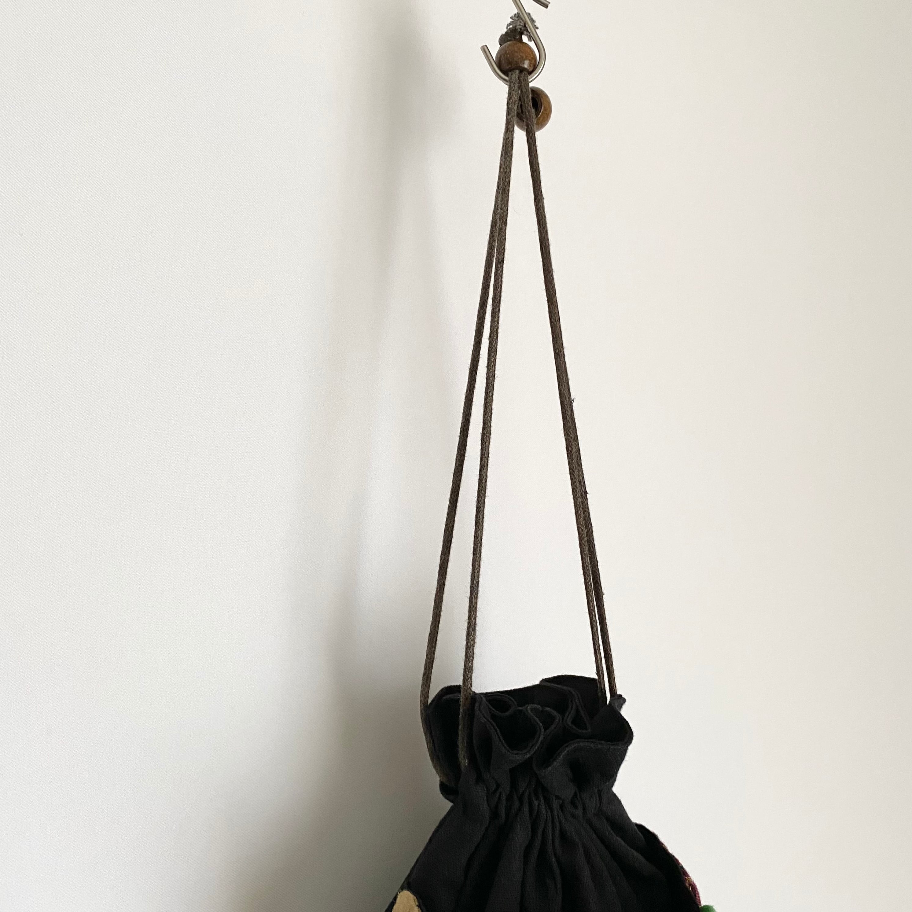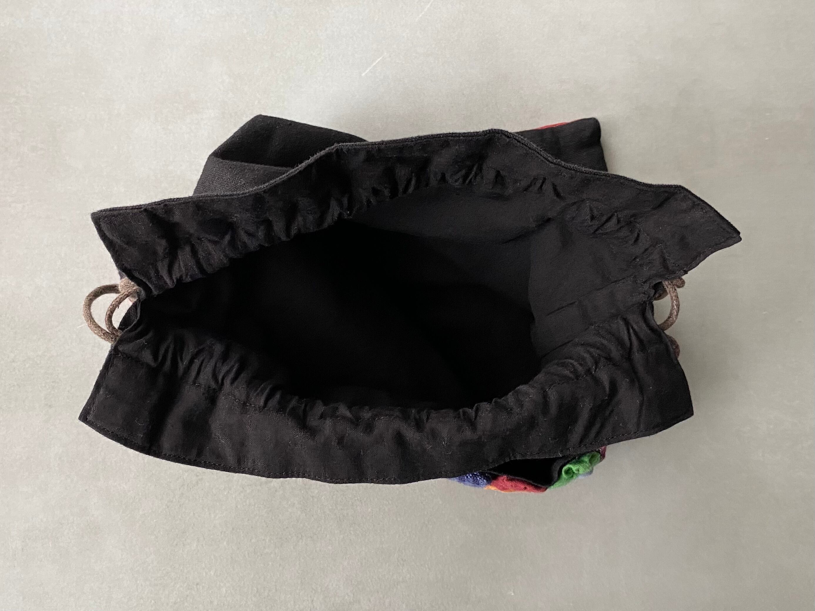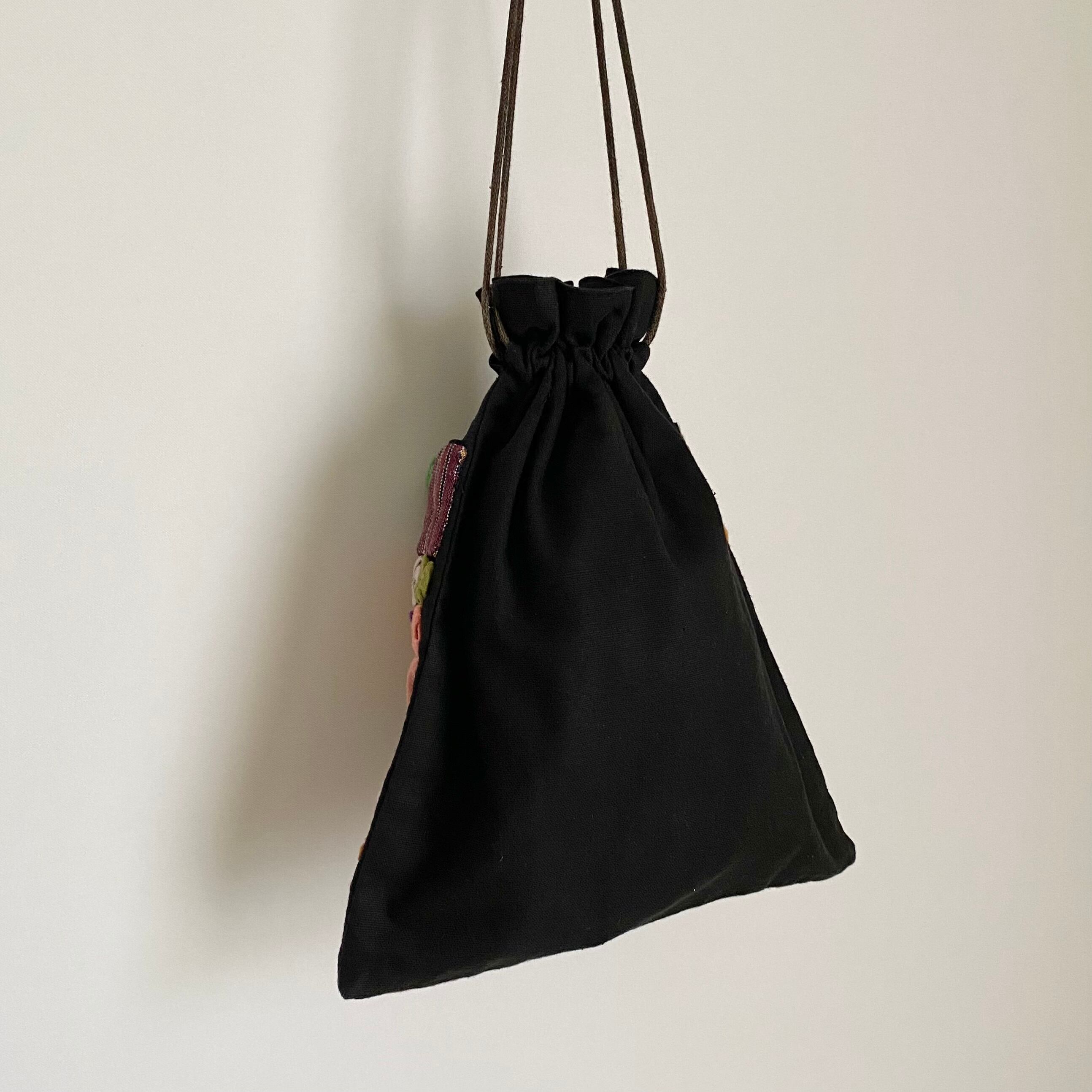 Used retro black×multicolor flower design bag レトロ ユーズド ブラック 黒×マルチカラー フラワー デザイン 巾着 バッグ