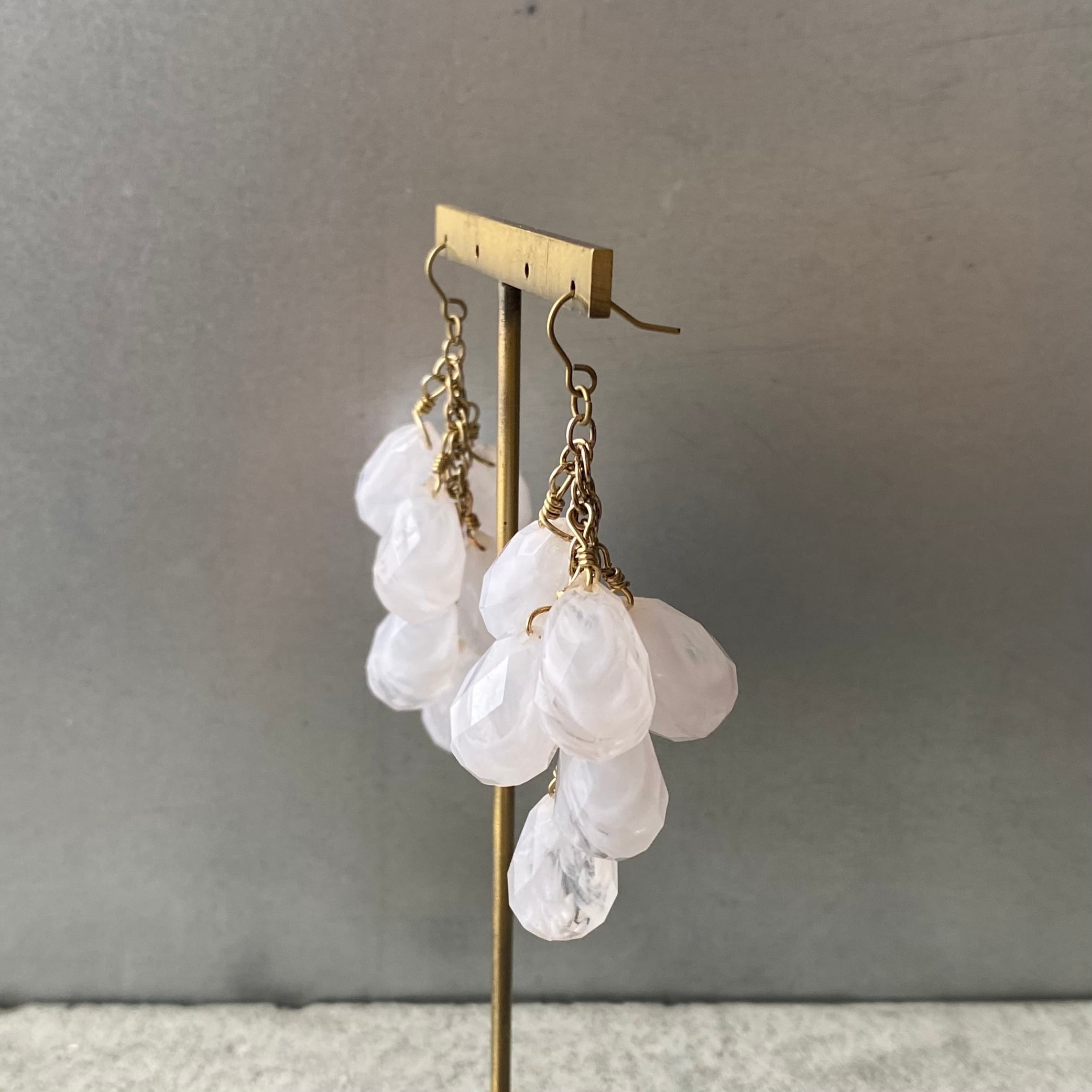 涼しげなマーブル模様のドロップビーズが揺らめくUSAヴィンテージピアス。落ち着いたメタルの色味がクラシカルな雰囲気。ビーズは一つずつシャンク巻きで留められており、繊細かつ大胆なデザインが魅力的です。大ぶりで存在感がありスタイリングのアクセントにおすすめです。