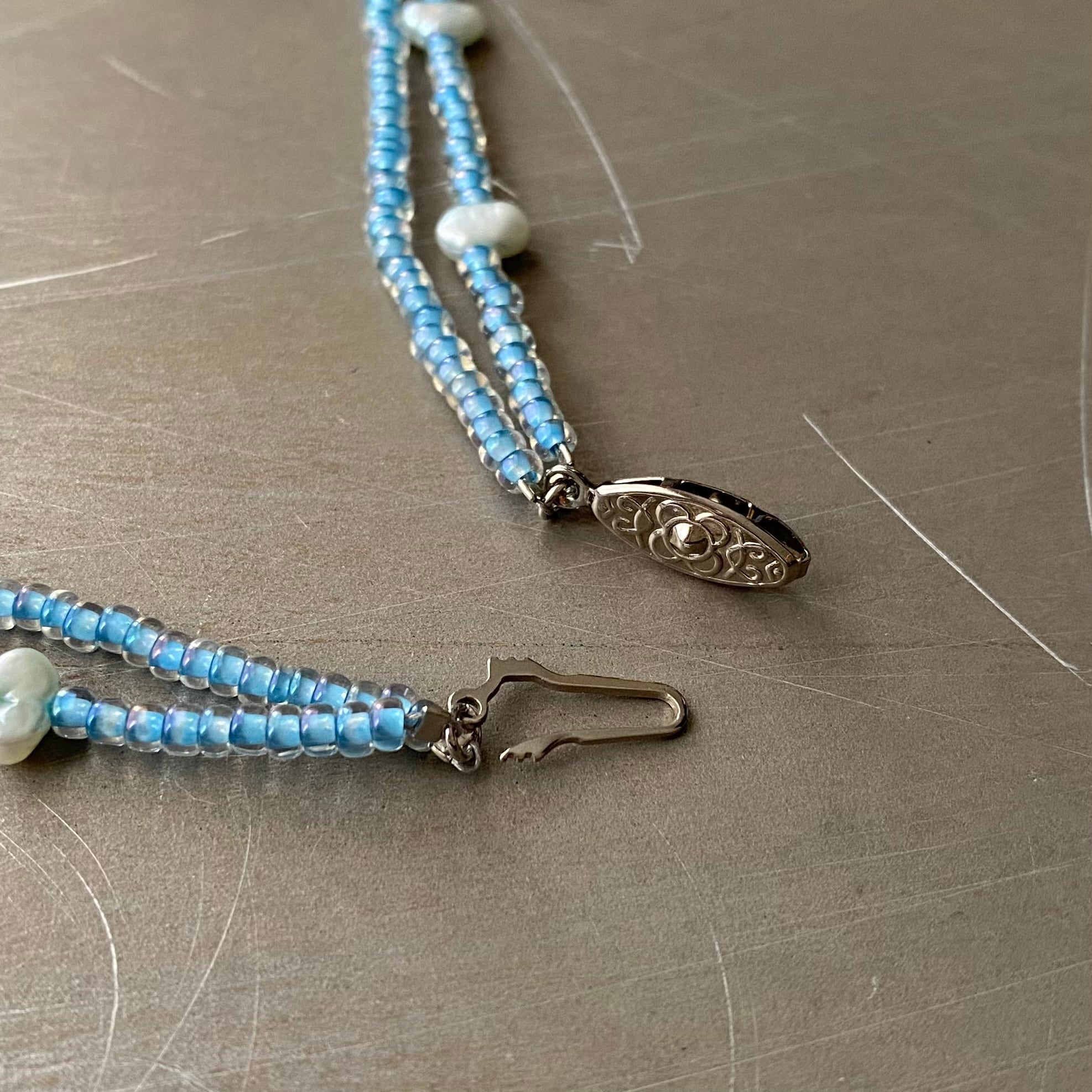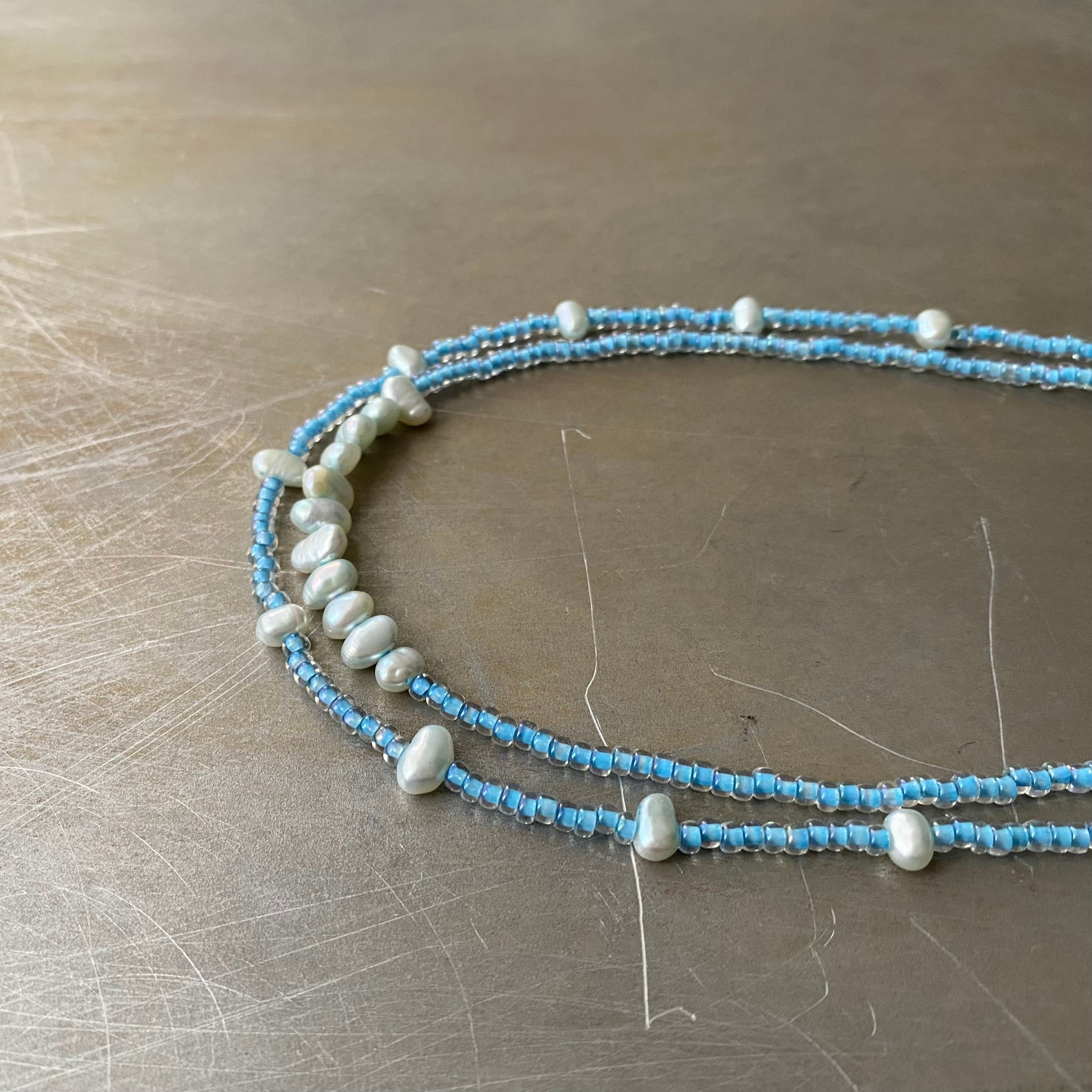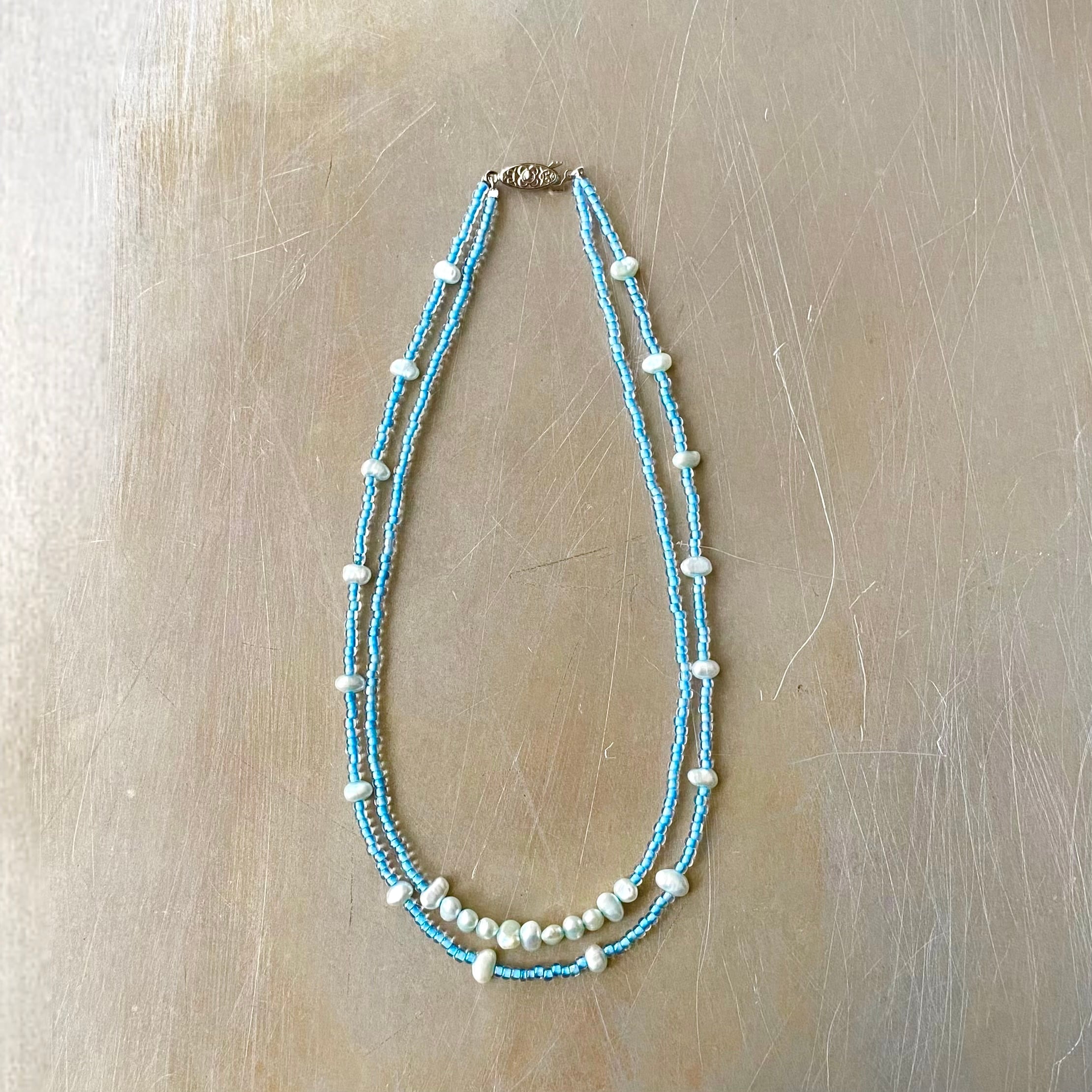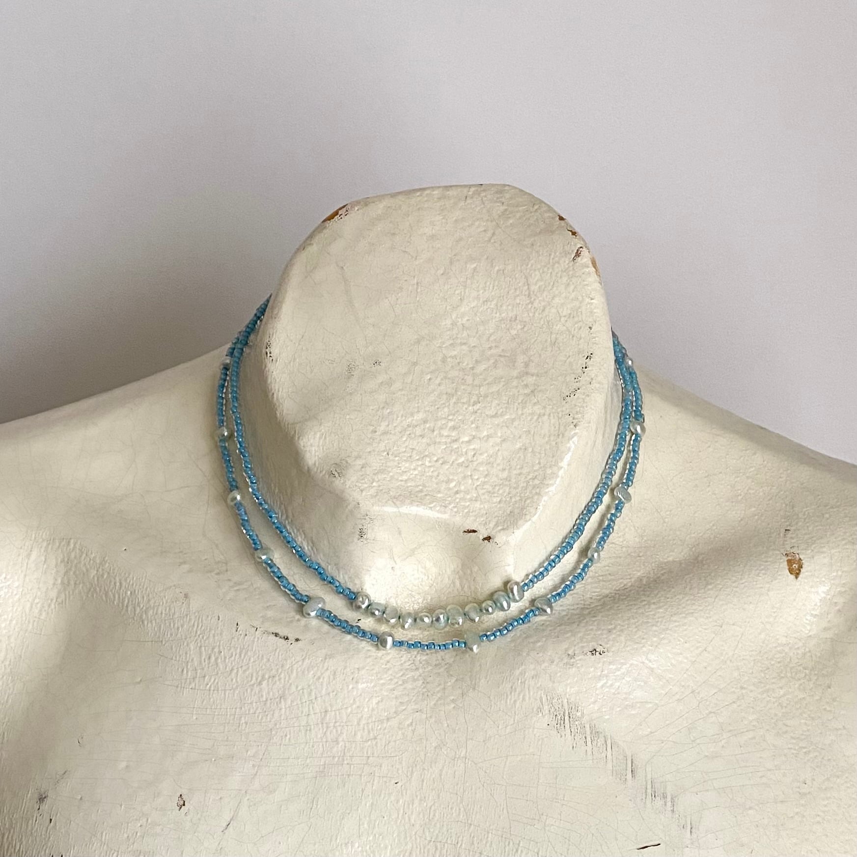 Vintage 90s retro fresh water pearl × blue beads necklace レトロ ヴィンテージ アクセサリー 天然石 淡水パール ブルー ビーズ 2連 ネックレス