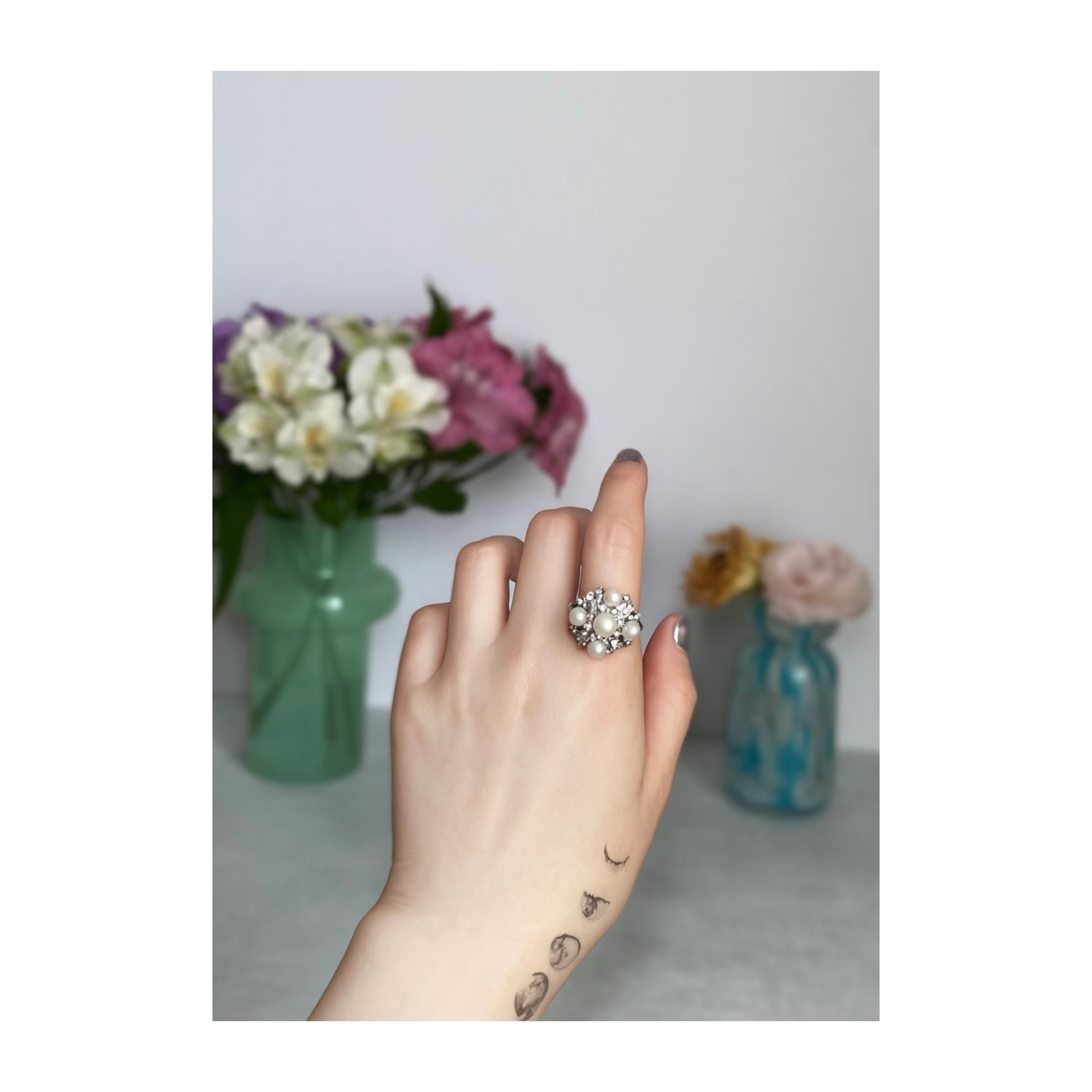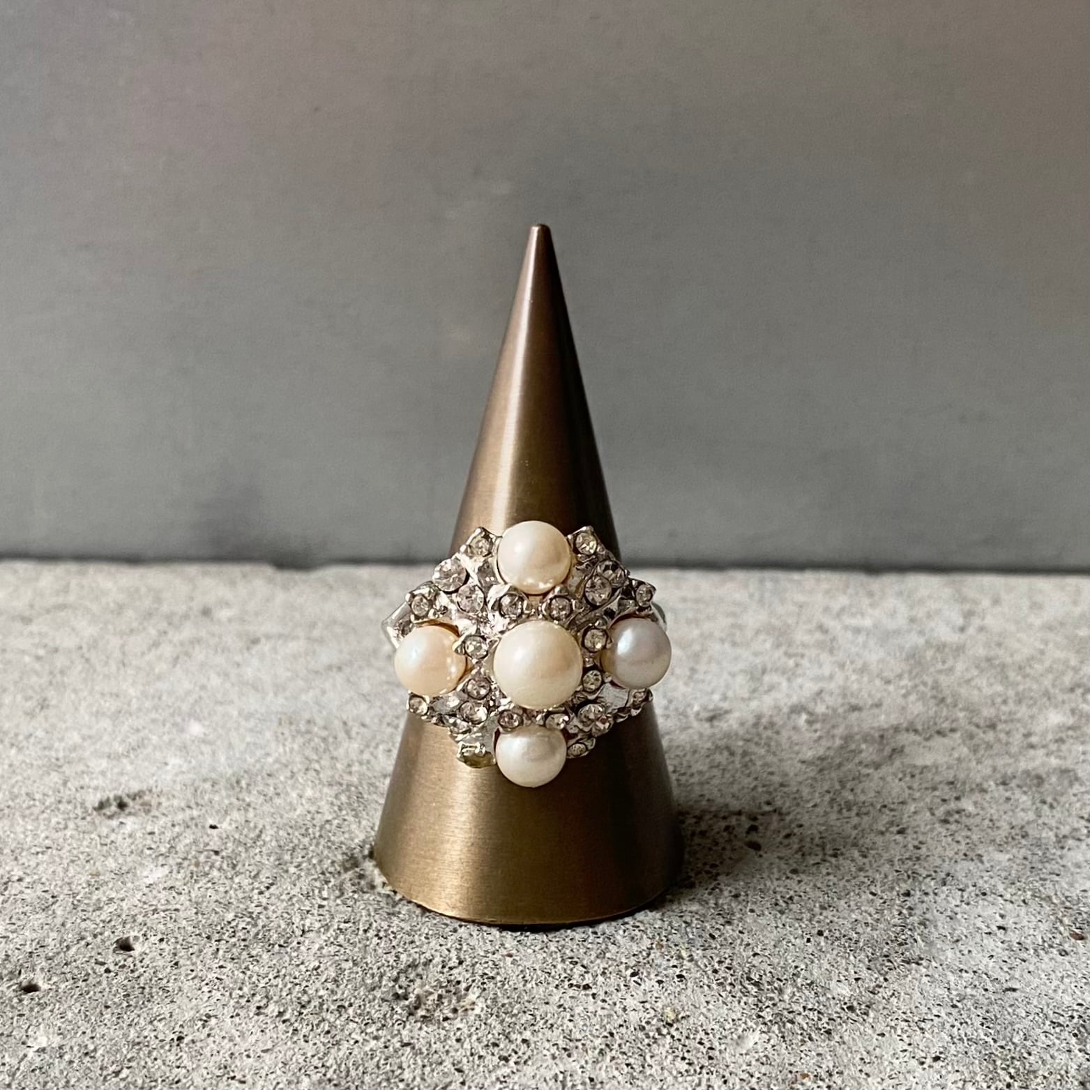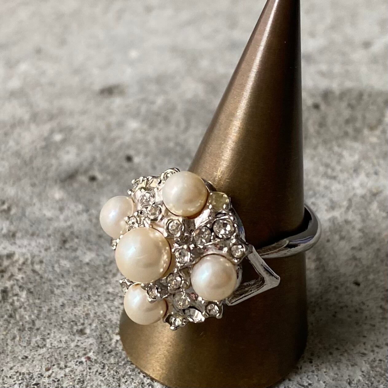 Vintage 80s-90s retro pearl×crystal bijou ring レトロ ヴィンテージ アクセサリー シルバー パール×クリスタル ビジュー リング
