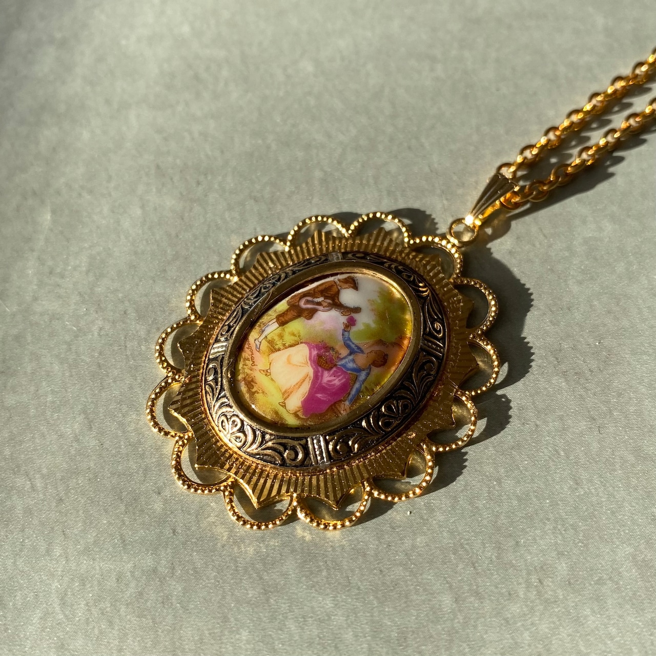 美しい絵柄が魅力的なUSAヴィンテージネックレス。陶器のストーンにはカップルが丁寧に描かれています。クラシカルで繊細なメタル装飾も魅力的。存在感がありスタイリングにエレガントな印象を与えてくれます。