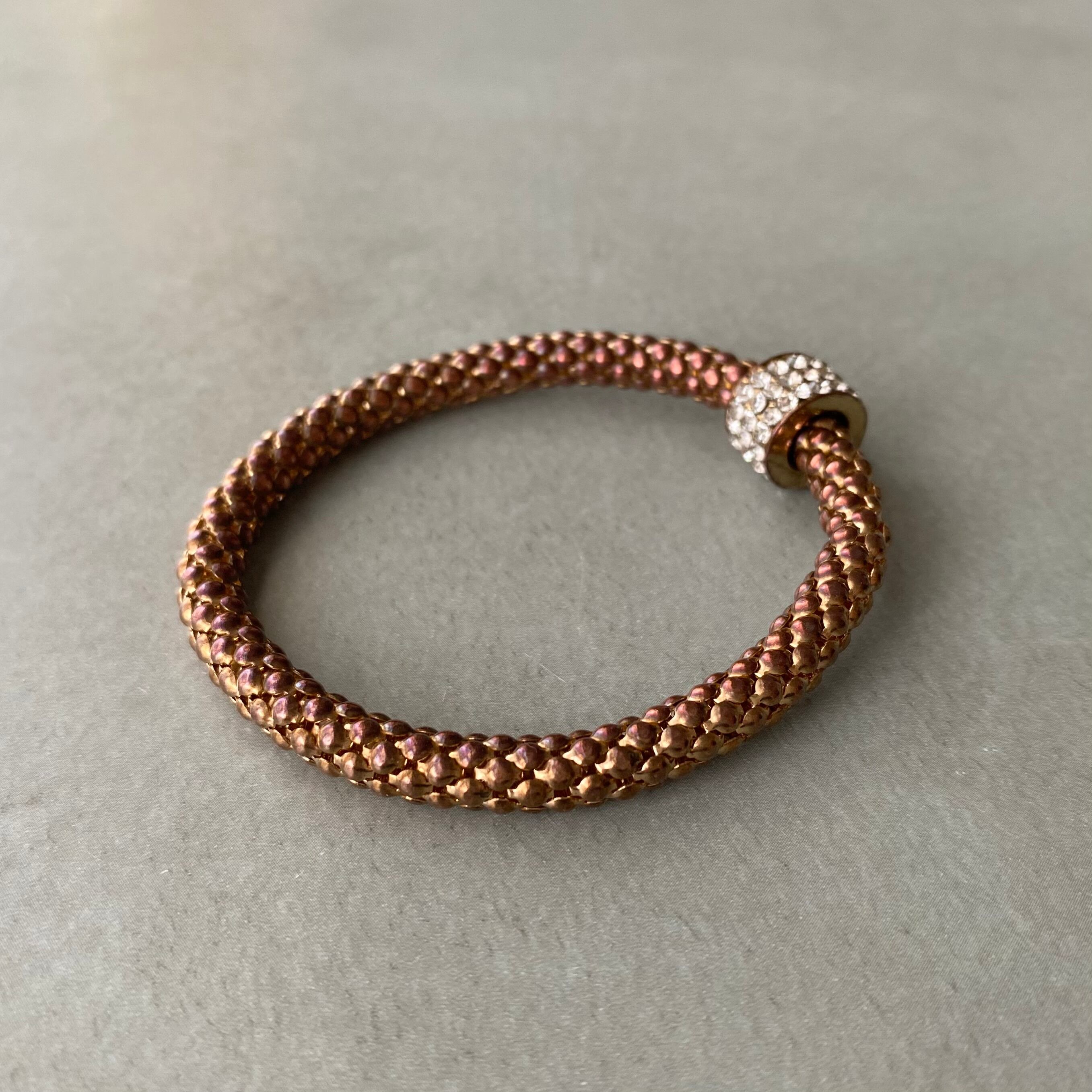 クラシカルな雰囲気のUSAヴィンテージブレスレット。中央のビジューパーツは可動式でキラキラと輝きます。古びたメタルの色合いも良い雰囲気。ストレッチ性のあるゆったりとした着け心地です。シンプルながら個性的なデザインで様々なスタイルに合わせて頂けます。